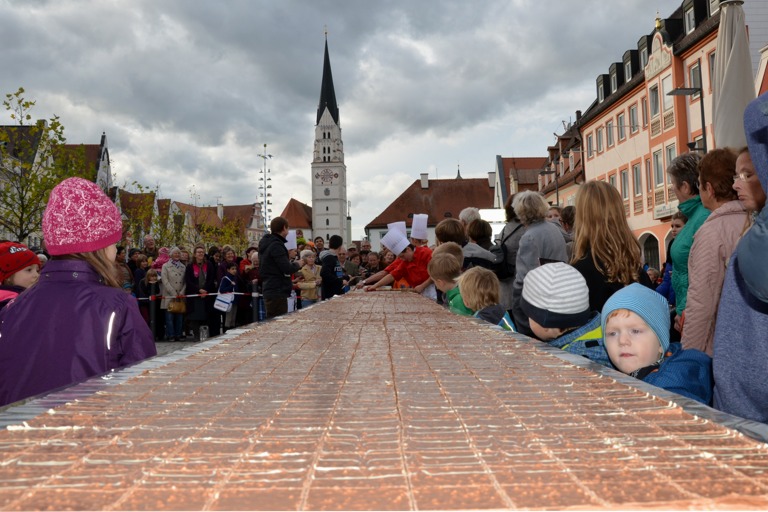 Das war vermutlich die süßeste Versuchung, seit es Pfaffenhofen gibt: Hans Hipp und sein Team haben heute Nachmittag vor dem traditionsreichen Café auf dem Hauptplatz eine zwölf Meter lange Schokoladentafel gegossen und anschließend an die Zuschauer verteilt. Mehrere hundert Leute verfolgten das Spektakel und durften anschließend zur Belohnung fürs Warten das eine oder andere Stück probieren.