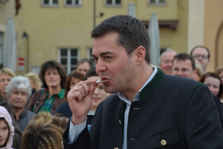 So aber hatte dann doch jeder einmal die Gelegenheit, sich nach vorne an die durch ein Flatterband abgesperrte Outdoor-Schokoladen-Manufaktur heranzupirschen und das Treiben genauer zu Betrachten. Den besten Platz hatte indes Bürgermeister Thomas Herker (SPD), der am Ende auch, begleitet von einem „Hipp, Hipp, Hurra“, die Riesentafel an einer Stelle symbolisch zerbrechen durfte – und auch beim Probieren vor dabei war. Dabei gab Herker auch zu, eigentlich kein Schokoladen-Fan zu sein, um sich aber umgehend nach einem Geschmackstest zu revidieren und festzustellen, dass er danach durchaus süchtig werden könnte.