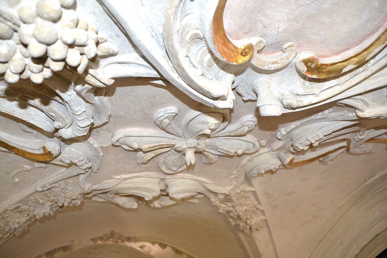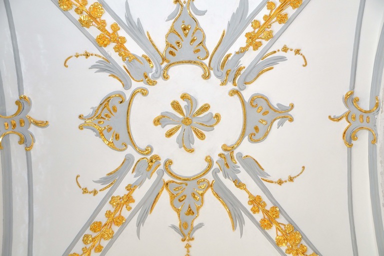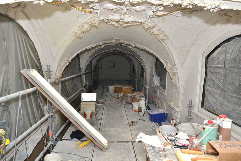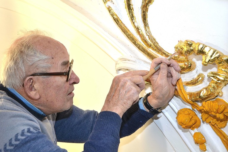 Das größte Problem stelle der Stuck dar, denn er droht nach Jahrzehnten von der Decke zu fallen. Zunächst sind die Kunstwerke deshalb zu festigen, danach werden die alten Anstriche aus den 1970er Jahren entfernt und alsdann auf die ursprüngliche Fassung aus dem Jahr 1770 zurückgegriffen und an den entsprechenden Stellen ein neuer 23,25-Karat-Blattgoldbelag aufgetragen. Die kleinen Kartons mit den hauchdünnen Blättern kosten jeweils bis zu 400 Euro – je nach aktuellem Goldpreis. Einschießen nennt der Fachmann das Auftragen des Blattgoldes auf einem vorher aufwändig vorbereiteten Untergrund. Nach der Trocknung muss das Meisterwerk dann nur noch mit einem Achatstift poliert werden. Eine Geduldsarbeit.