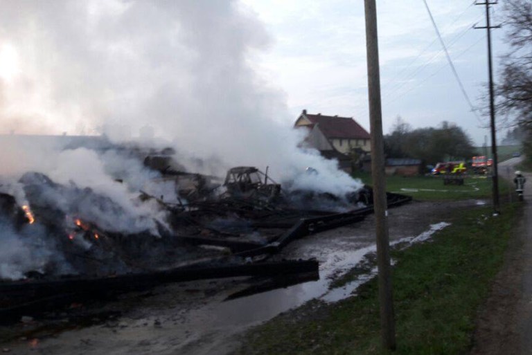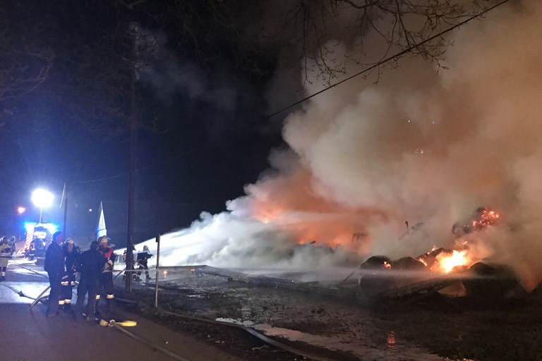 Gegen 2.40 Uhr ging über die Integrierte Leitstelle die Mitteilung über den Scheunenbrand in Asing bei Regenstauf ein. Bei Eintreffen der Einsatz- und Rettungskräfte, war der etwa zwölf auf 30 Meter umfassende Stadel bereits in sich zusammengefallen. In dem Stadel befanden sich neben diversen Landmaschinen auch eine Futtermischanlage und Heu.