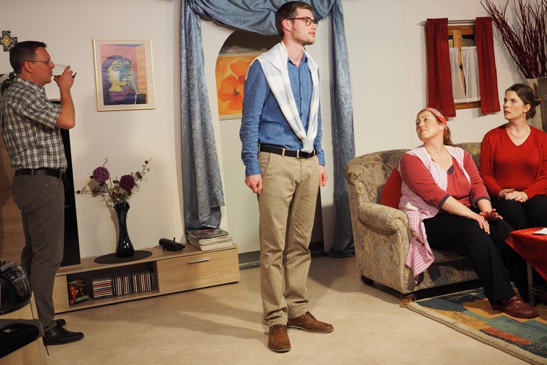 Als sich der Vorhang erstmals öffnete und die Uttenhofener „Haumdaucha“ mit schneidiger Blasmusik den Auftakt zum Theaterabend am Palmsonntag gaben, wurde schon offenbar, dass in der Theatersaison 2017 neue Akzente gesetzt werden: Im Bühnenbild ist die üblicherweise rustikale Bauernstube einem ziemlich modernen und gepflegten Wohnzimmer gewichen, die Stammgäste haben also schon einiges zu bestaunen, bevor die Protagonisten überhaupt auf die Bühne treten.