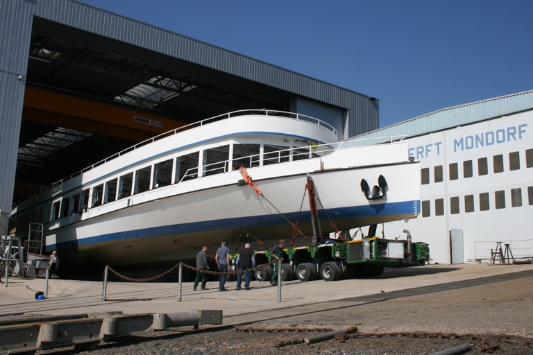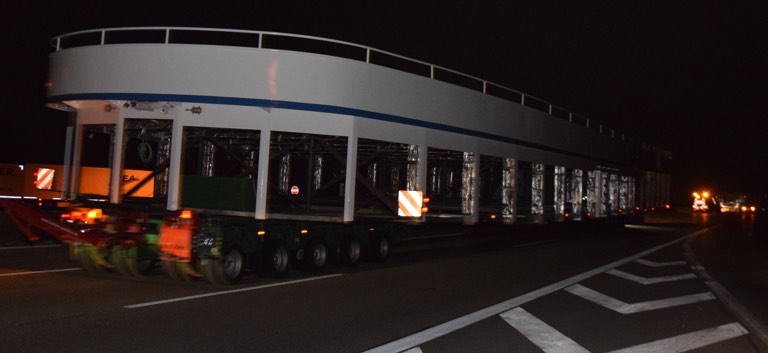 Der Konvoi ist von monströsen Dimensionen: Der 254 Tonnen schwere Transport für den Schiffsrumpf ist insgesamt 68 Meter lang und 9,60 Meter breit; der Schwertransport für den Schiffsaufbau ist 56 Meter lang und 8,90 Meter breit und wiegt 155 Tonnen.
