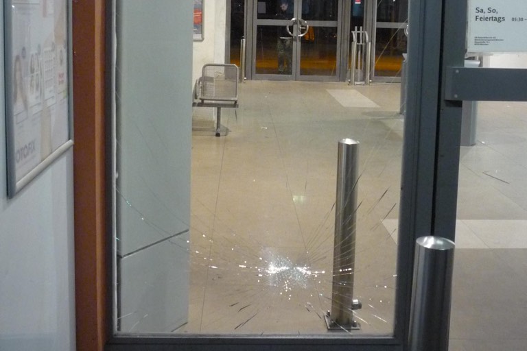 Nach dem brutalen Tritt knallte das Opfer mit dem Kopf gegen die Glastür, die daraufhin splitterte (Foto: Bundespolizei)