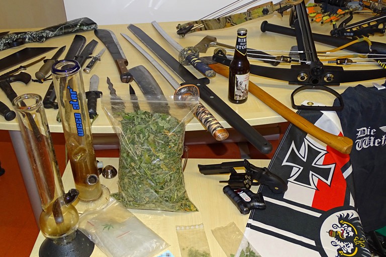 Bei der Durchsuchung wurde nicht nur der gesuchte Revolver sichergestellt, es fand sich ein ganzes Arsenal an Waffen. Die Wohnung war voll von Messern, Dolchen, Schwertern und Macheten, bis hin zu Sportbogen, Armbrüsten, einem Luftgewehr und großen Mengen Pfeilen und Munition. Auch Nazi-Symbole wie eine Reichskriegsflagge, Wehrmacht-Utensilien und eine Bierflasche mit Hitlers Konterfei waren dort gehortet. Im Keller wurden zwei Aufzucht-Anlagen für Marihuana-Pflanzen gefunden; diese waren bereits abgeerntet. Es fand sich aber noch Restmaterial, wie welke Blätter und Stängel, mit einem Gewicht von etwa 220 Gramm.