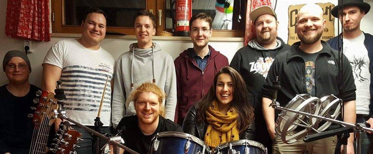 Beide Bands gemeinsam im Proberaum, hier nach getaner Arbeit. Das Ergebnis soll das Highlight des Abends werden.