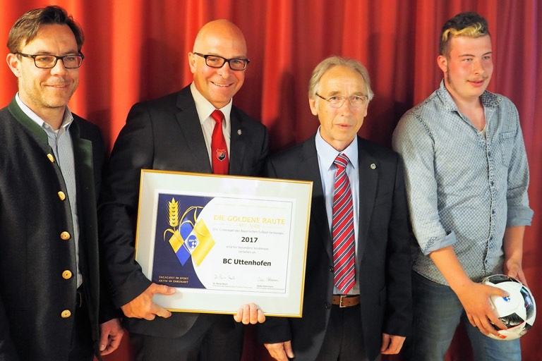 Es sind dabei 40 Kriterien zu erfüllen. Der BCU hatte die „Silberne Raute“ und auch die „Goldene Raute“ in den vergangenen Jahren bereits je zwei Mal erhalten. Die nächste Stufe der BFV-Gütesiegel ist nun die „Goldene Raute mit Ähre“ für insgesamt zehn-jährige Erfüllung der hohen Qualitätskriterien, die unter den 200 Fußballvereinen im Kreis Donau/Isar bisher erst fünf Mal verliehen wurde. Im Landkreises Pfaffenhofen ist der BC Uttenhofen sogar der allererste Verein, der dieses Prädikat erhält.