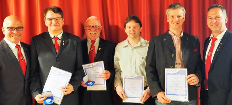 (ind) Im Rahmen der Generalversammlung wurden verdiente Mitglieder und Ehrenamtliche des Ball-Club Uttenhofen mit besonderen Ehrungen des bayerischen Fußball-Verbandes bedacht. Aus den Händen des BCU-Vorsitzenden Wolfgang Inderwies (Foto, von links) erhielten Zweiter Schriftführer Michael Thalmeier und Übungsleiter Hans-Georg Reger die Verbands-Ehrenmedaille in Silber für 30-jähriges ehrenamtliches Wirken als Vereinsfunktionär. Stefan „Starl“ Mayer und Stefan „Stil“ Thalmeier wurden mit dem Verbands-Ehrenzeichen in Silber für 30-jährige Mitgliedschaft ausgezeichnet. Rechts im Bild der Dritte Vorsitzende Stefan Friedl.