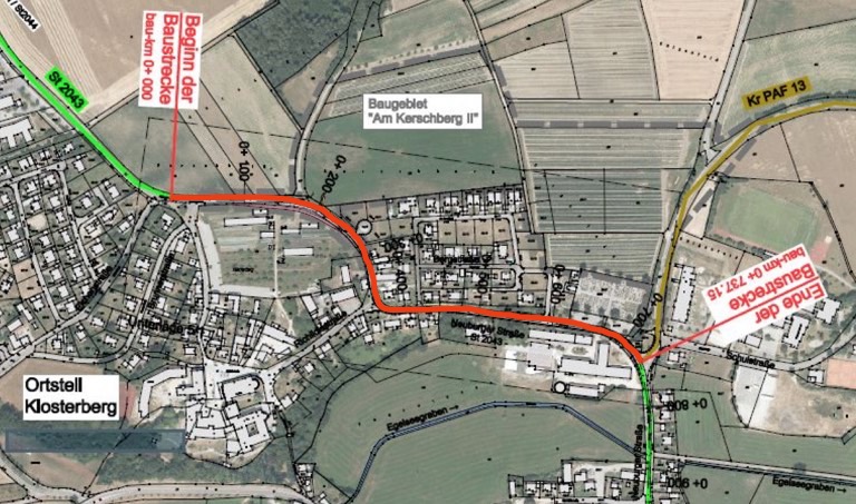 Hintergrund der Maßnahmen: Im Zuge der Anbindung des neuen Baugebiets „Am Kerschberg II“ an die Staatsstraße wird am Ortseingang von Klosterberg die Fahrbahn verbreitert, damit eine Linksabbieger-Spur angelegt werden kann. Außerdem wird in der Neuburger Straße auf einer Länge von etwa 150 Metern ein neuer Regenwasser- und Schmutzwasserkanal verlegt.