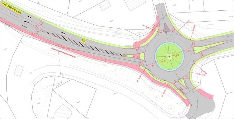 Ab September wird der Kreisverkehr umgestaltet und die B 13 bis zur Landkreis-Grenze saniert. Zudem wird ein Gehweg zum künftigen Supermarkt errichtet.
