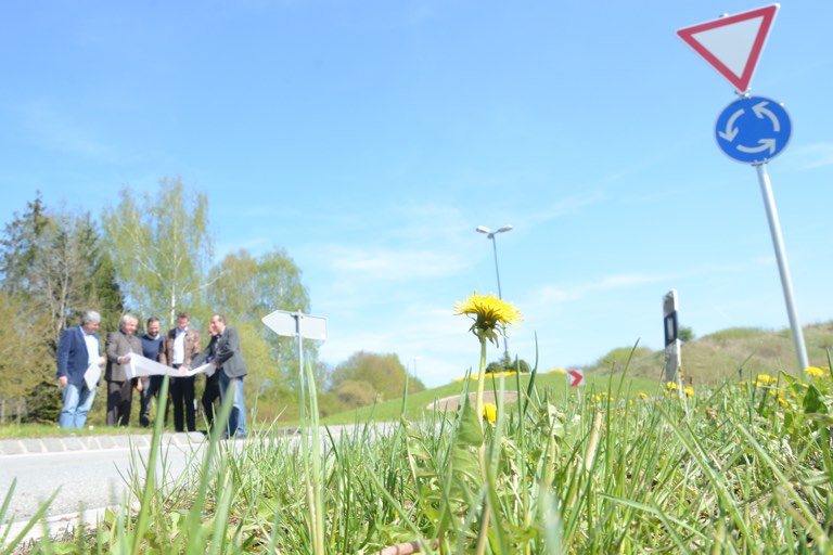 Auch die Sicherheit habe man im Blick, betonten Schönbrodt und Heinrich. Das Überqueren der B 13 wird für Fußgänger und Radler – durch einen größeren Schutzbereich zwischen den beiden Spuren – einfacher und außerdem barrierefrei. Das ist nicht zuletzt deshalb wichtig, weil freilich durch die Errichtung des Supermarkts mit einem steigenden Aufkommen an Fußgängern und Radlern gerechnet wird. Deshalb wird auch ein zwei Meter breiter Gehweg komplett neu errichtet, auf dem man von der Ortsmitte her kommend zum Kreisel gelangt. Um diesen Weg bauen zu können, ist wiederum die Gabionen-Wand nötig. Die soll zugleich einen Lärmschutz-Effekt ausüben.