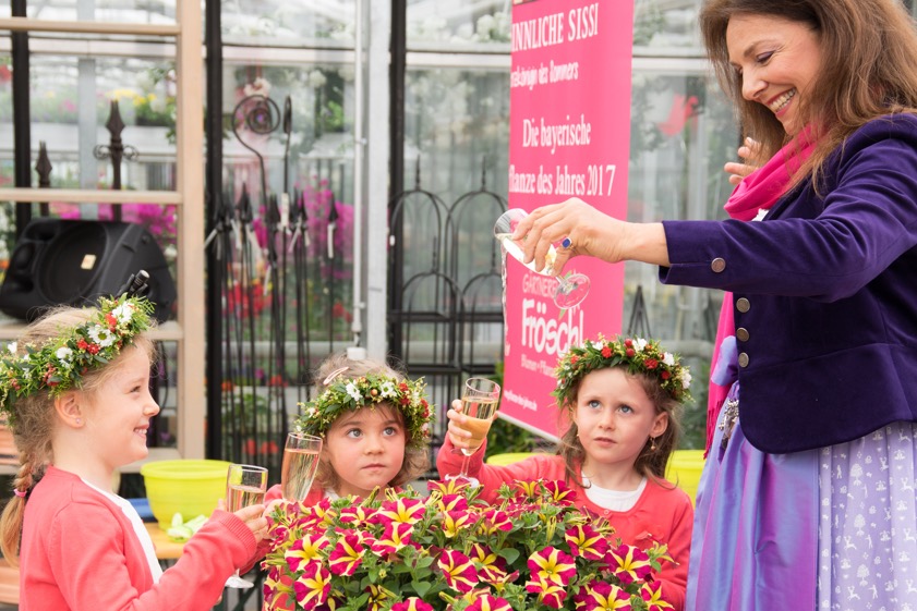 Die Taufpatin zeigte sich hingerissen von den drei kleinen „Prinzessinnen“, von denen sie am Dienstag bei dem symbolischen Akt unterstützt wurde. „Kinder verbindet eine ganz natürliche Liebe zur Natur, die wir uns, wenn wir geschickt sind, auch als Erwachsene erhalten können“, schwärmte Dämmrich von Luttitz, die mit ihrer Sendung „Uschis VIP-Gärten“ regelmäßig in den Gärten Prominenter zuhause ist. Dem Anlass entsprechend wurde die „Sinnliche Sissi“ dann mit Sekt statt Wasser getauft.