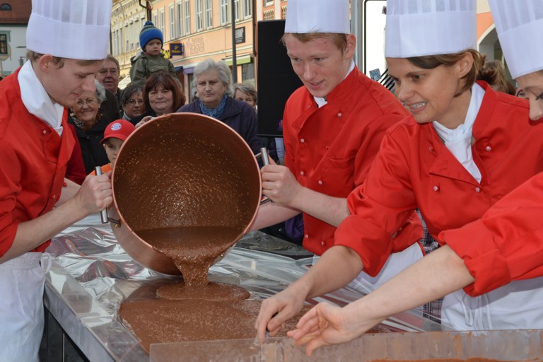 Das war vermutlich die süßeste Versuchung, seit es Pfaffenhofen gibt: Hans Hipp und sein Team haben am Donnerstagnachmittag vor dem traditionsreichen Café auf dem Hauptplatz eine zwölf Meter lange Schokoladentafel gegossen und anschließend an die Zuschauer verteilt. Mehrere hundert Leute verfolgten das Spektakel und durften anschließend zur Belohnung fürs Warten das eine oder andere Stück probieren.