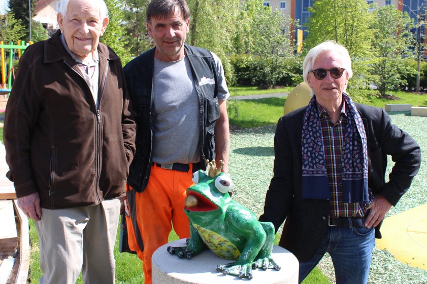 Ehrengast bei der Aufstellung der Märchenfigur war Walter Schütz (92), der den Froschkönig im Jahre 1970 als Brunnenfigur für den Spielplatz an der Ilm gebaut hatte. Als Kfz-Mechaniker im Stadtbauhof hatte er seinerzeit ein Metallgerippe geschweißt und mit Beton ausgegossen. Die Pfaffenhofener Kinder schlossen den grünen Frosch samt Krone und goldener Kugel sofort in ihr Herz.