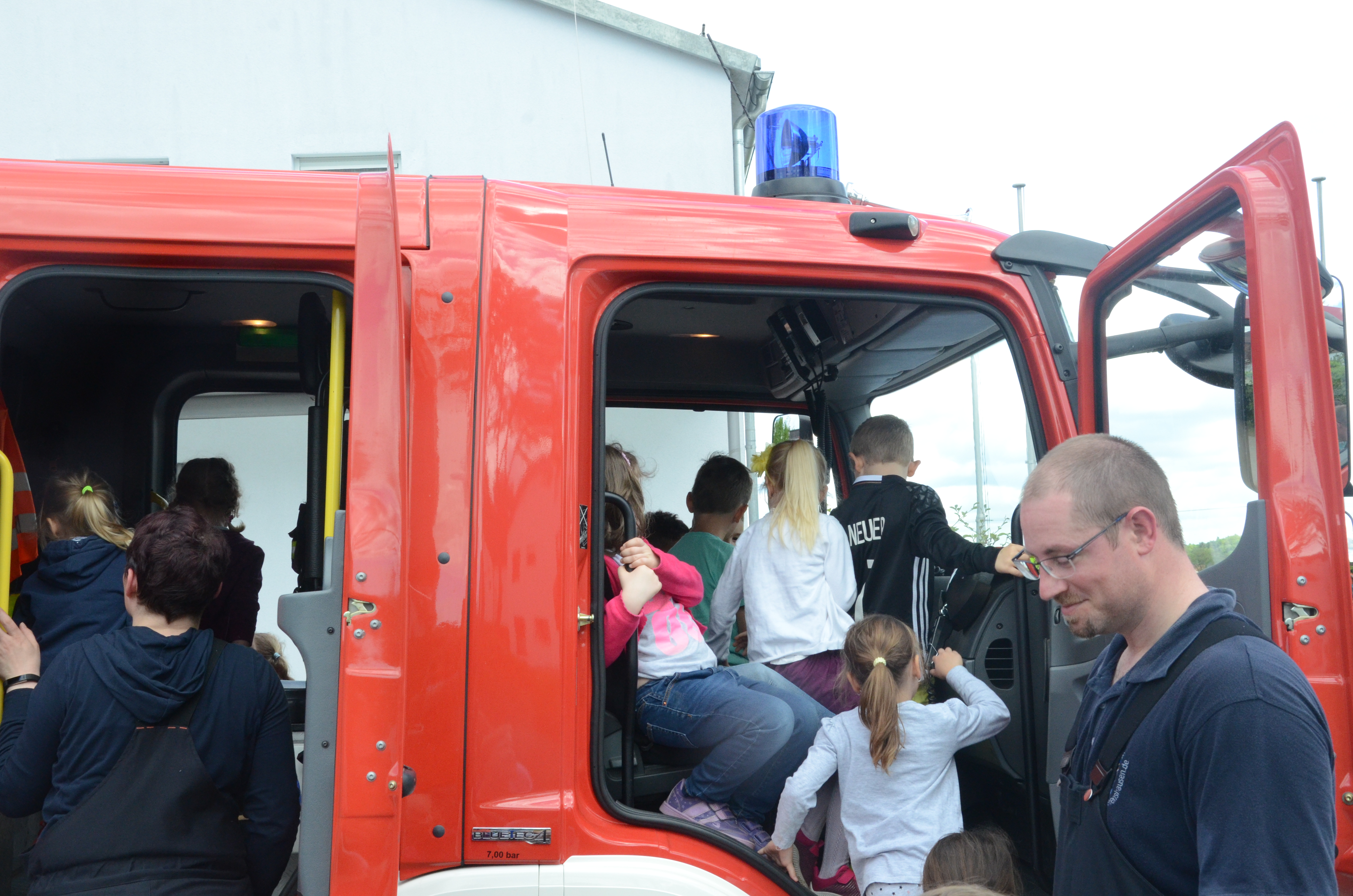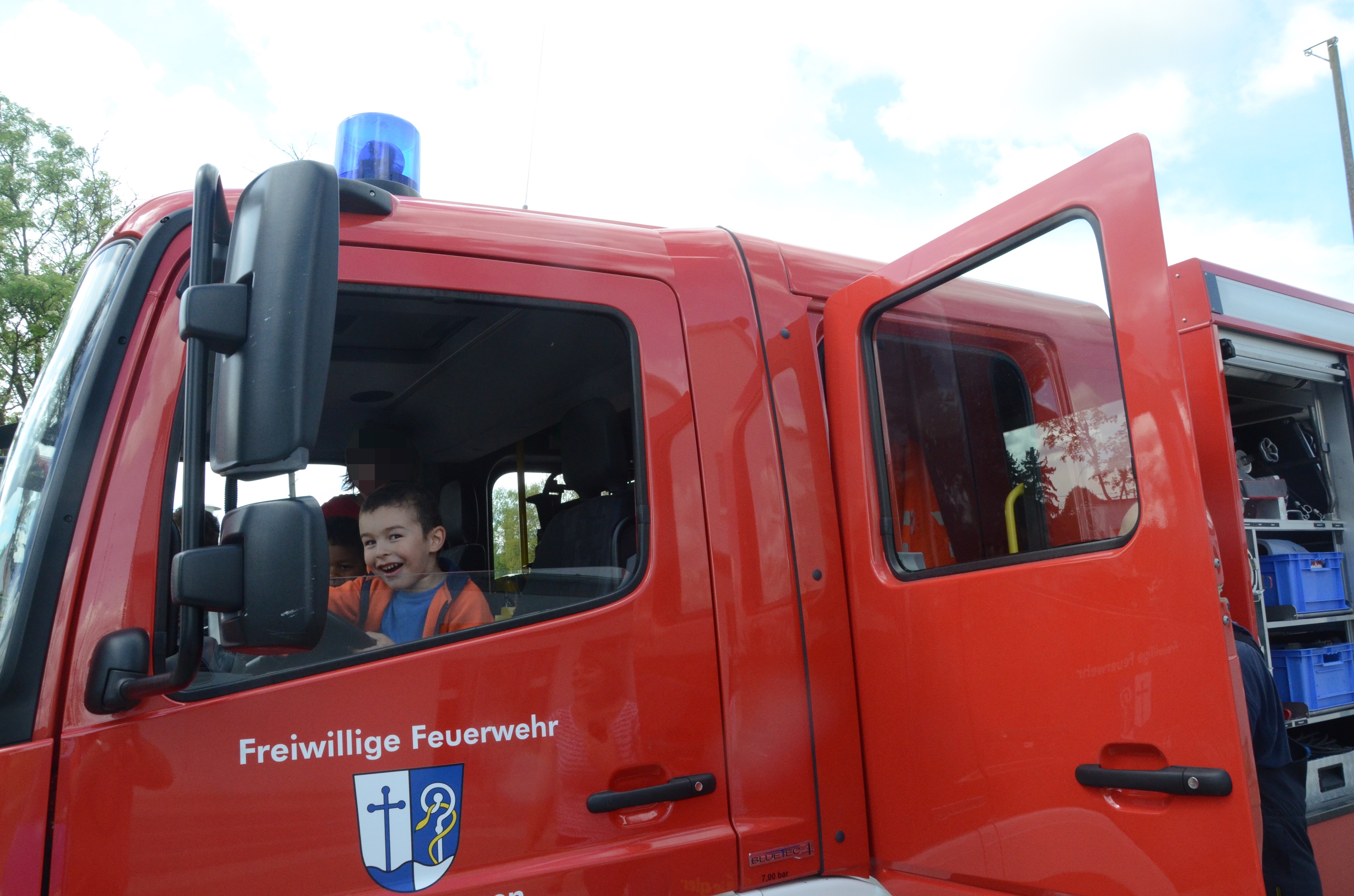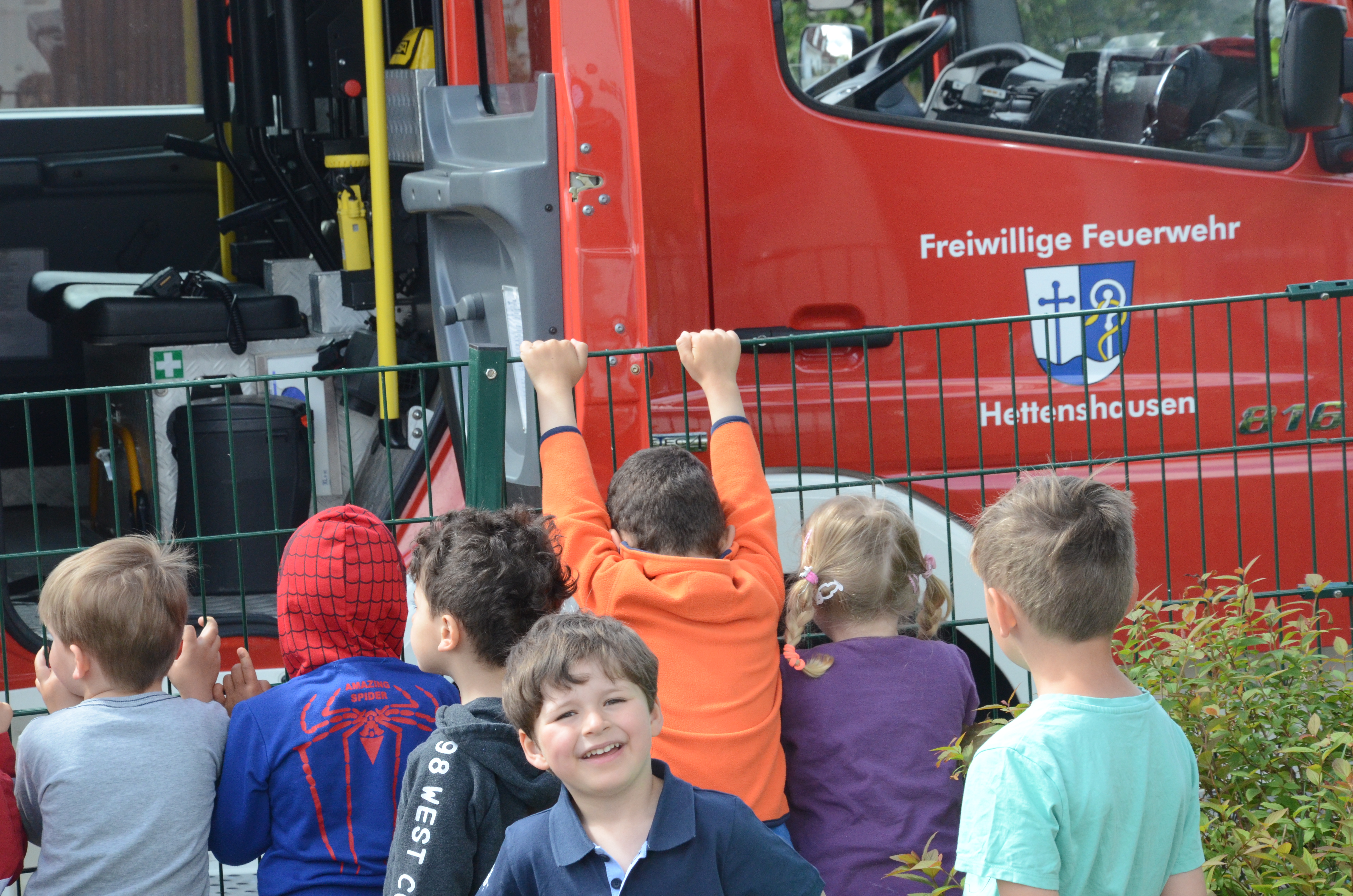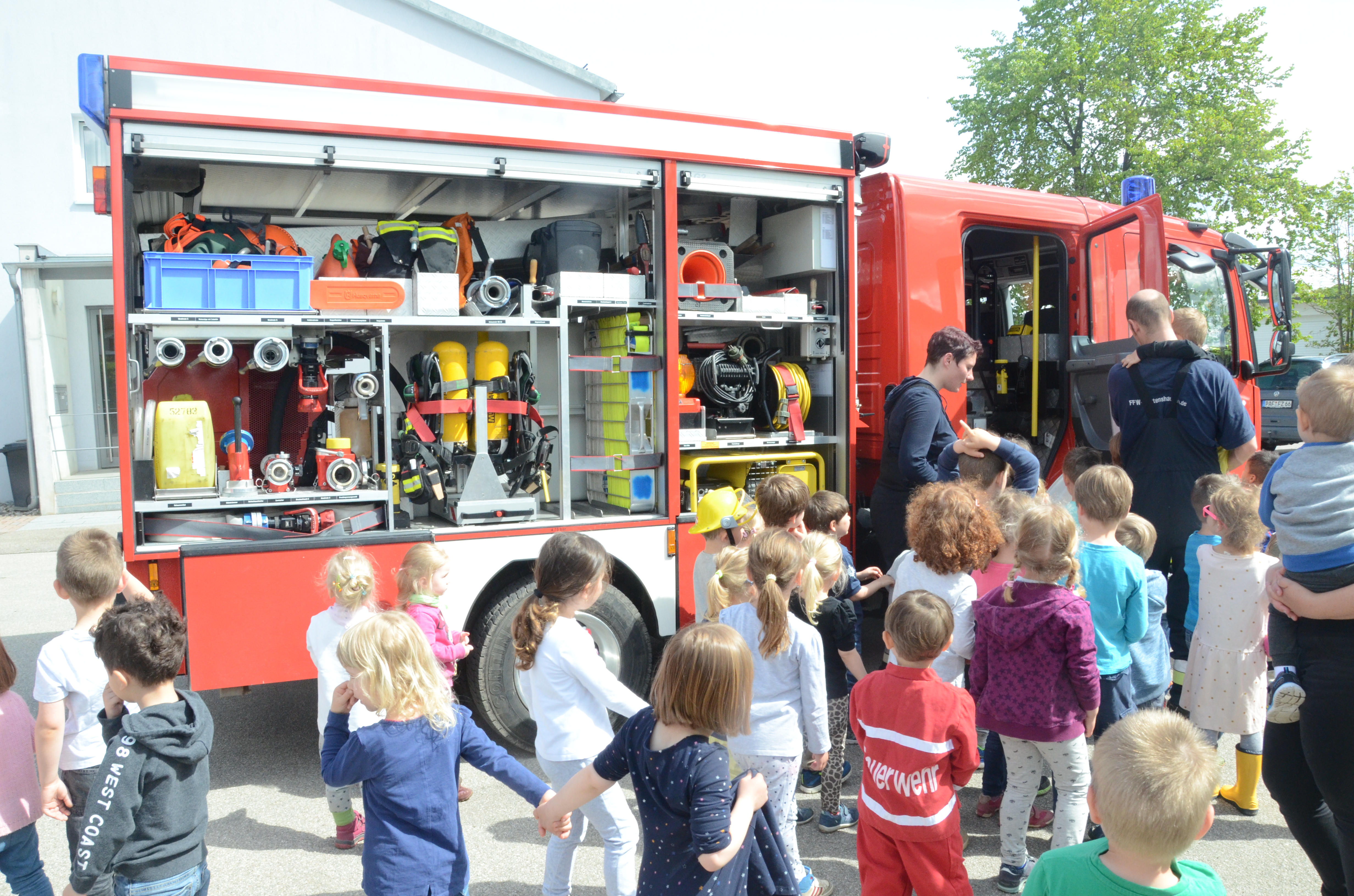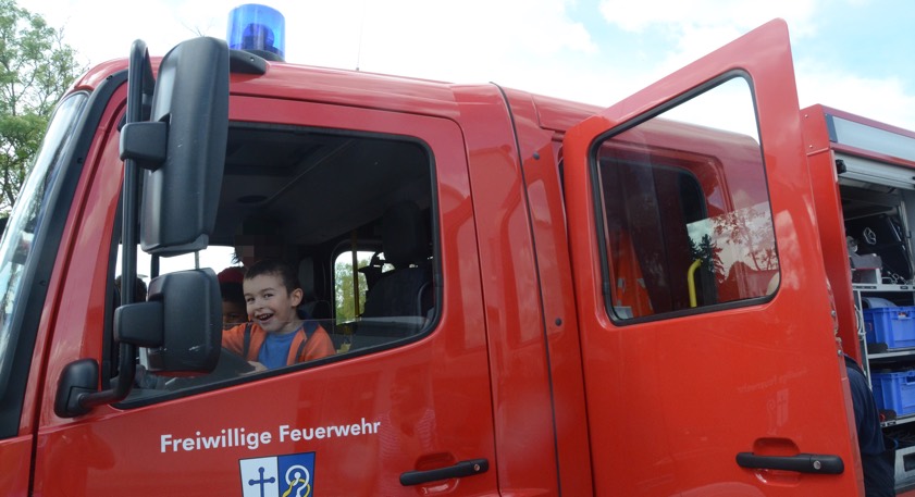 Im Anschluss stand dann im Feuerwehrhaus, das ja nur ein paar Meter entfernt liegt, gleich noch ein Ortstermin für die Buben und Mädchen an. Hier konnten sie sich das Feuerwehr-Auto mal aus nächster Nähe anschauen und sogar hinterm Lenkrad Platz nehmen. Man kann schon sagen: Die meisten waren Feuer und Flamme.