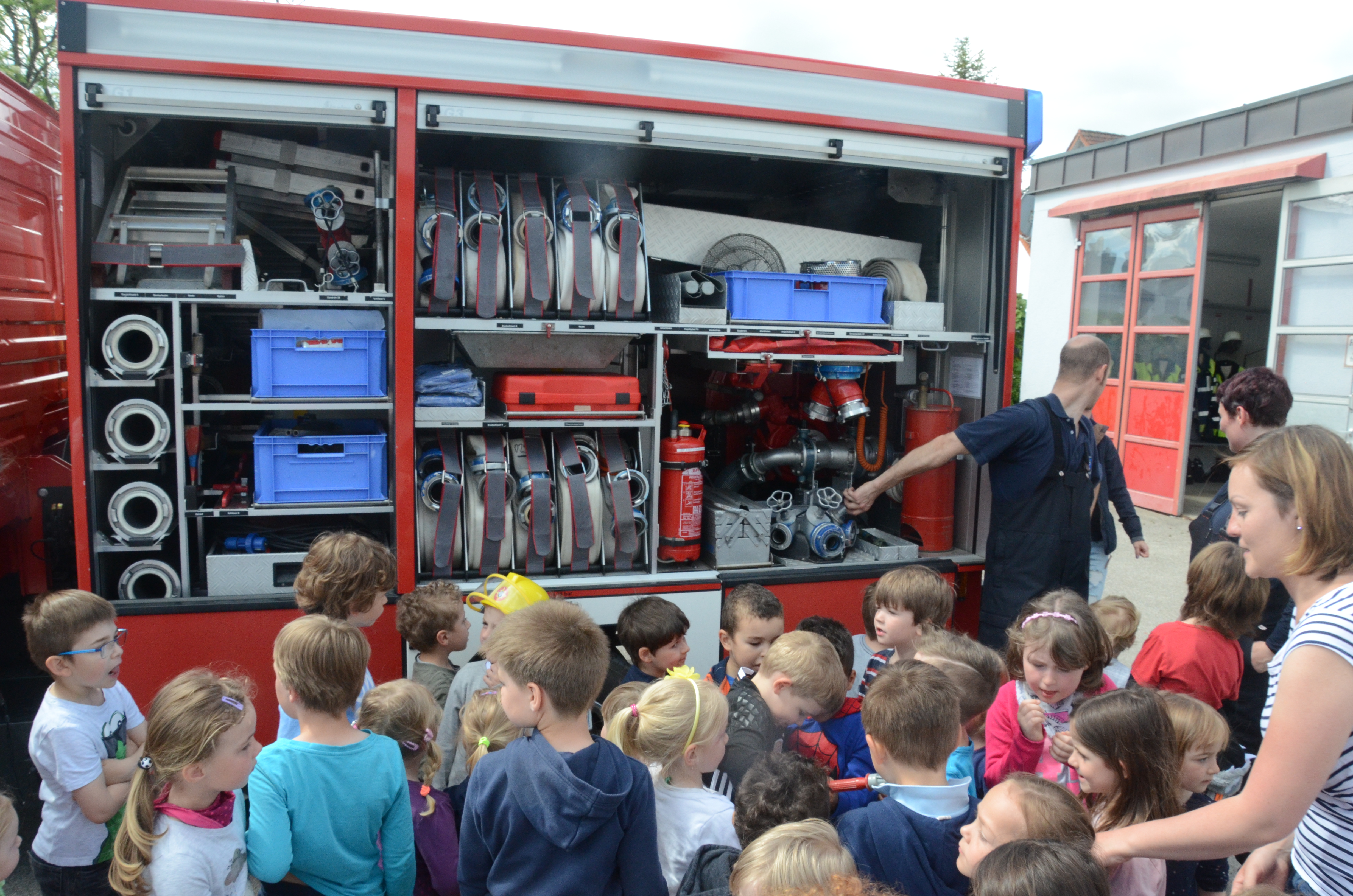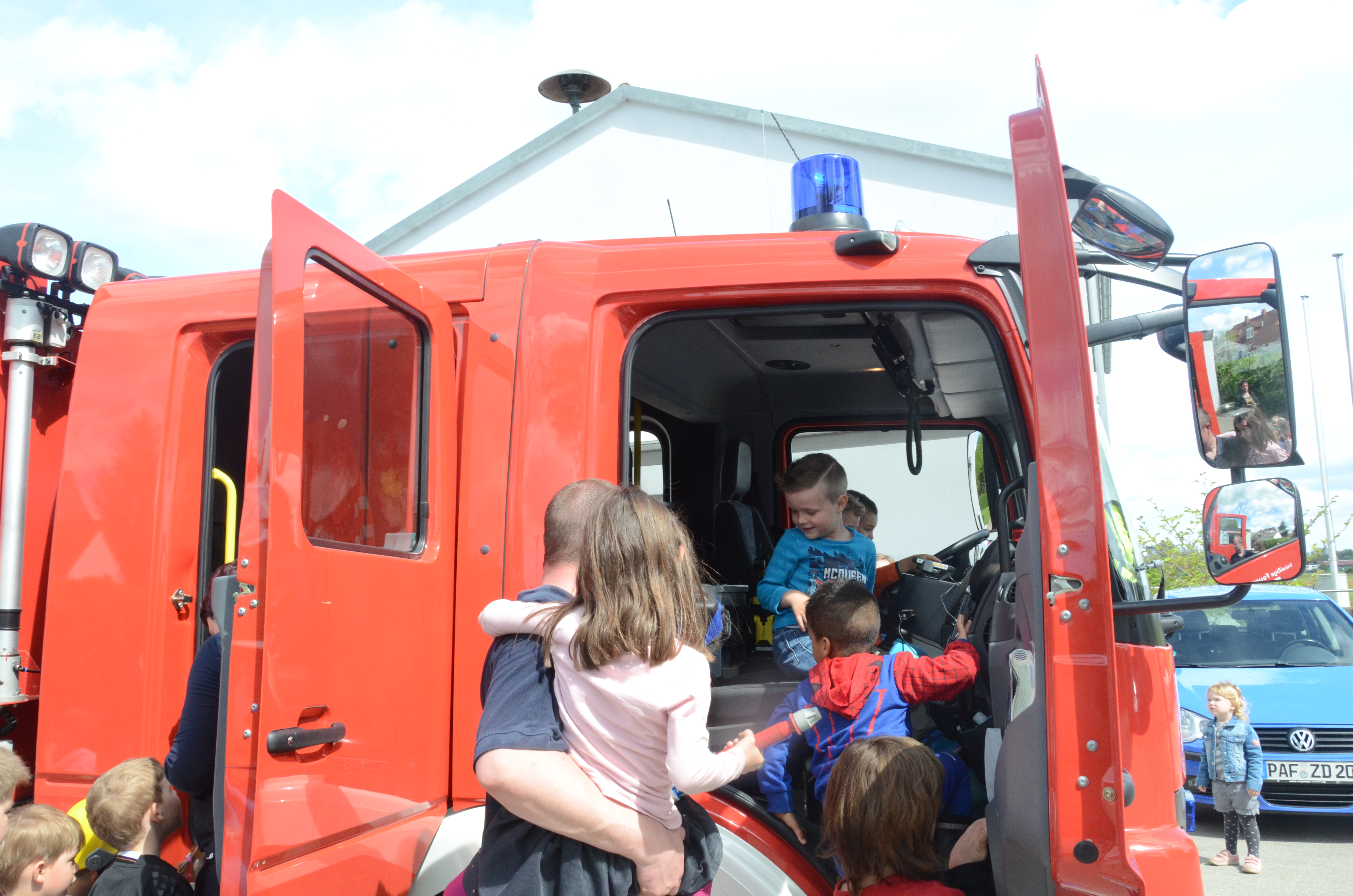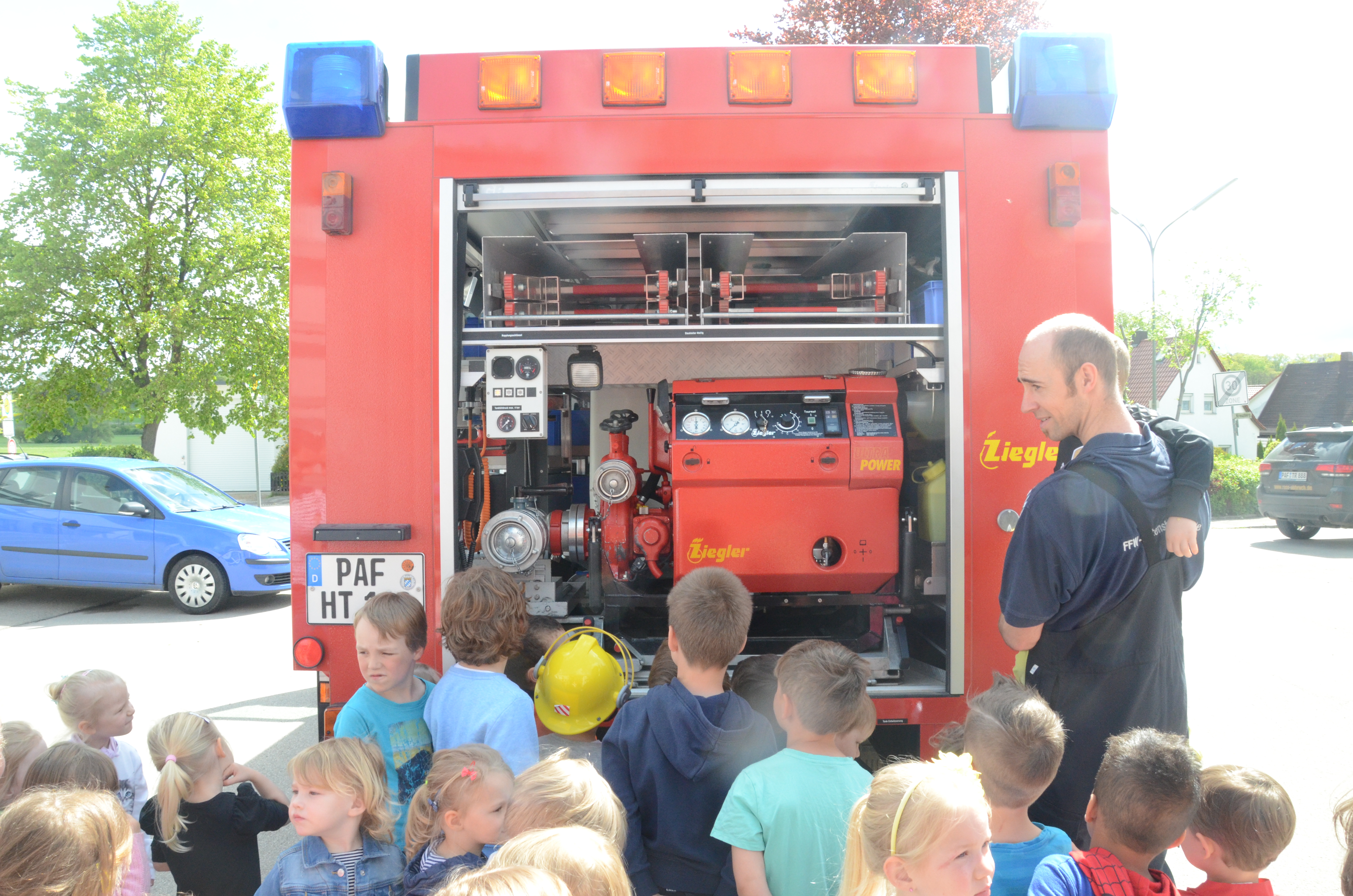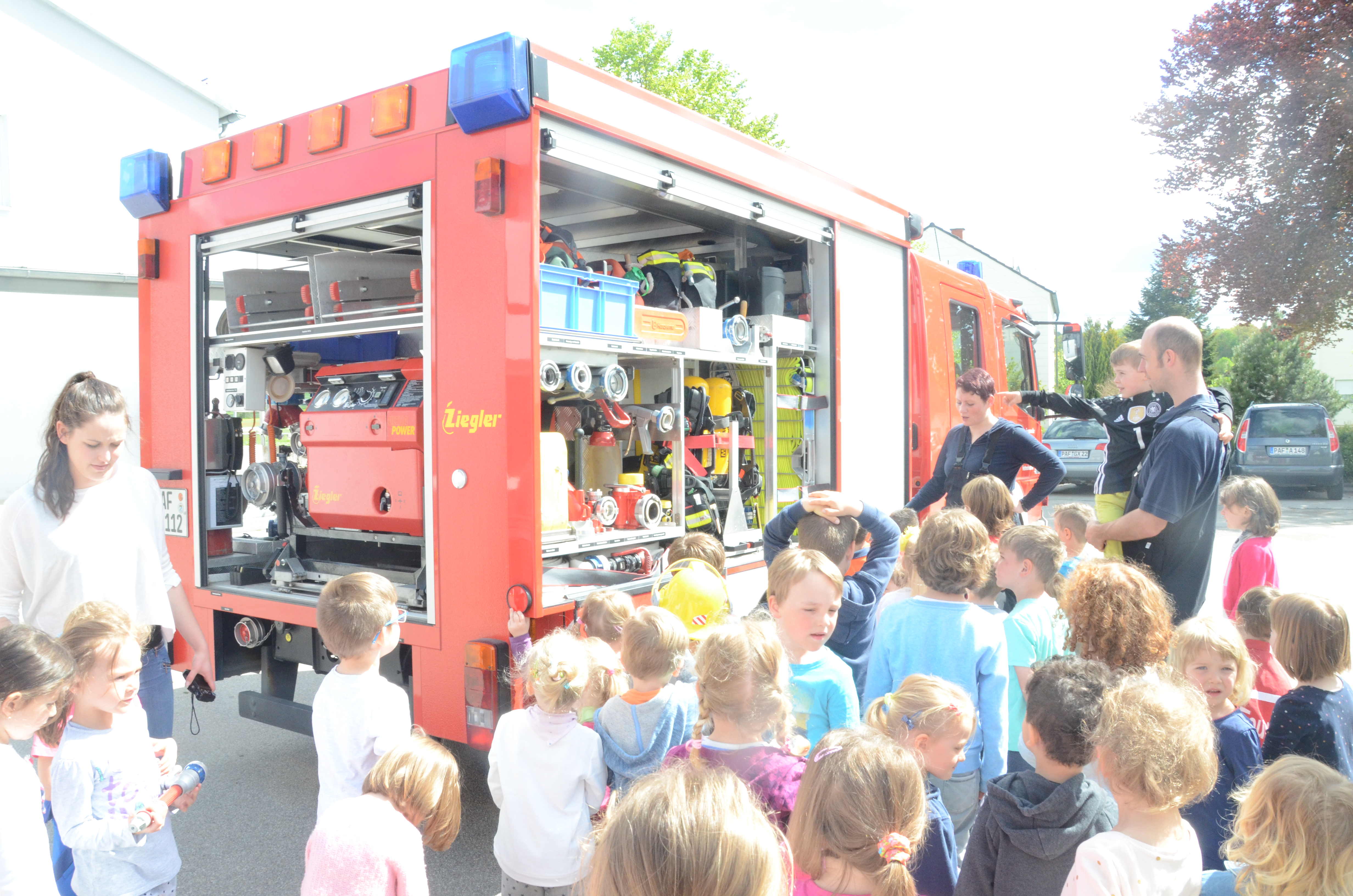 Im Anschluss stand dann im Feuerwehrhaus, das ja nur ein paar Meter entfernt liegt, gleich noch ein Ortstermin für die Buben und Mädchen an. Hier konnten sie sich das Feuerwehr-Auto mal aus nächster Nähe anschauen und sogar hinterm Lenkrad Platz nehmen. Man kann schon sagen: Die meisten waren Feuer und Flamme.