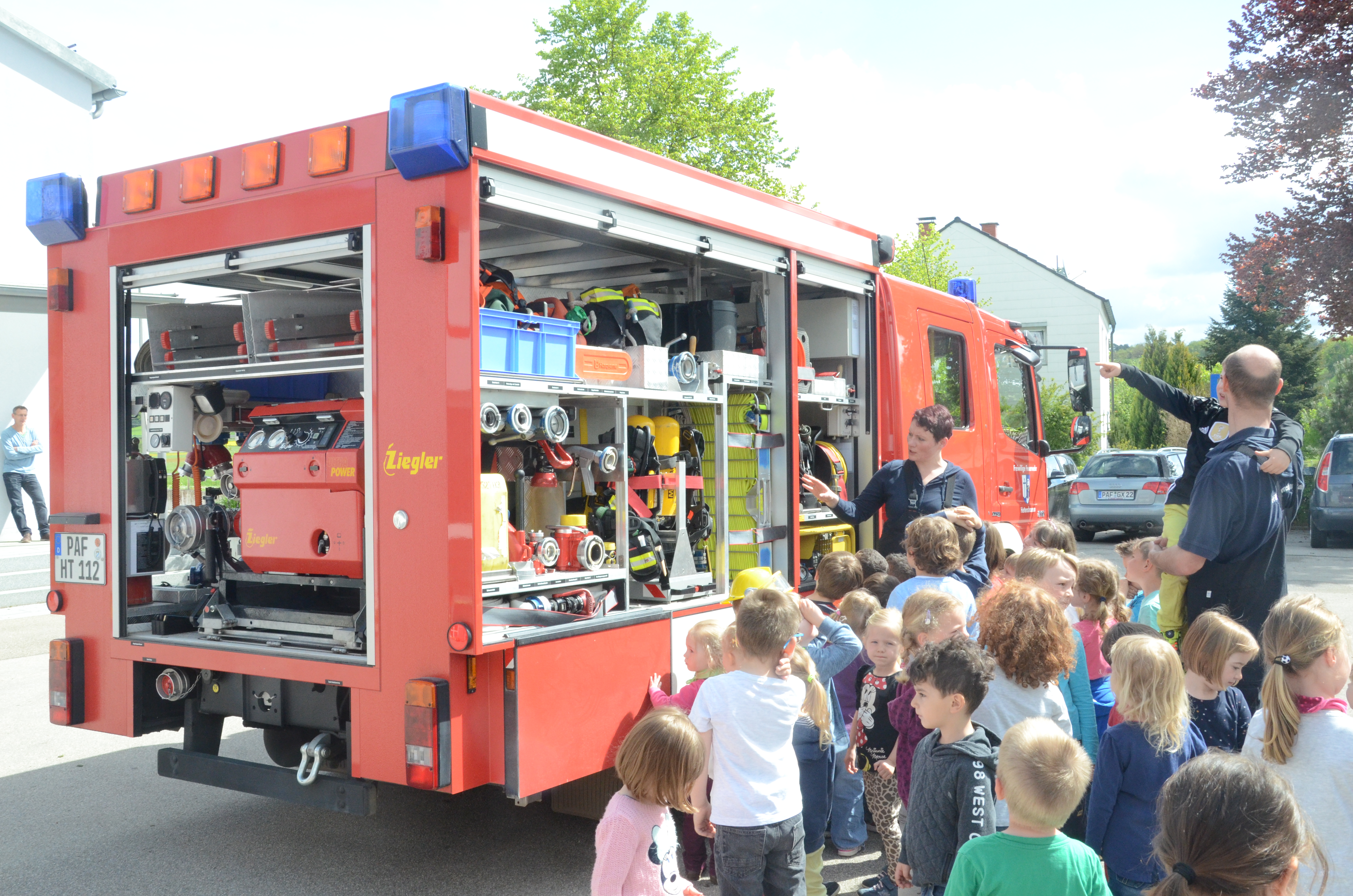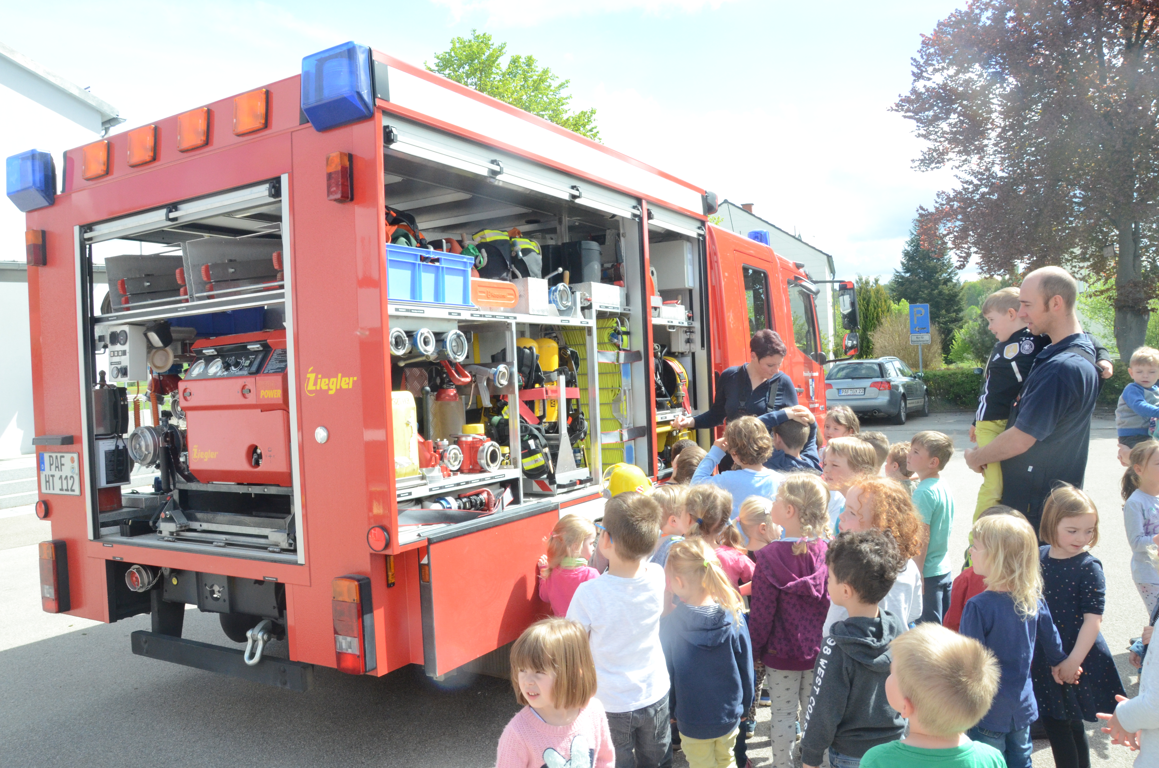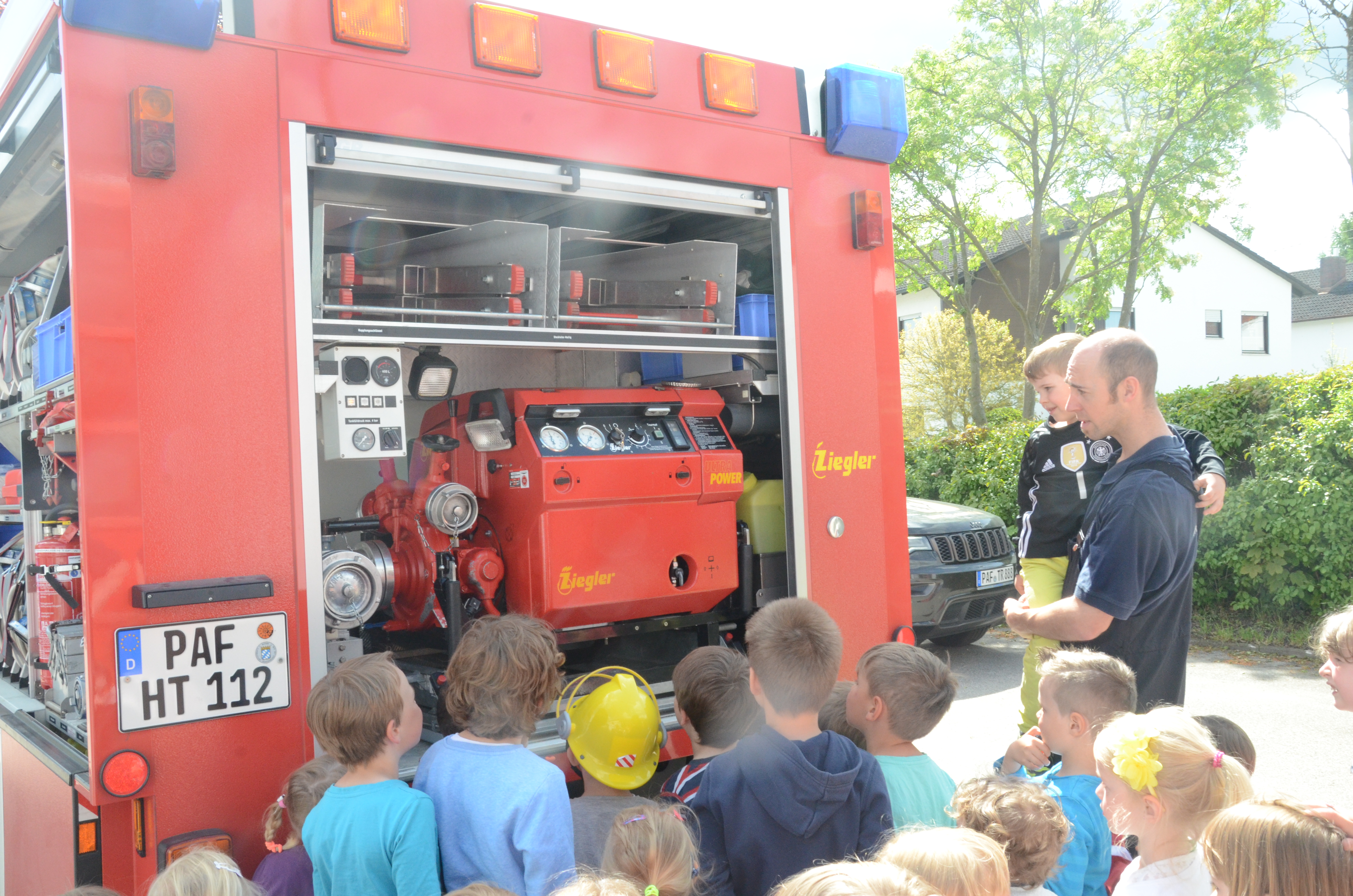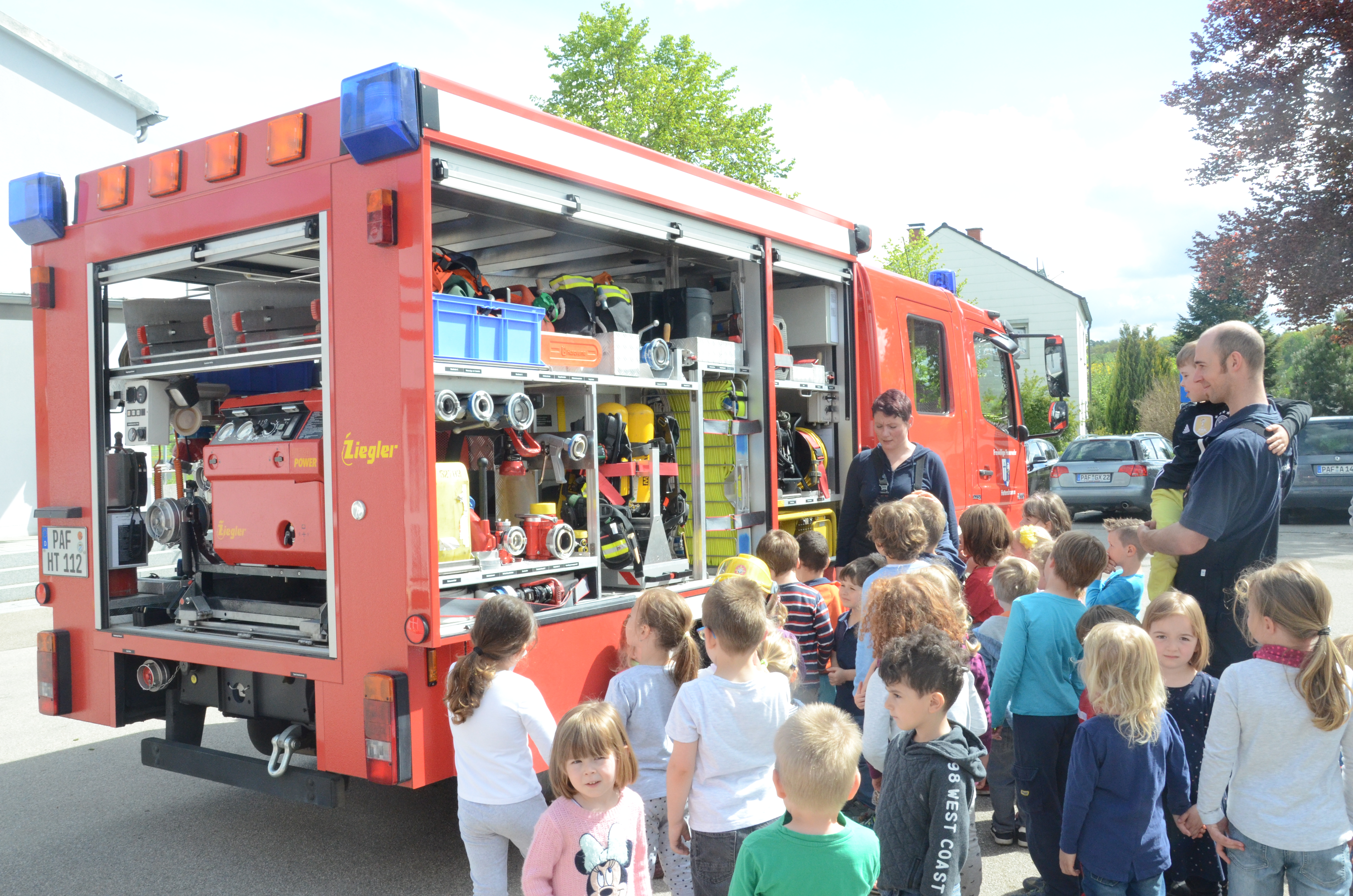 Im Anschluss stand dann im Feuerwehrhaus, das ja nur ein paar Meter entfernt liegt, gleich noch ein Ortstermin für die Buben und Mädchen an. Hier konnten sie sich das Feuerwehr-Auto mal aus nächster Nähe anschauen und sogar hinterm Lenkrad Platz nehmen. Man kann schon sagen: Die meisten waren Feuer und Flamme.