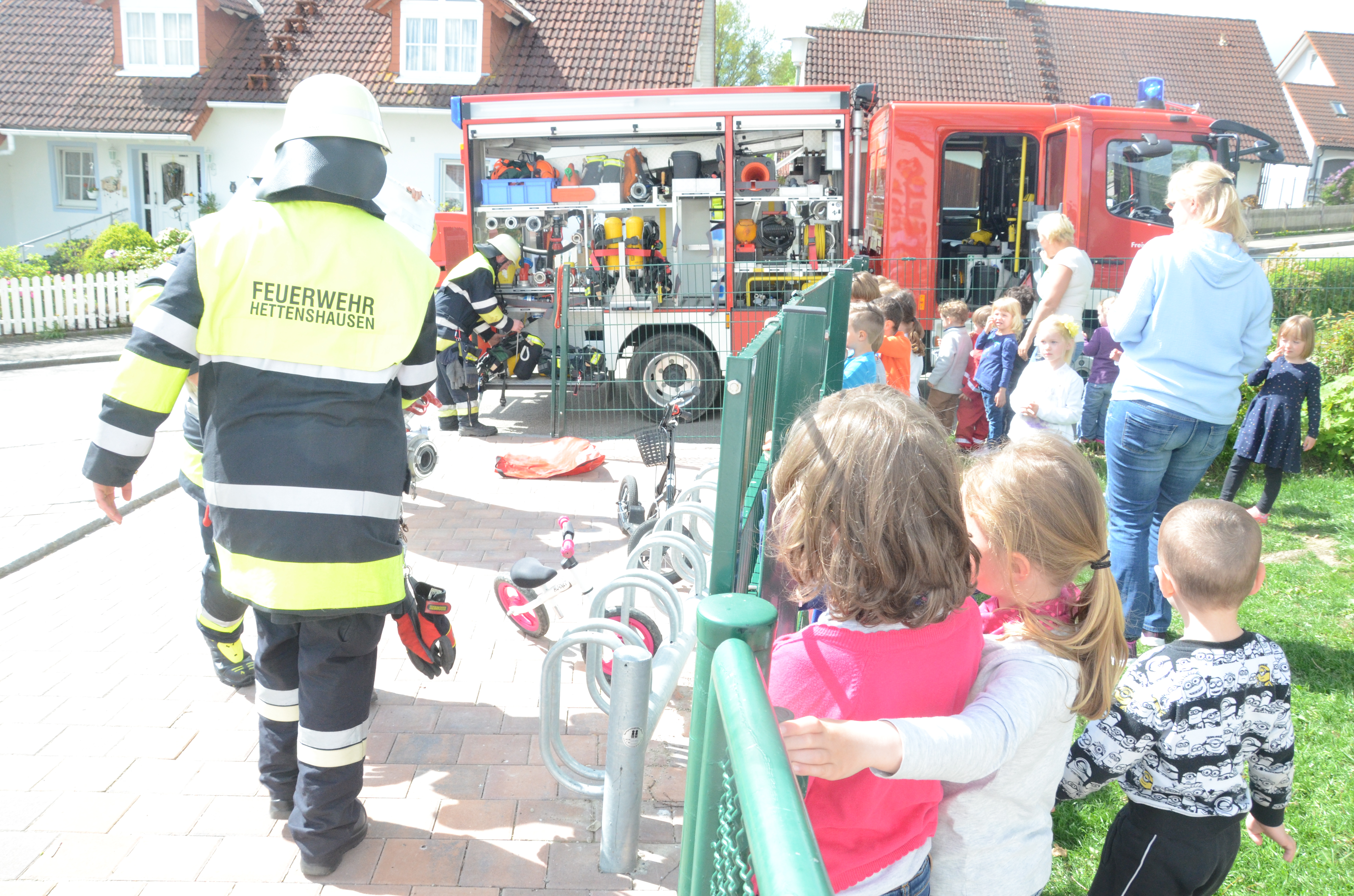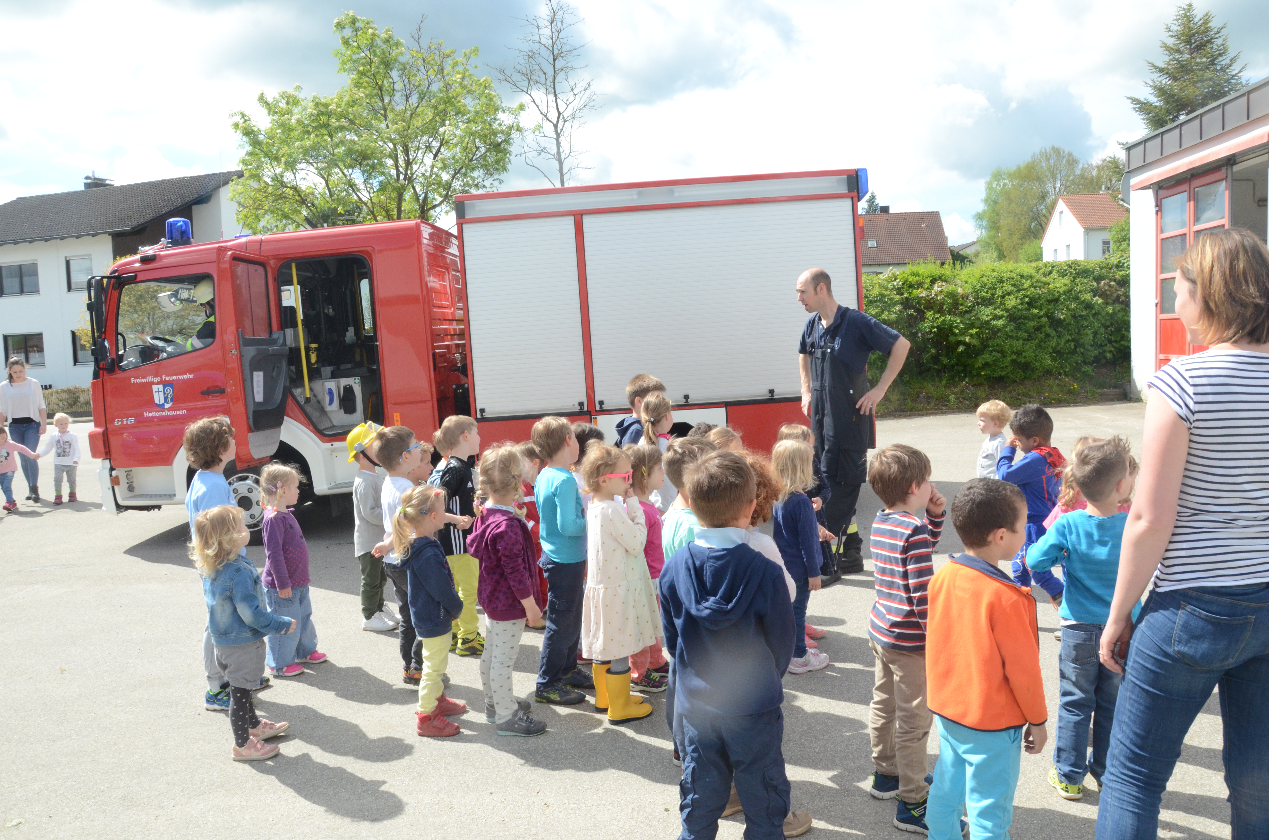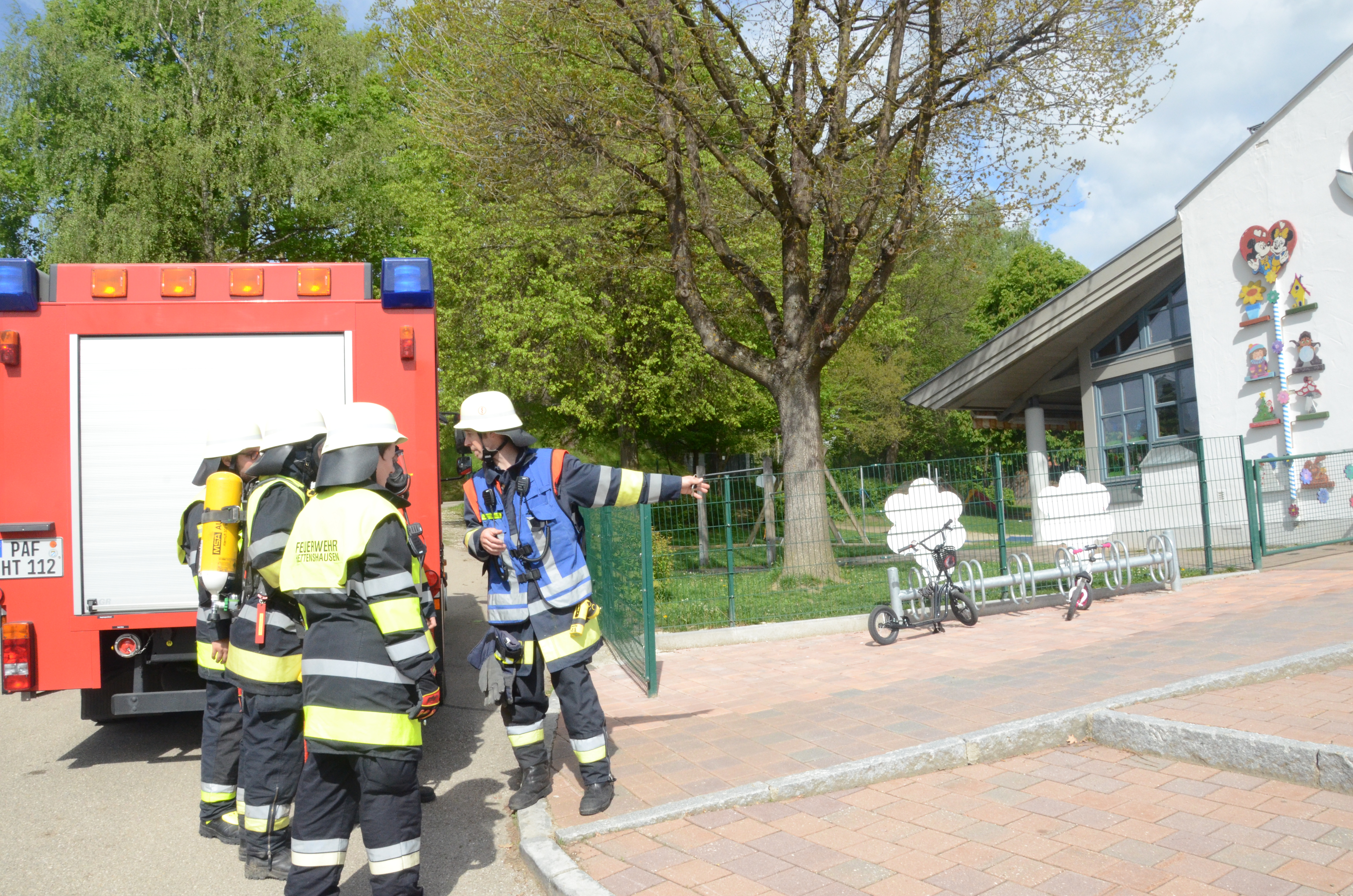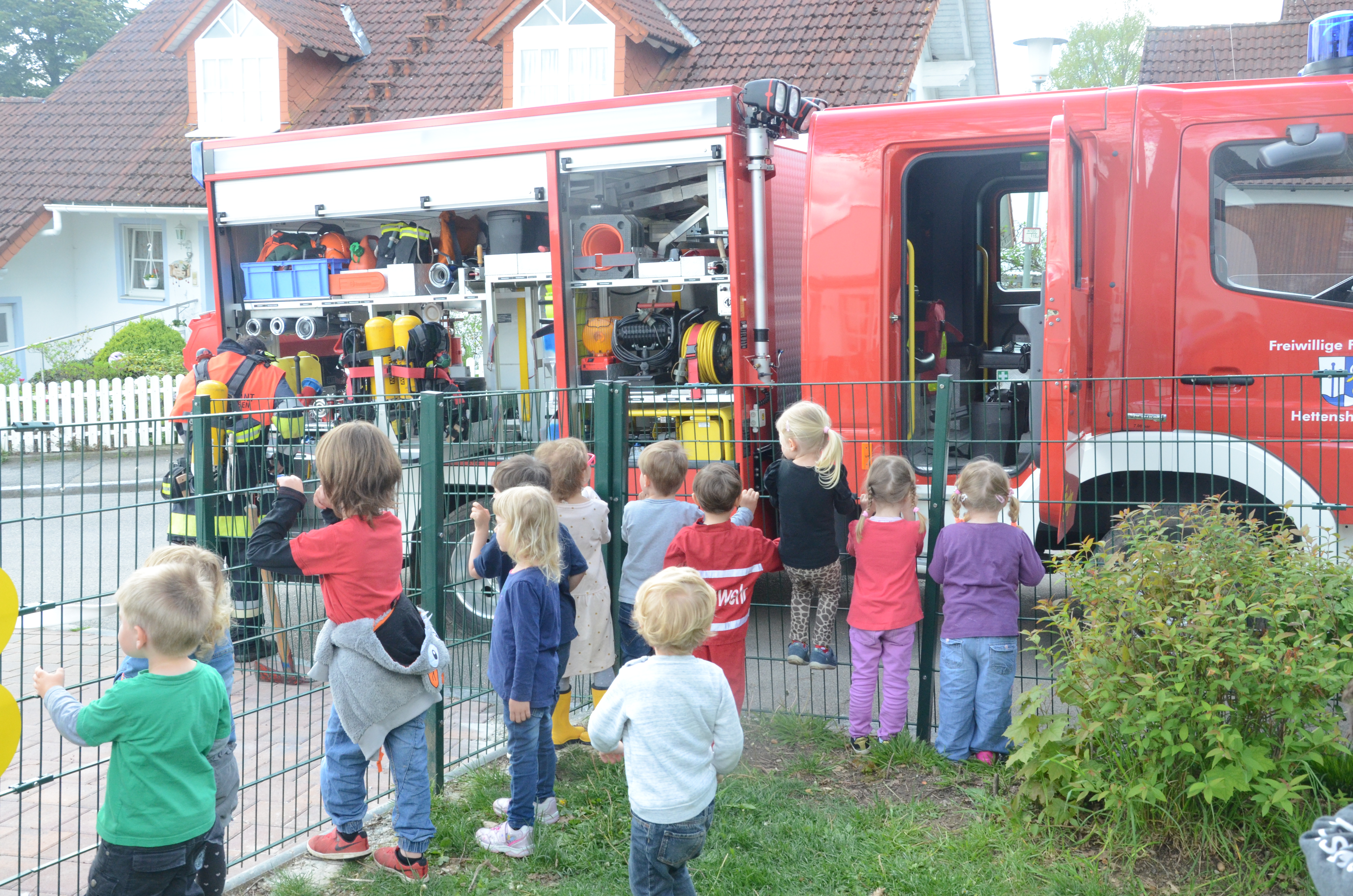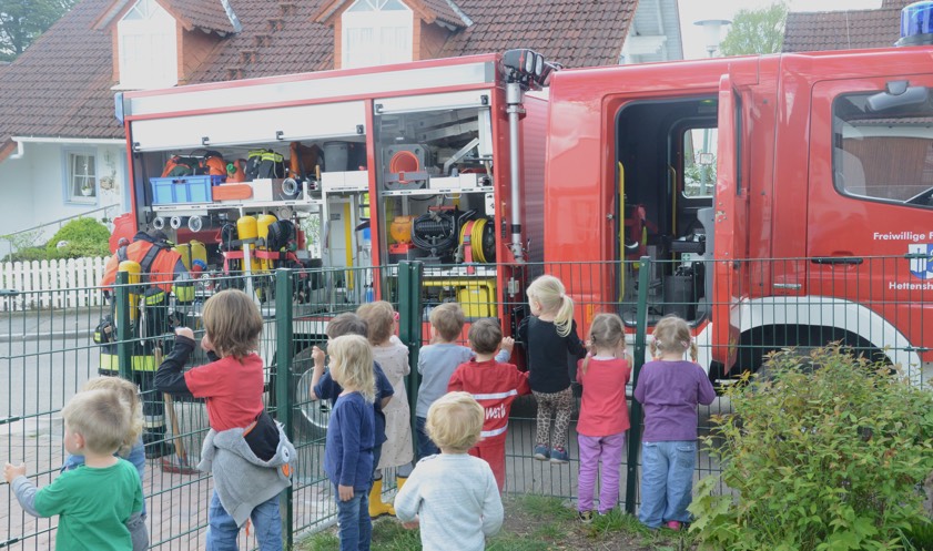 (zel) Der Hettenshausener Kindergarten wurde heute Vormittag geräumt. Aber keine Panik, es stand nur die jährliche Evakuierungs-Übung an. Die hiesigen Floriansjünger verbanden das auch ihrerseits gleich mit einer Übung und löschten einen angenommenen Brand im Untergeschoss, während die rund 70 Buben und Mädchen das aufregende Treiben der Einsatzkräfte aufmerksam beobachteten. Angerückt wurde übrigens mit Blaulicht und Sirene, was natürlich an sich schon ein Highlight für die Kleinen war.
