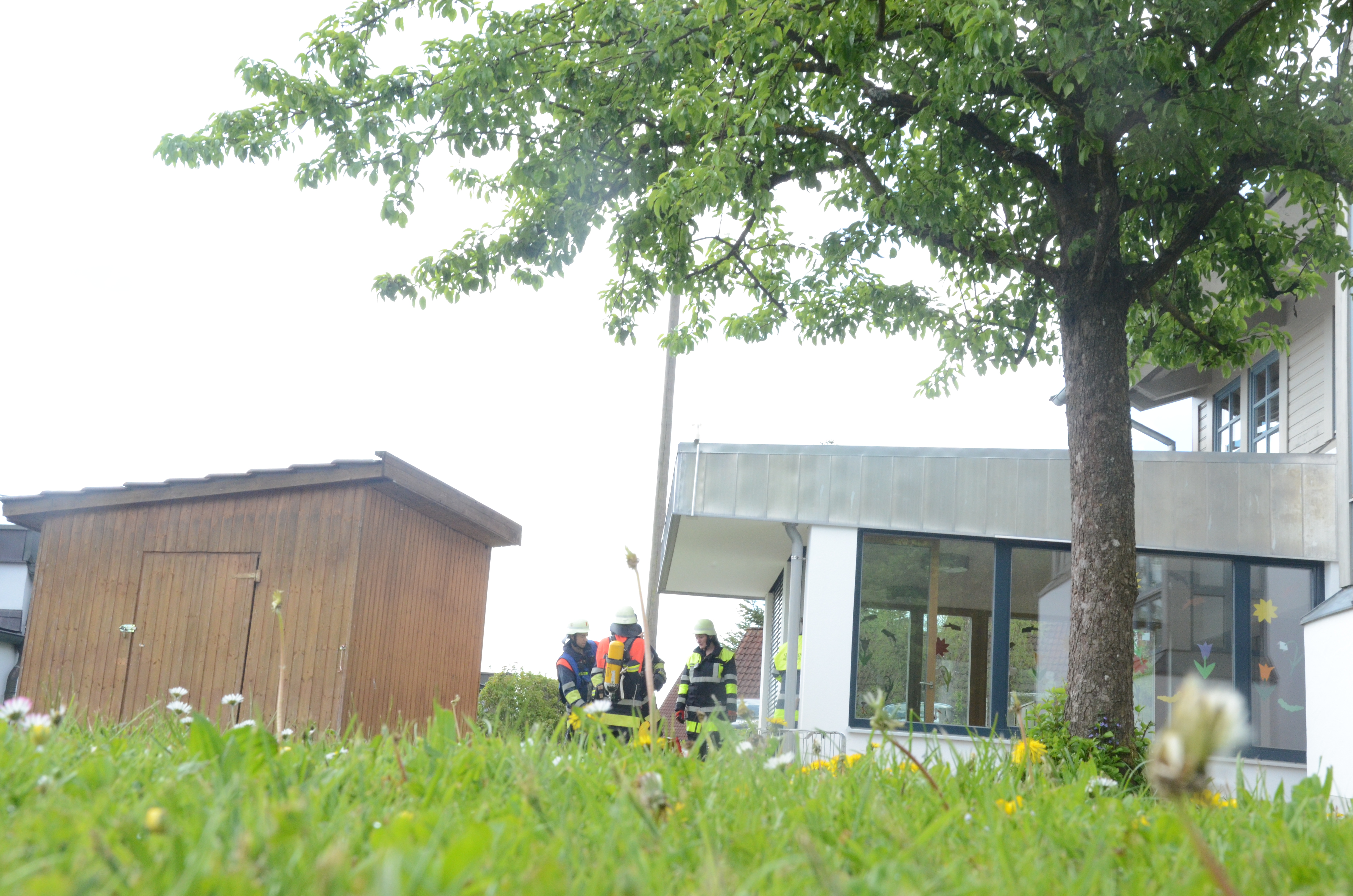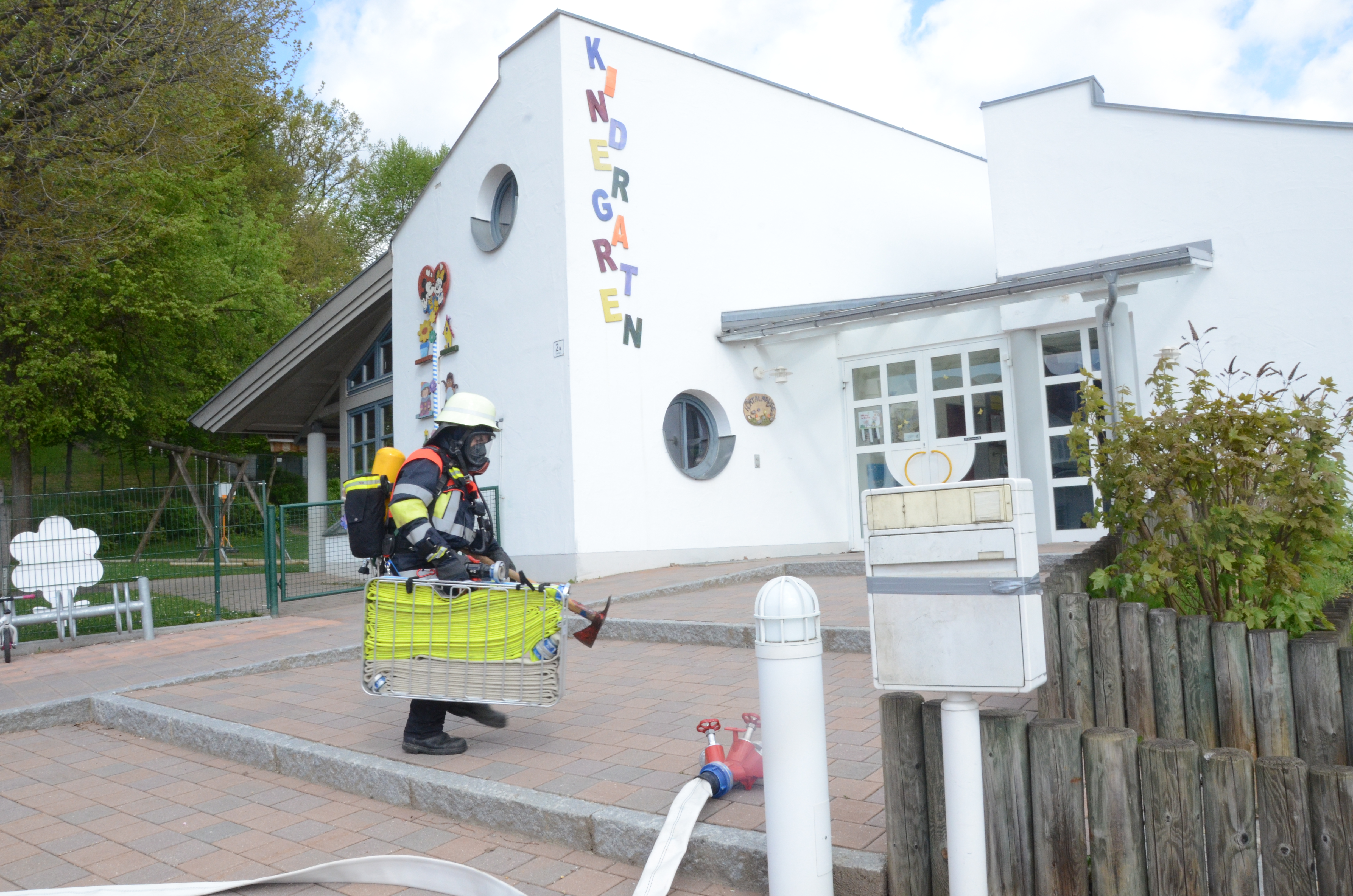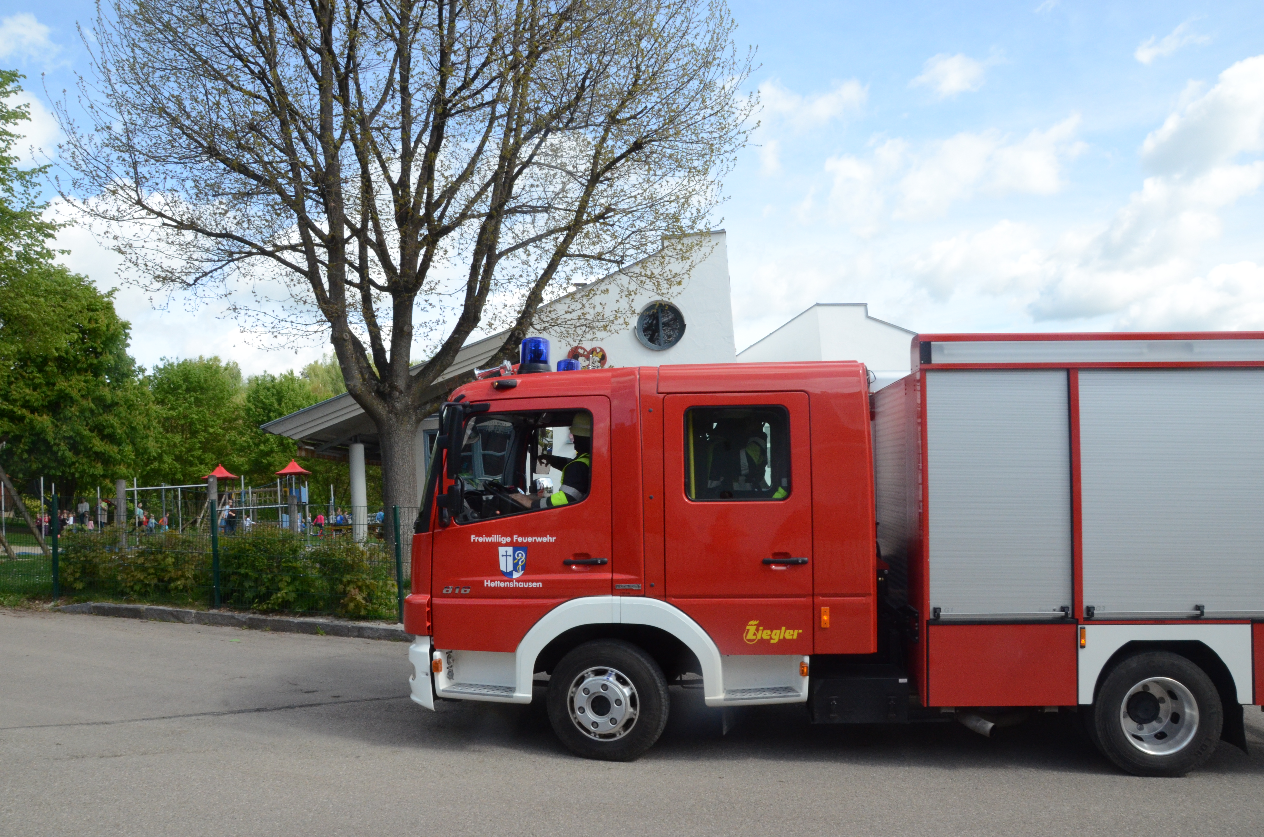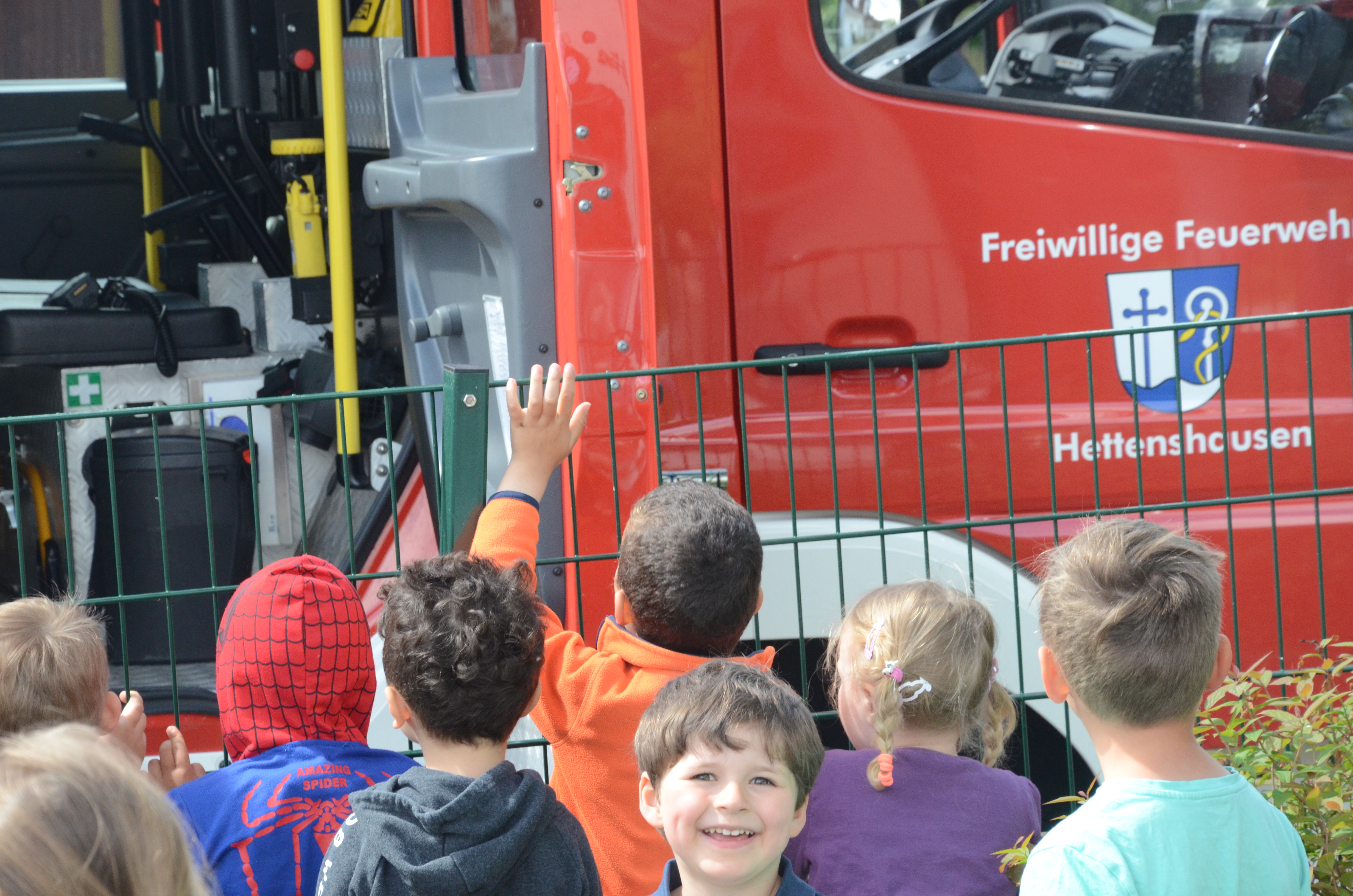 (zel) Der Hettenshausener Kindergarten wurde heute Vormittag geräumt. Aber keine Panik, es stand nur die jährliche Evakuierungs-Übung an. Die hiesigen Floriansjünger verbanden das auch ihrerseits gleich mit einer Übung und löschten einen angenommenen Brand im Untergeschoss, während die rund 70 Buben und Mädchen das aufregende Treiben der Einsatzkräfte aufmerksam beobachteten. Angerückt wurde übrigens mit Blaulicht und Sirene, was natürlich an sich schon ein Highlight für die Kleinen war.