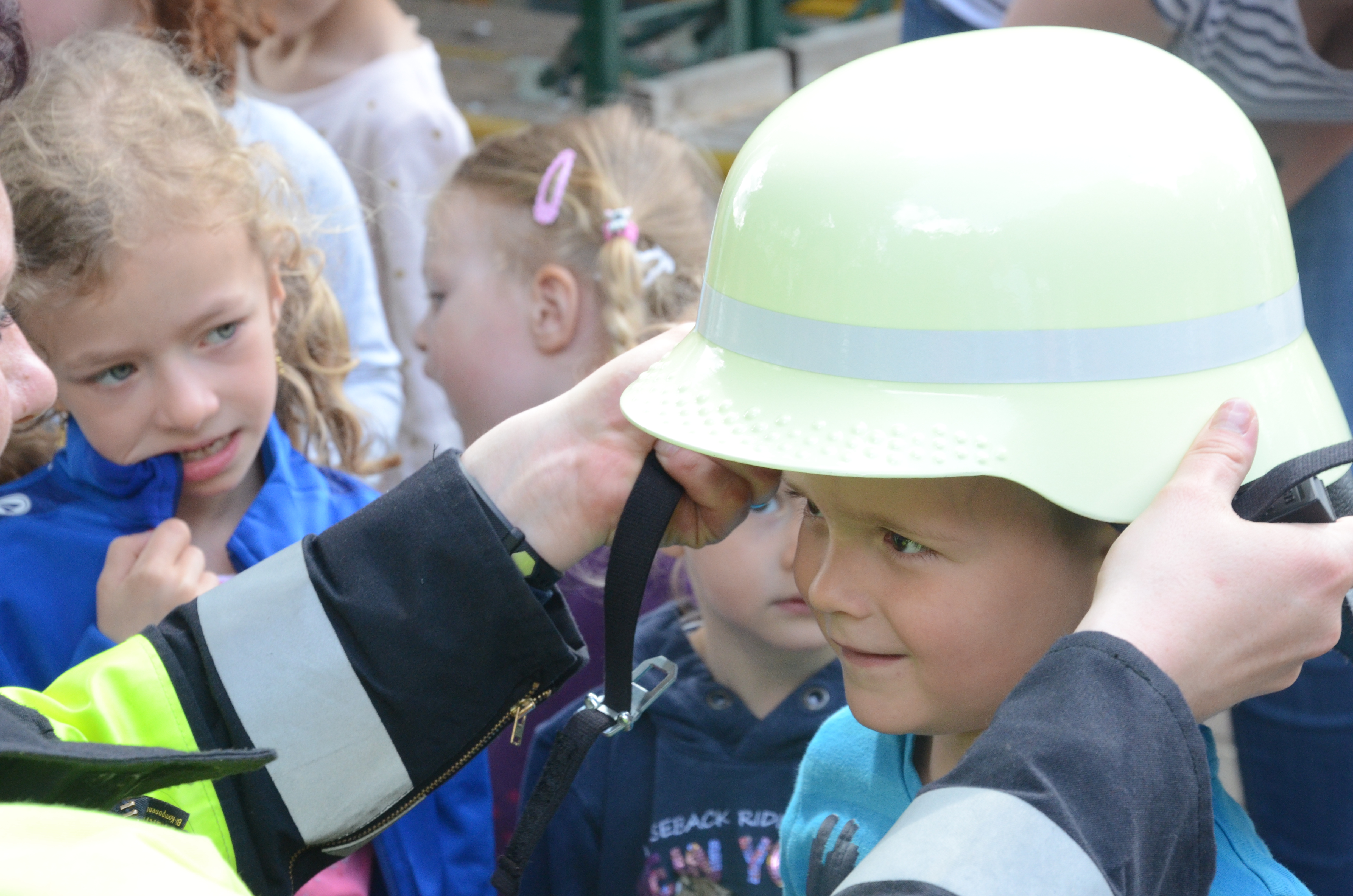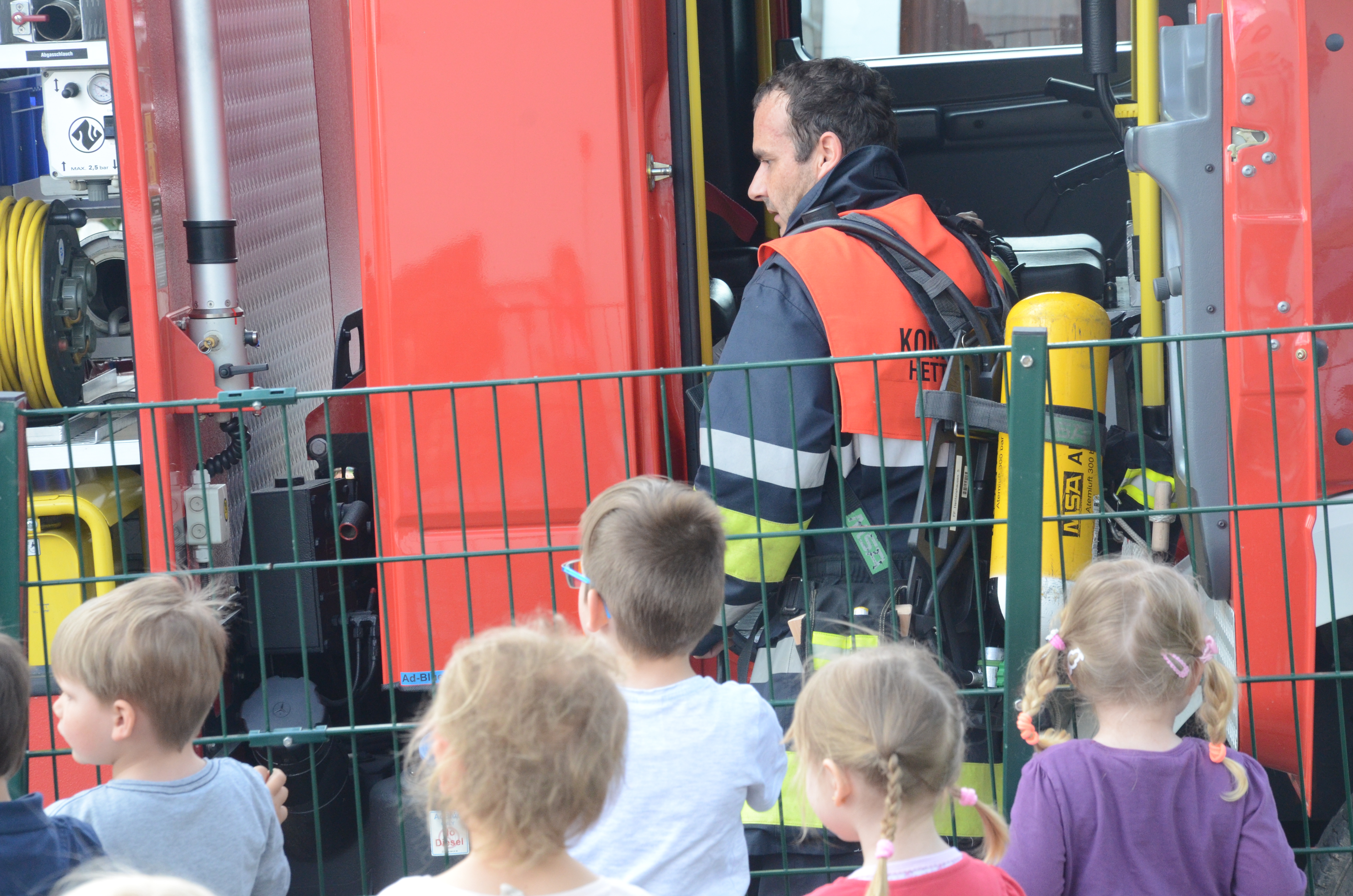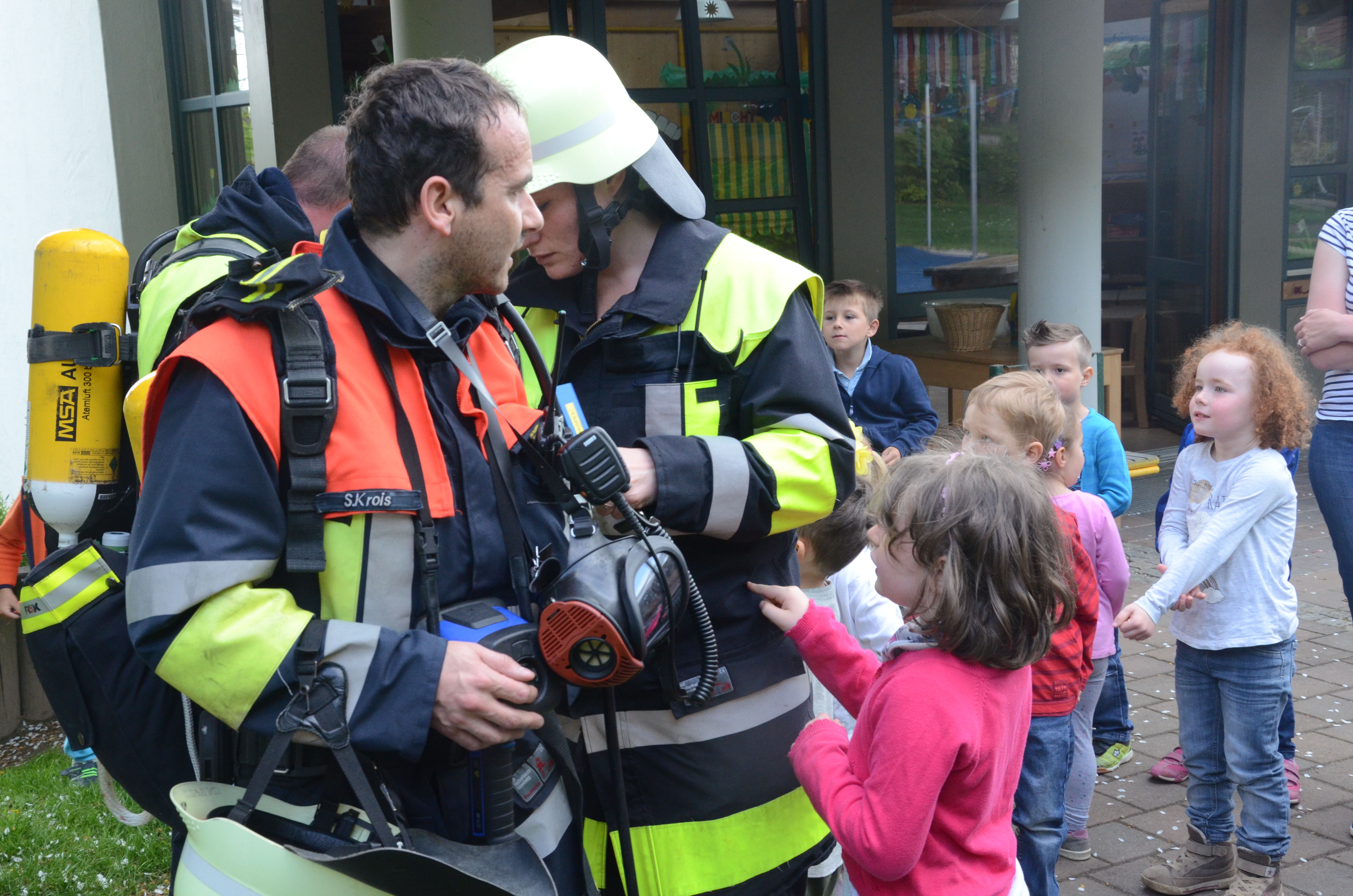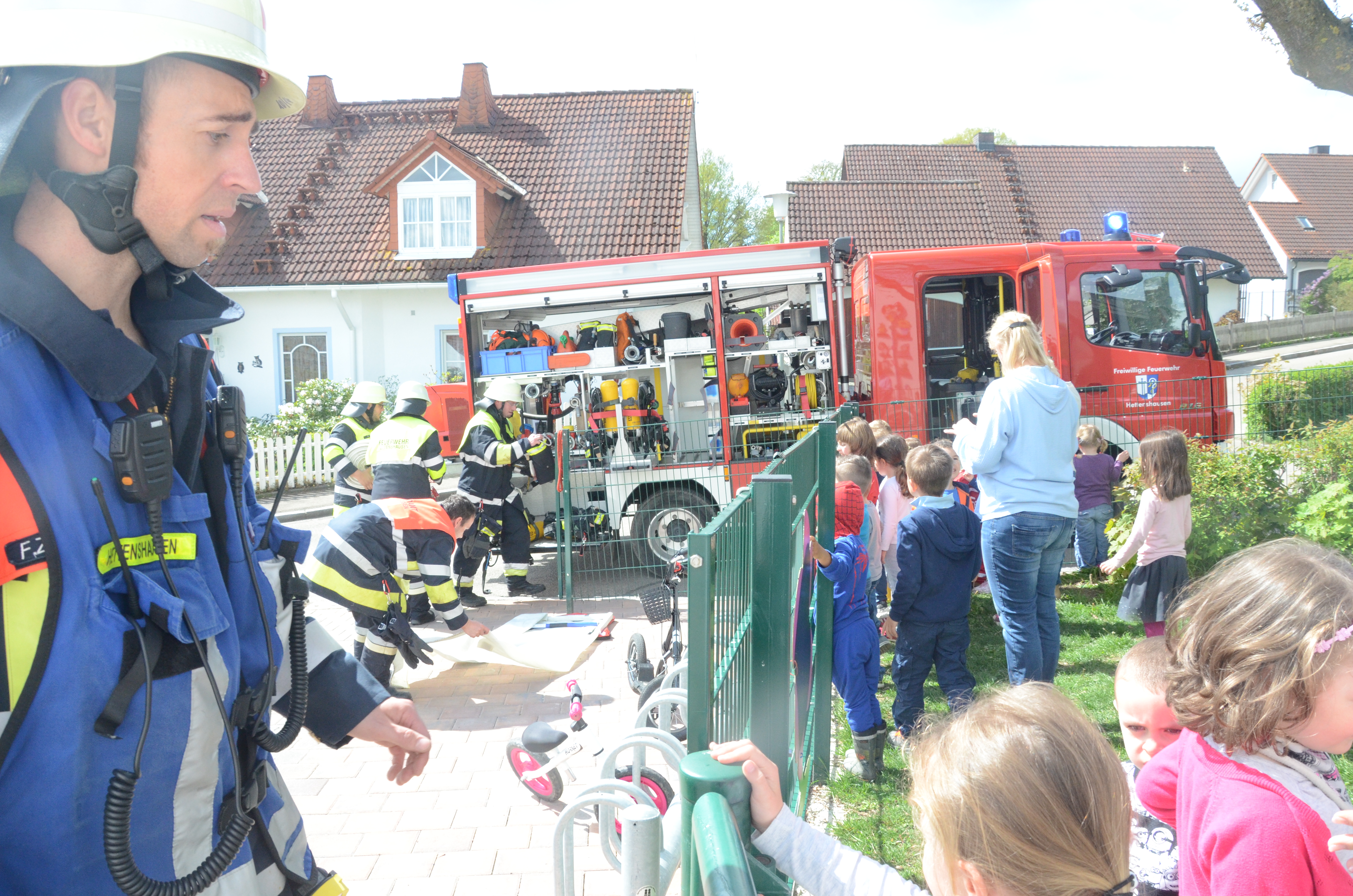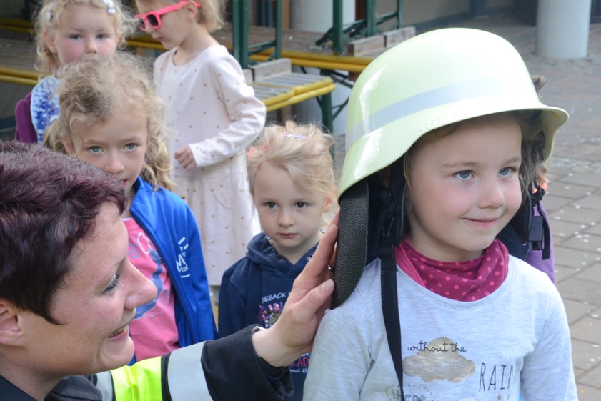 Die Kindergarten-Kinder waren indes nicht nur neugierig, sondern hellauf begeistert von dem Besuch der Feuerwehrler. Schließlich durften sie nicht nur die Übung anschauen, sondern die Ausrüstung begutachten und probeweise den Helm aufsetzen.