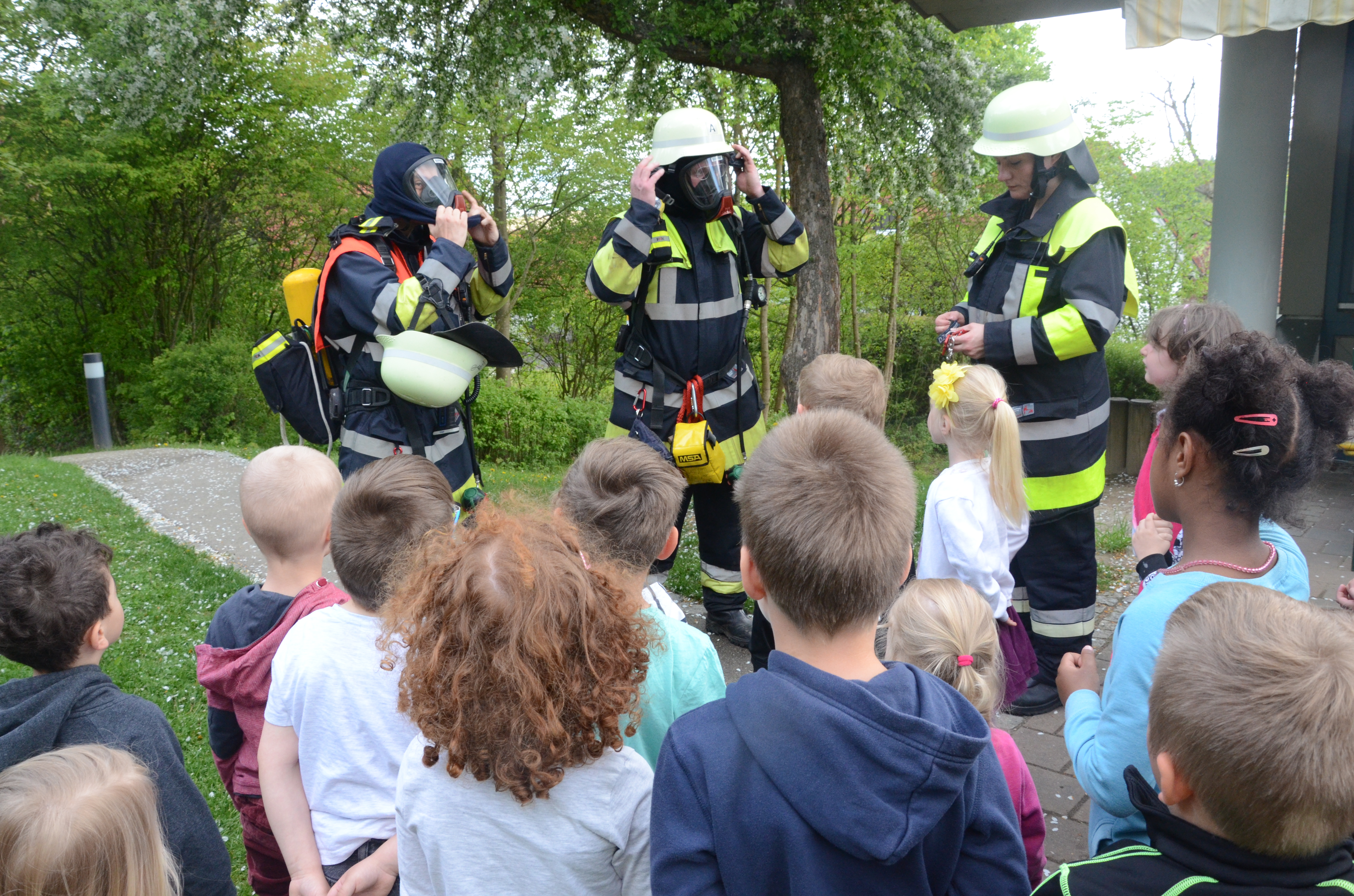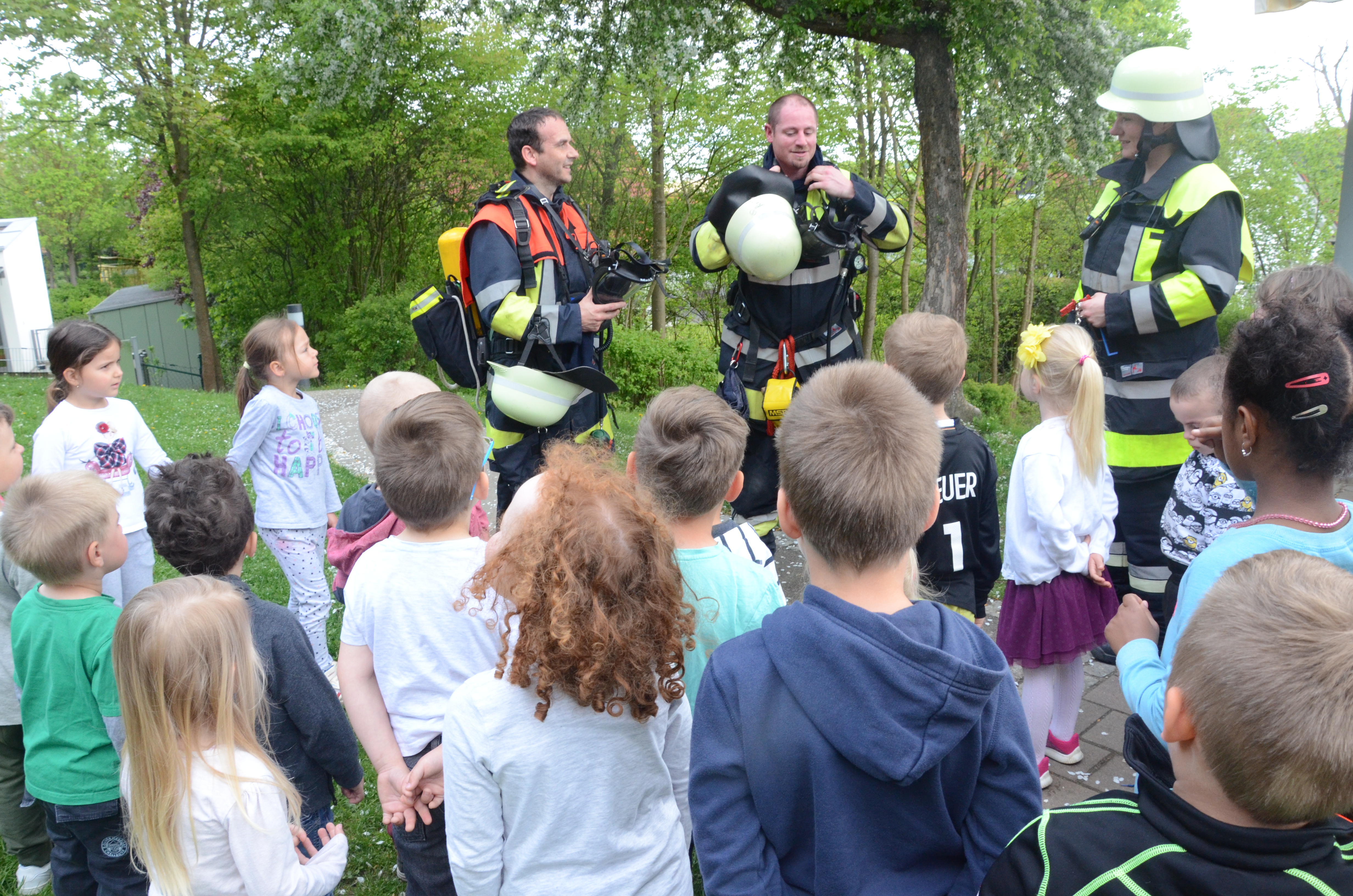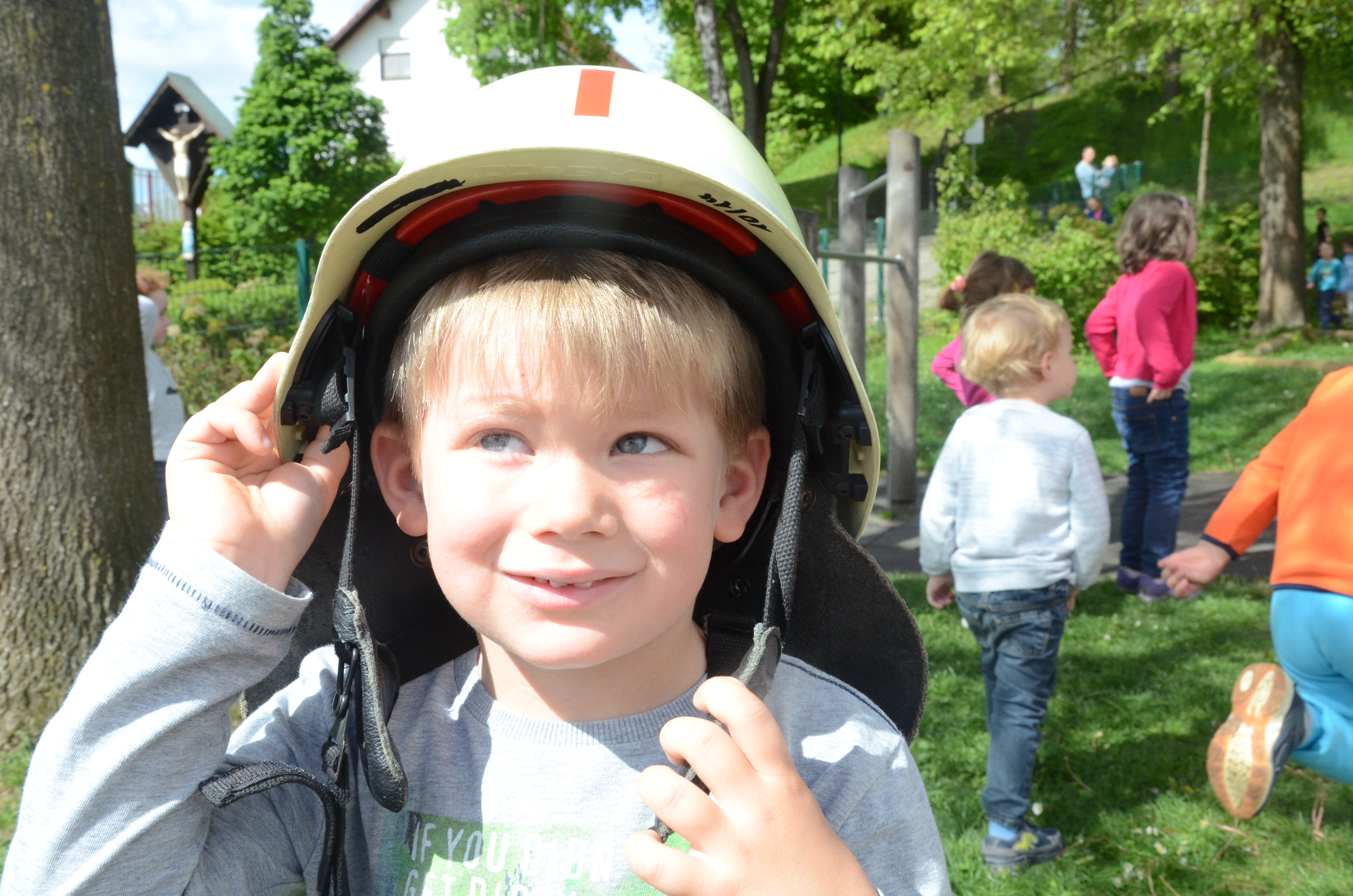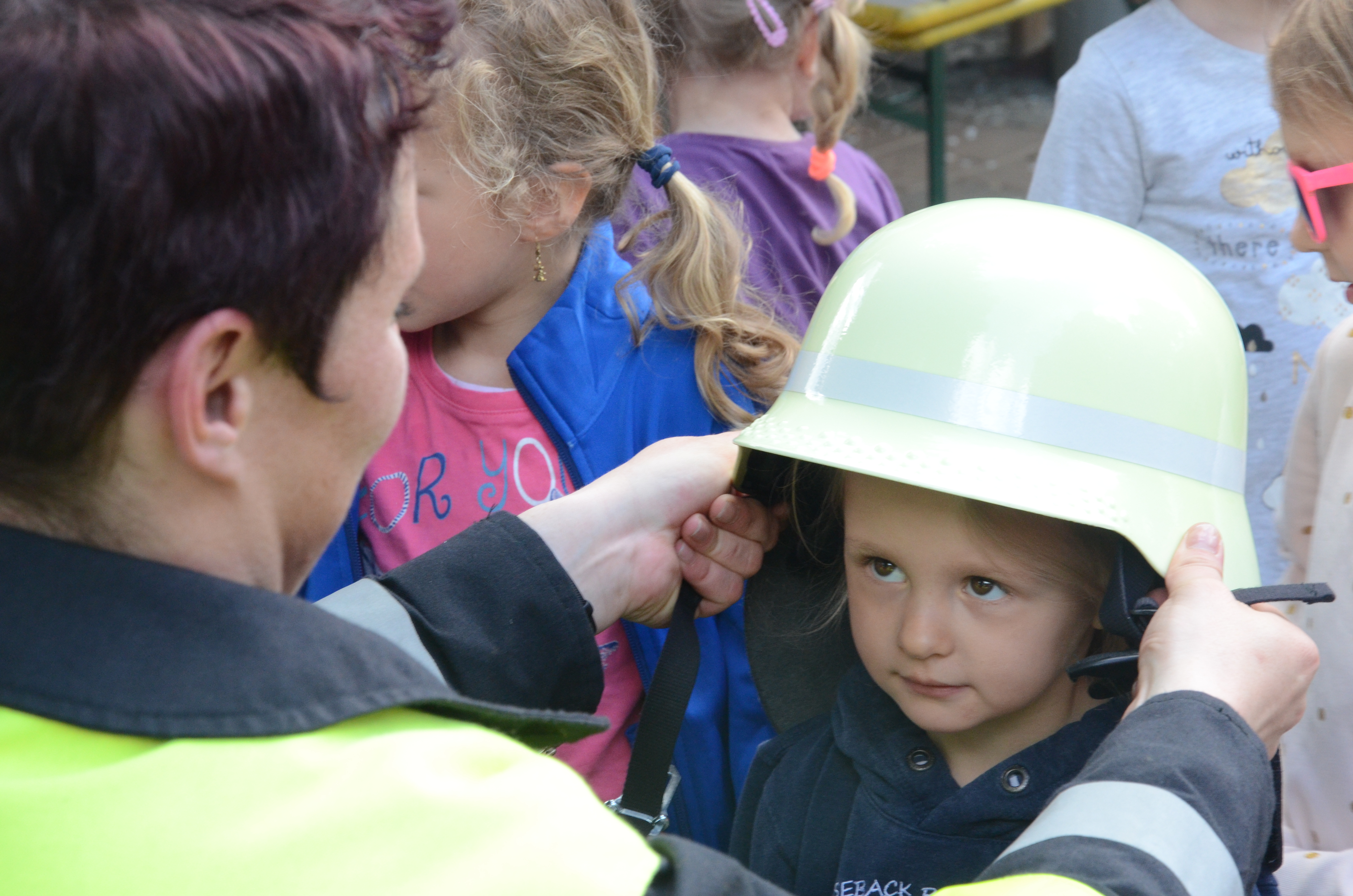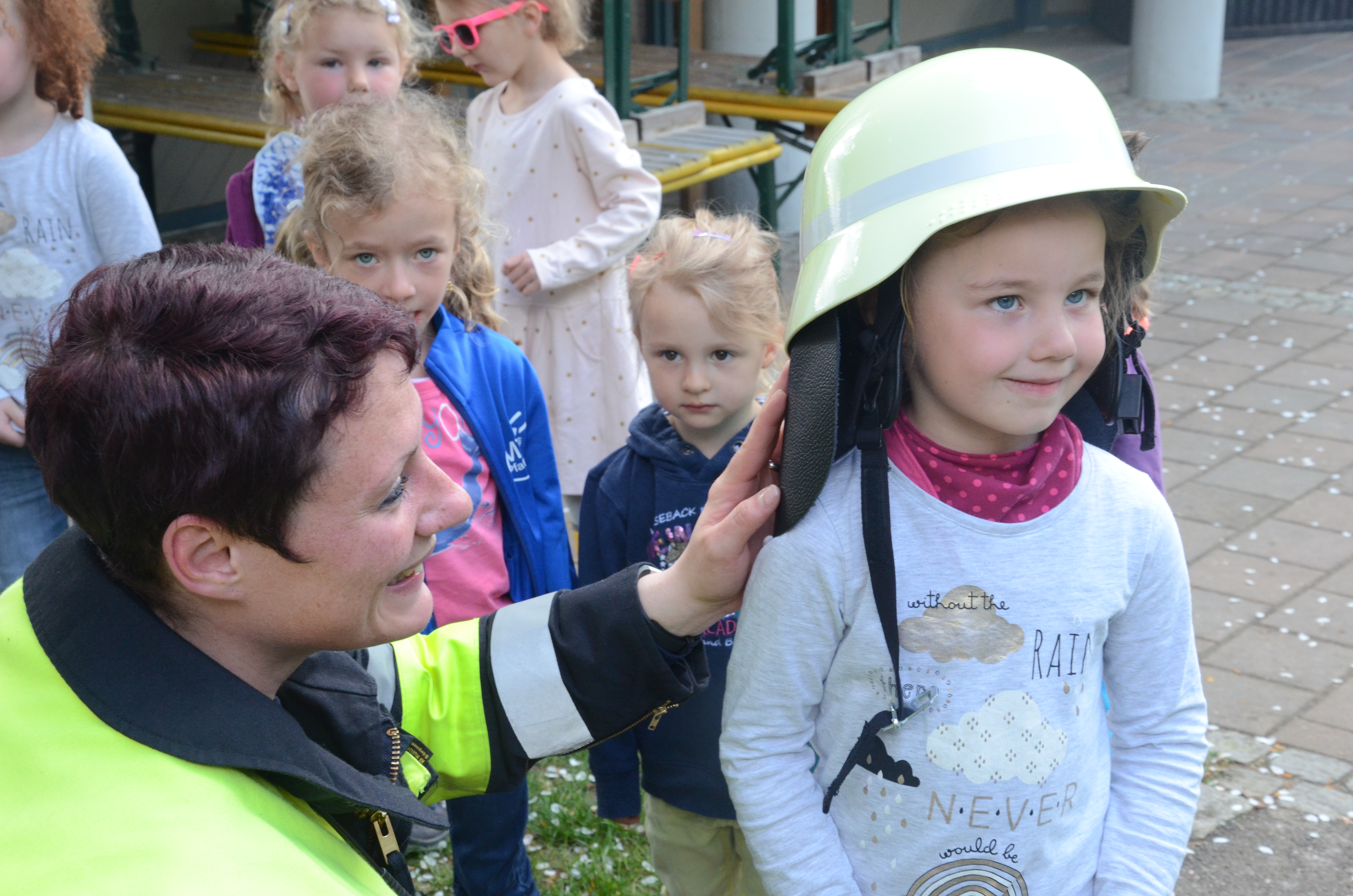 Die Kindergarten-Kinder waren indes nicht nur neugierig, sondern hellauf begeistert von dem Besuch der Feuerwehrler. Schließlich durften sie nicht nur die Übung anschauen, sondern die Ausrüstung begutachten und probeweise den Helm aufsetzen.