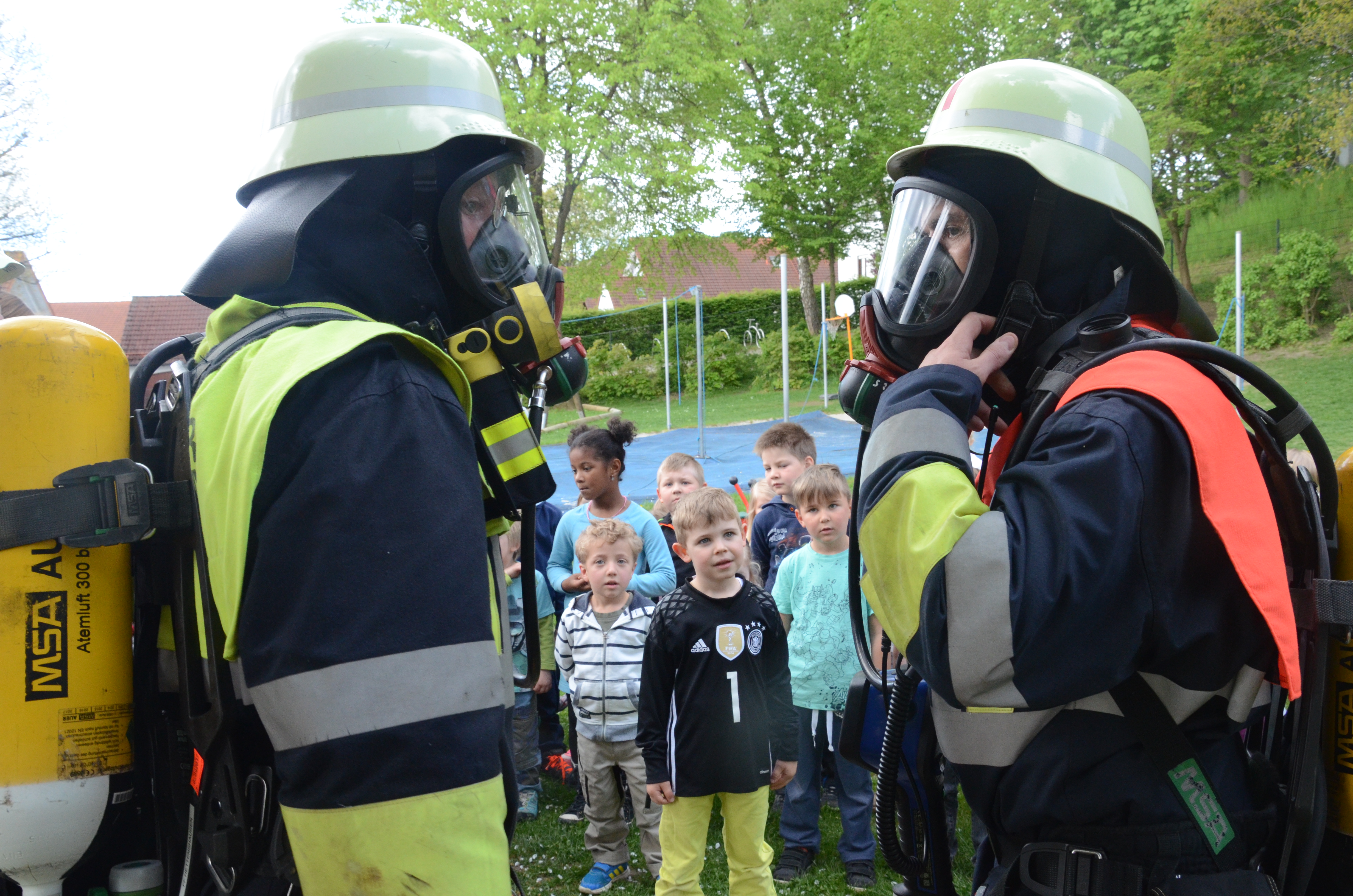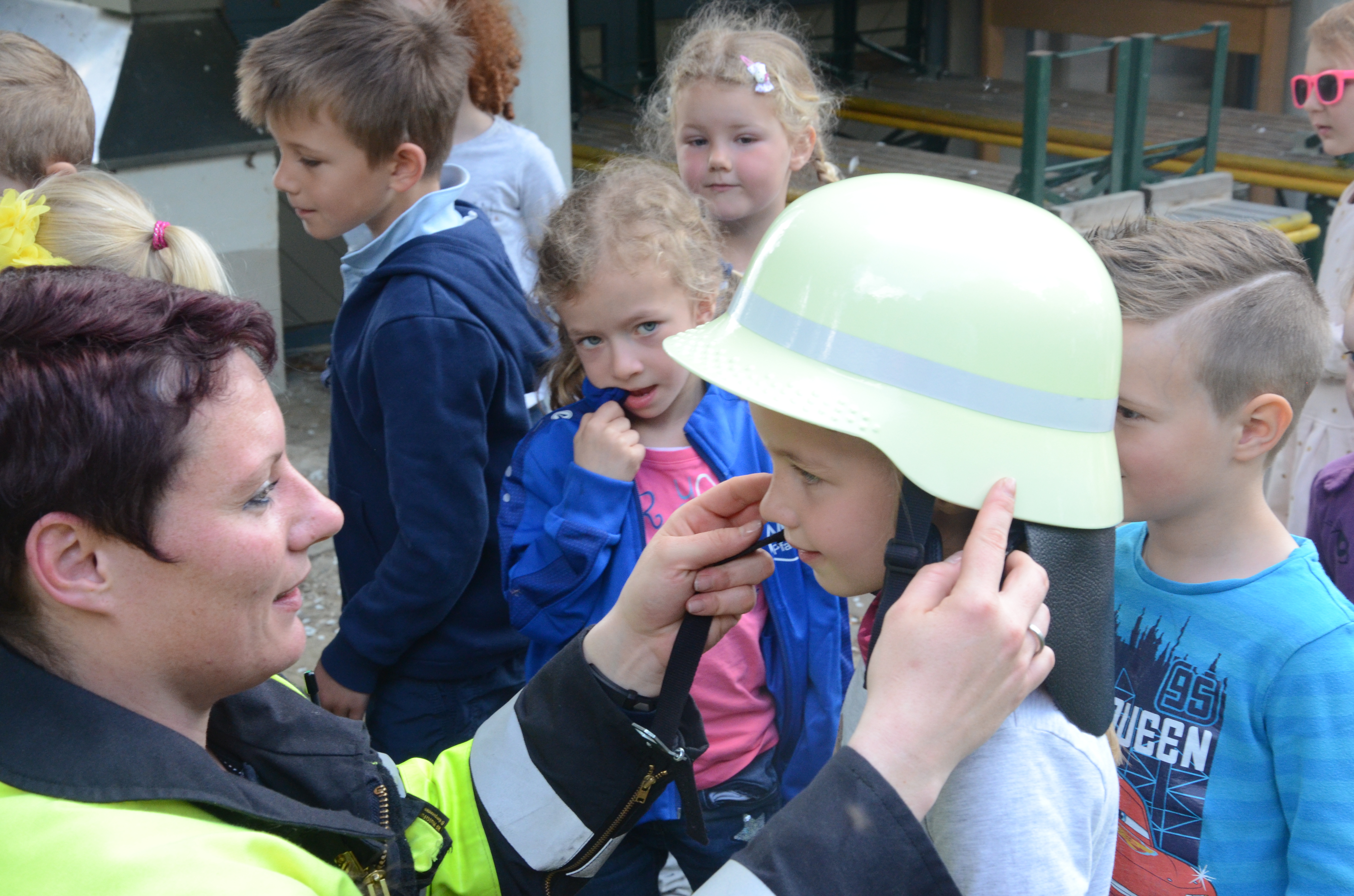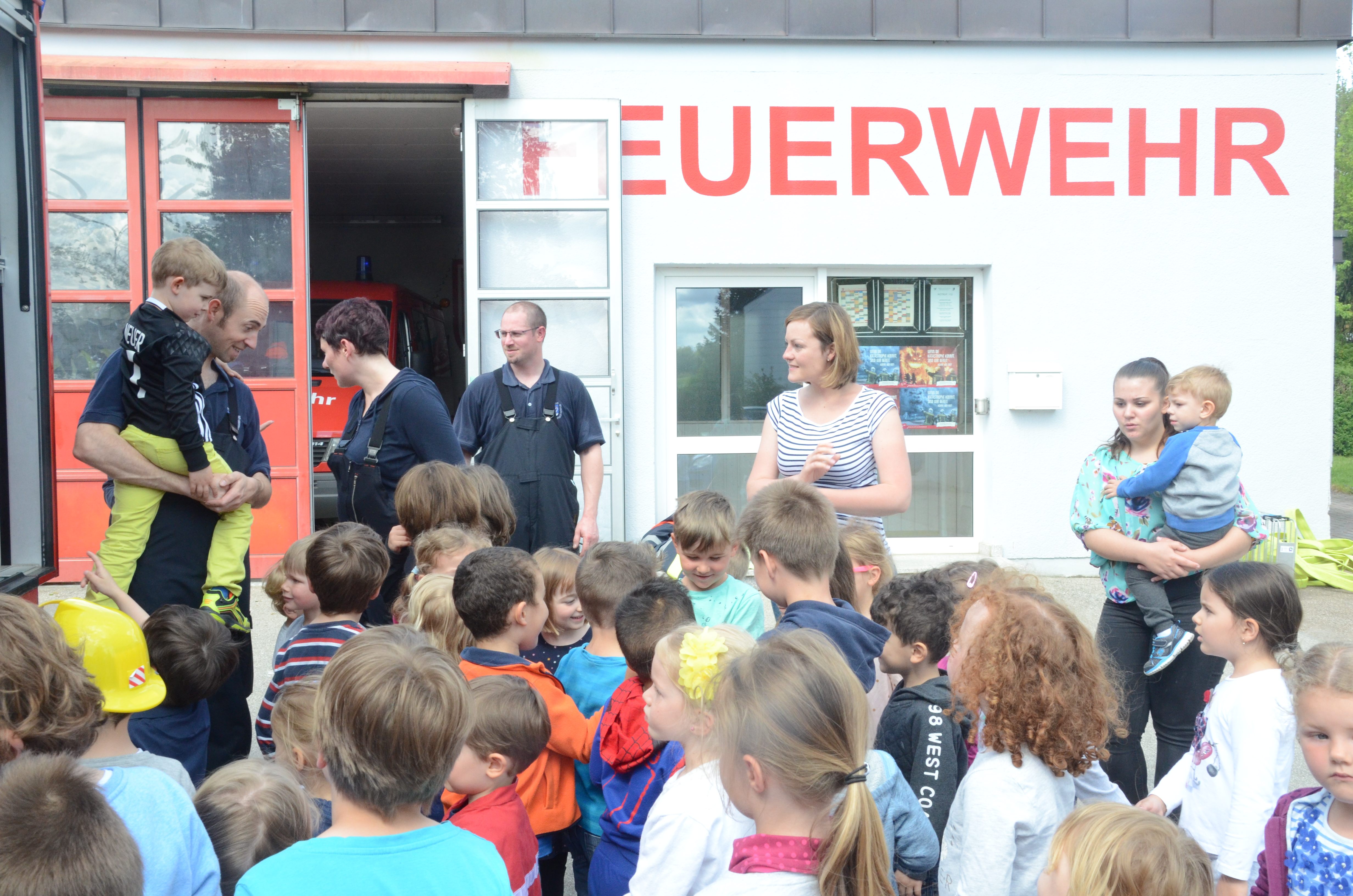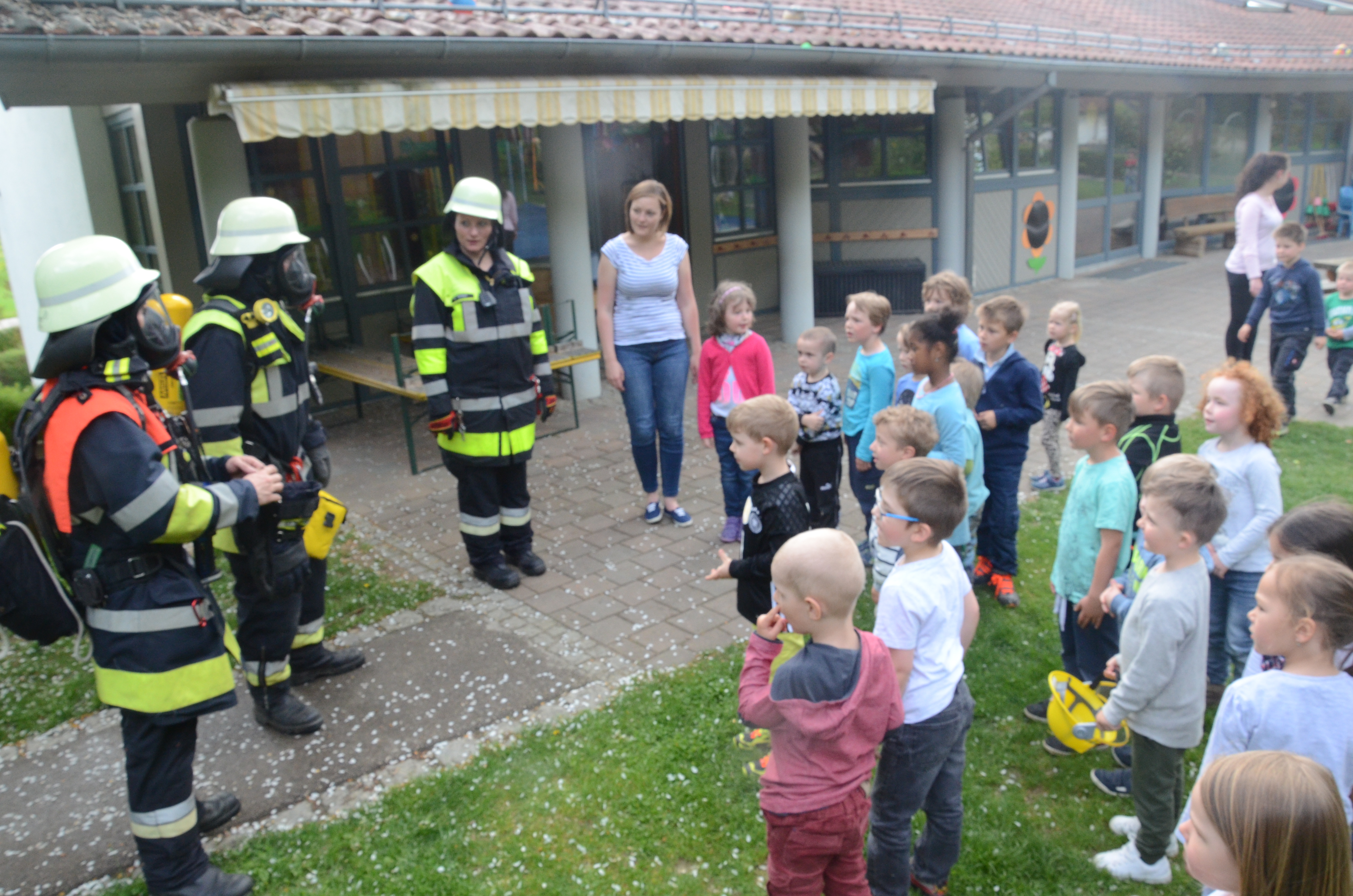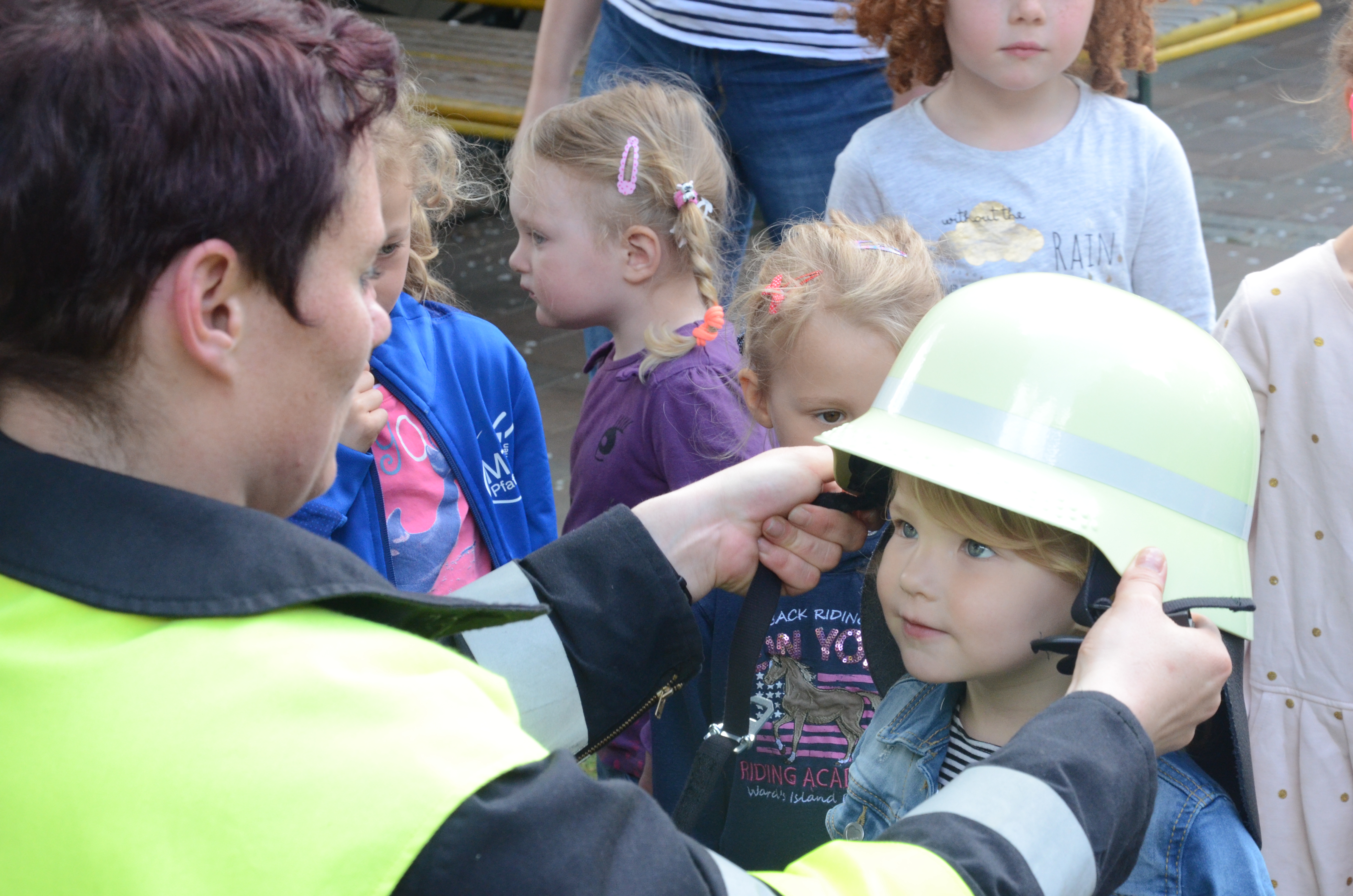 Die Kindergarten-Kinder waren indes nicht nur neugierig, sondern hellauf begeistert von dem Besuch der Feuerwehrler. Schließlich durften sie nicht nur die Übung anschauen, sondern die Ausrüstung begutachten und probeweise den Helm aufsetzen.