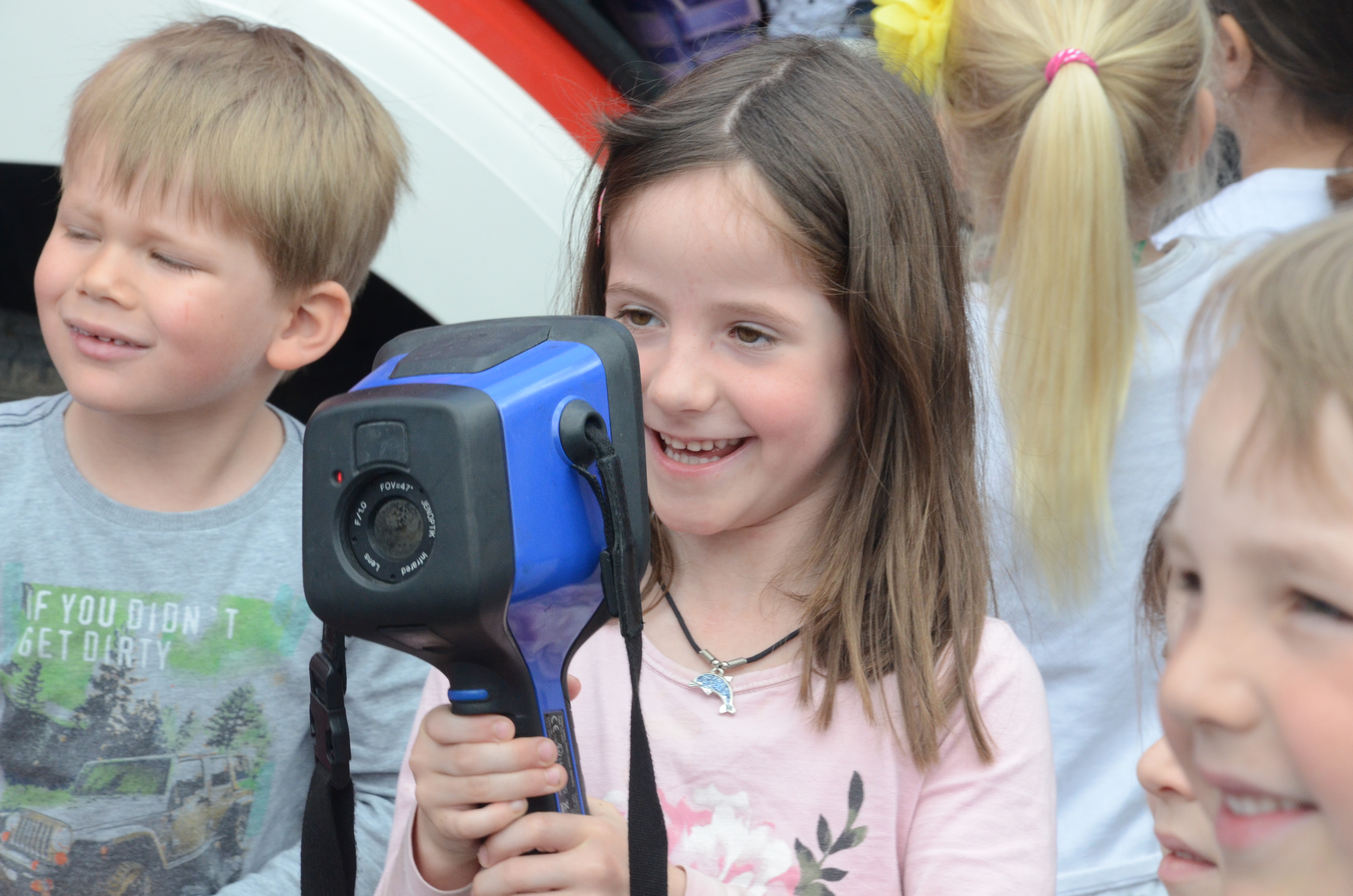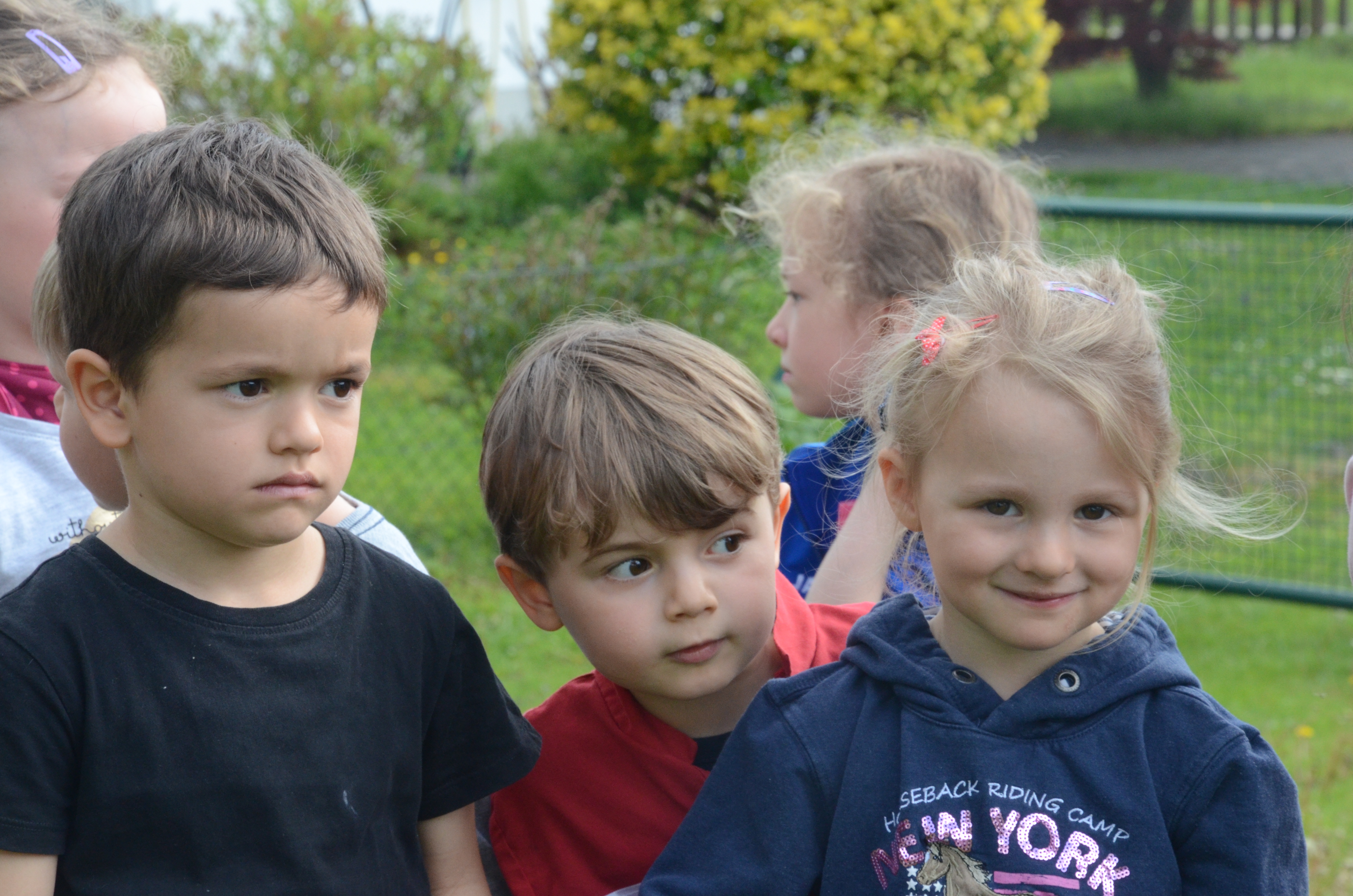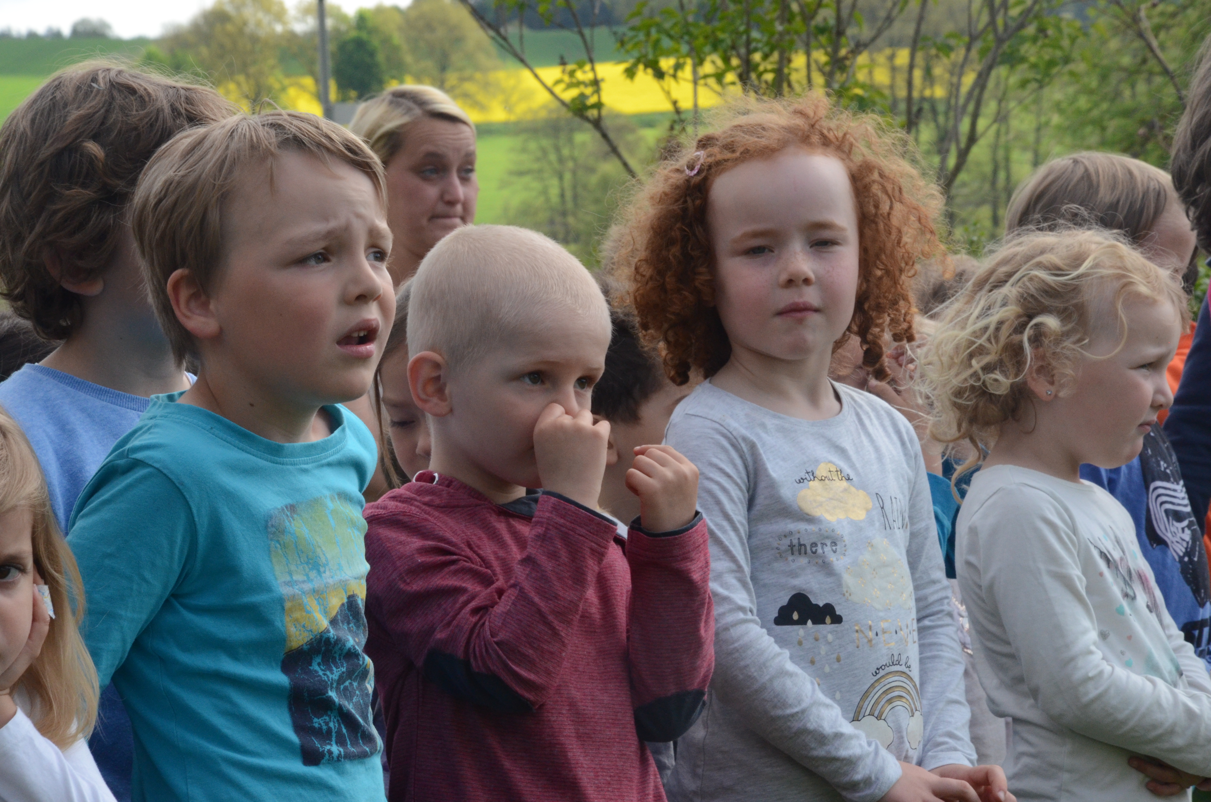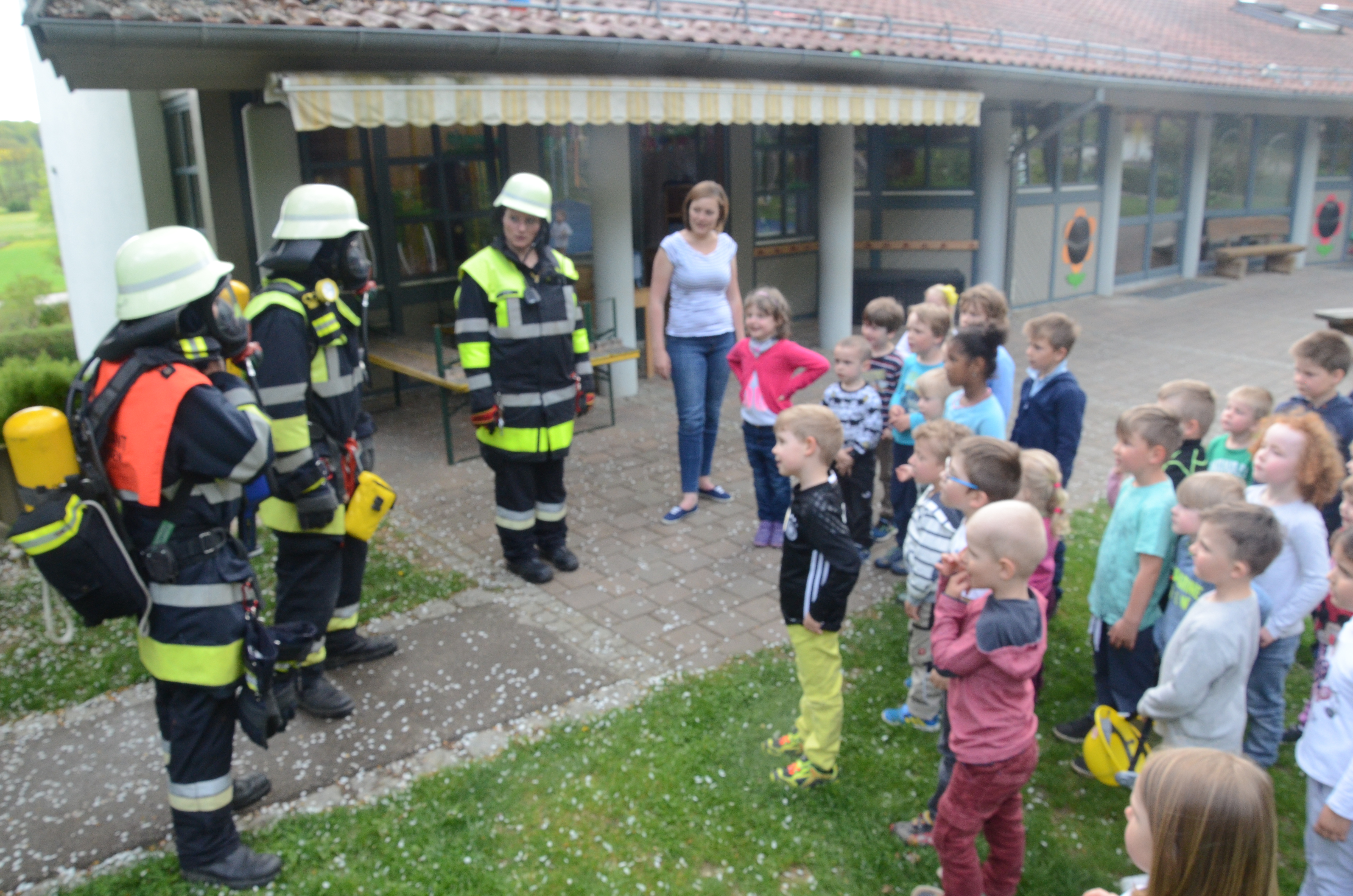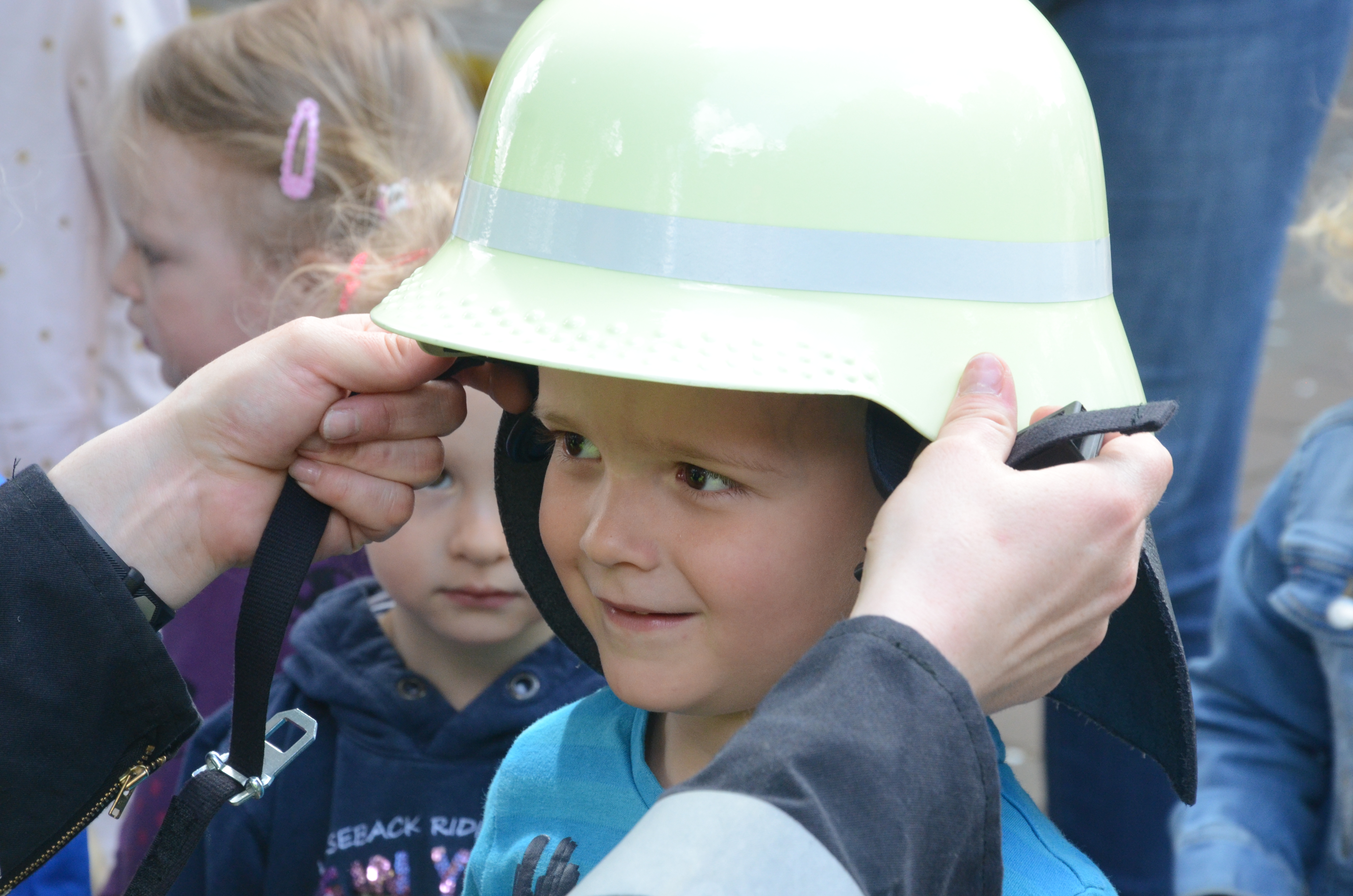 Die Kindergarten-Kinder waren indes nicht nur neugierig, sondern hellauf begeistert von dem Besuch der Feuerwehrler. Schließlich durften sie nicht nur die Übung anschauen, sondern die Ausrüstung begutachten und probeweise den Helm aufsetzen.