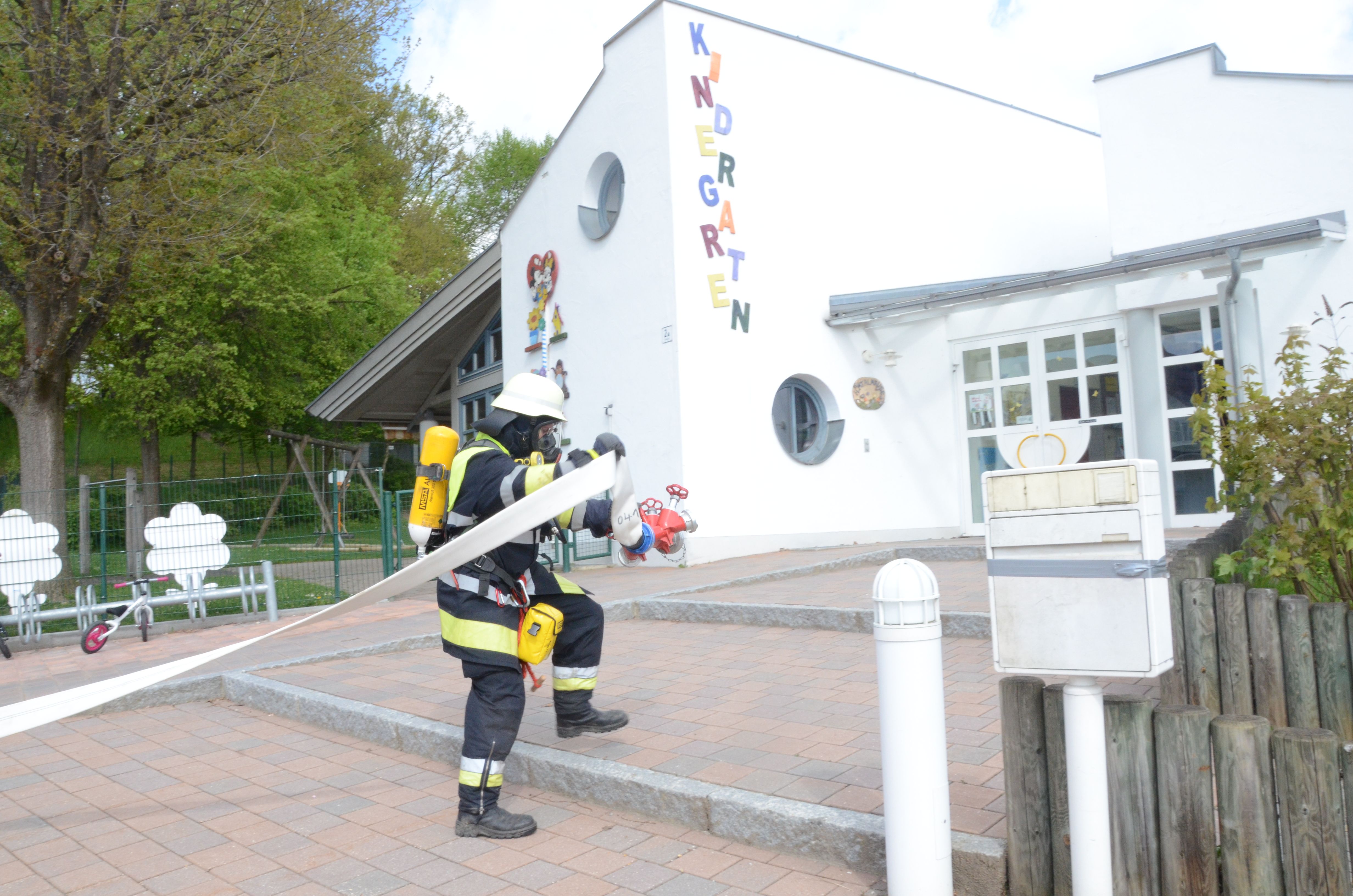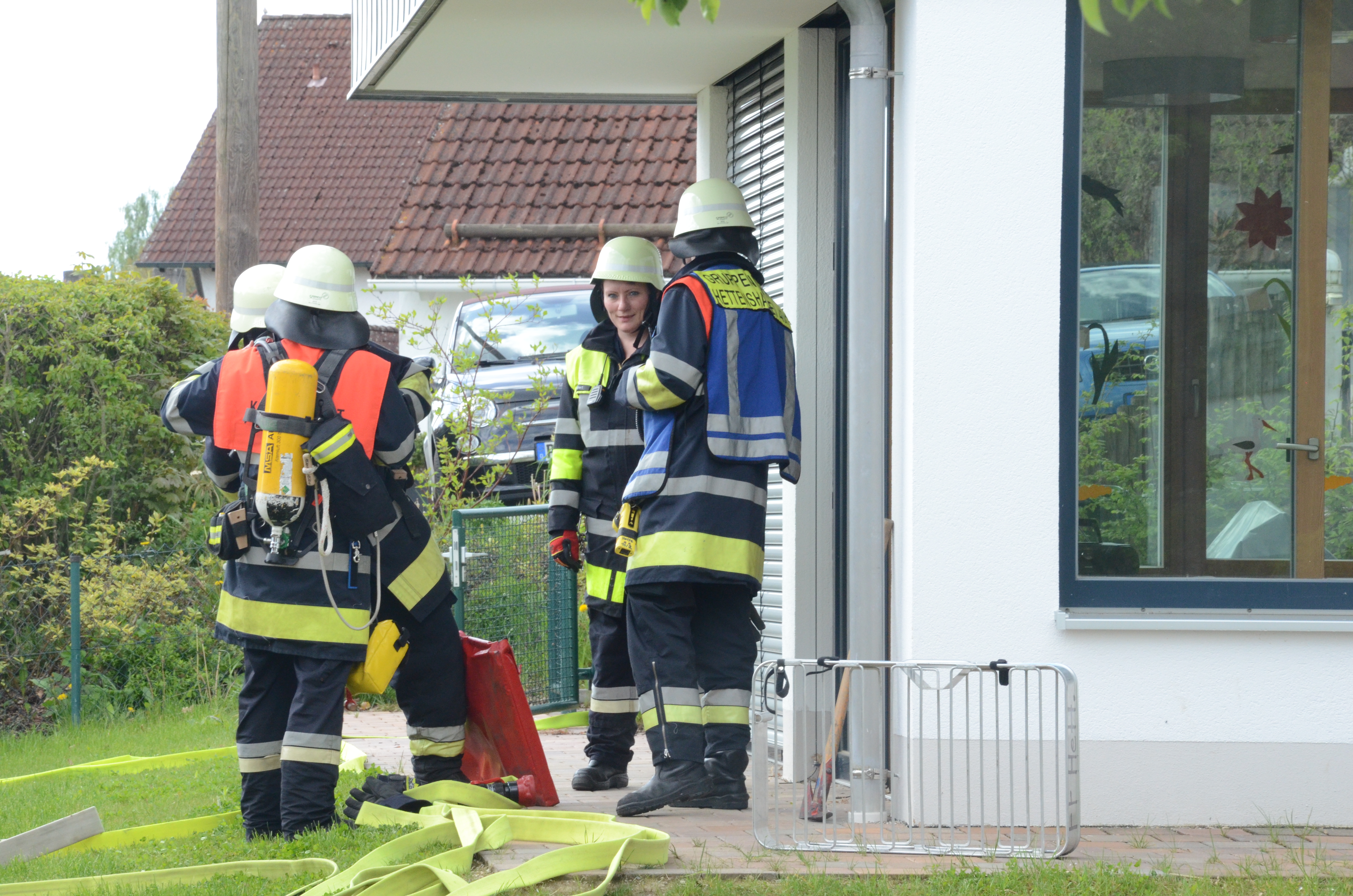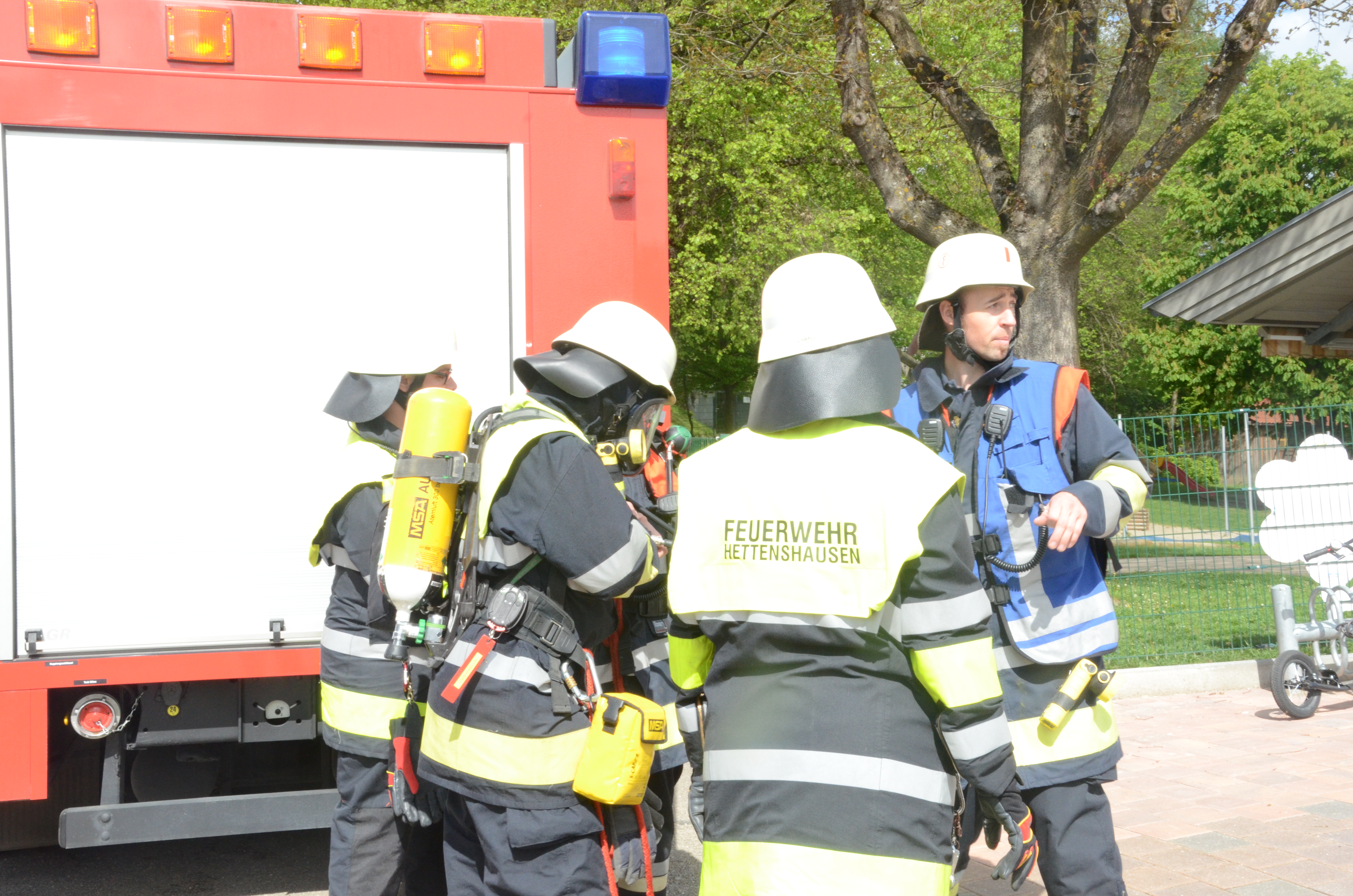 Auch in der Hettenshausener Kinderkrippe fand heute Vormittag eine solche Übung statt. Dort allerdings war die Begeisterung für die in voller Montur angerückten Floriansjünger bei einigen Sprösslingen eher gering. Im Gegenteil: Mancher Pimpf war offenbar, so wurde uns berichtet, etwas überfordert mit der Situation und den Tränen nahe.