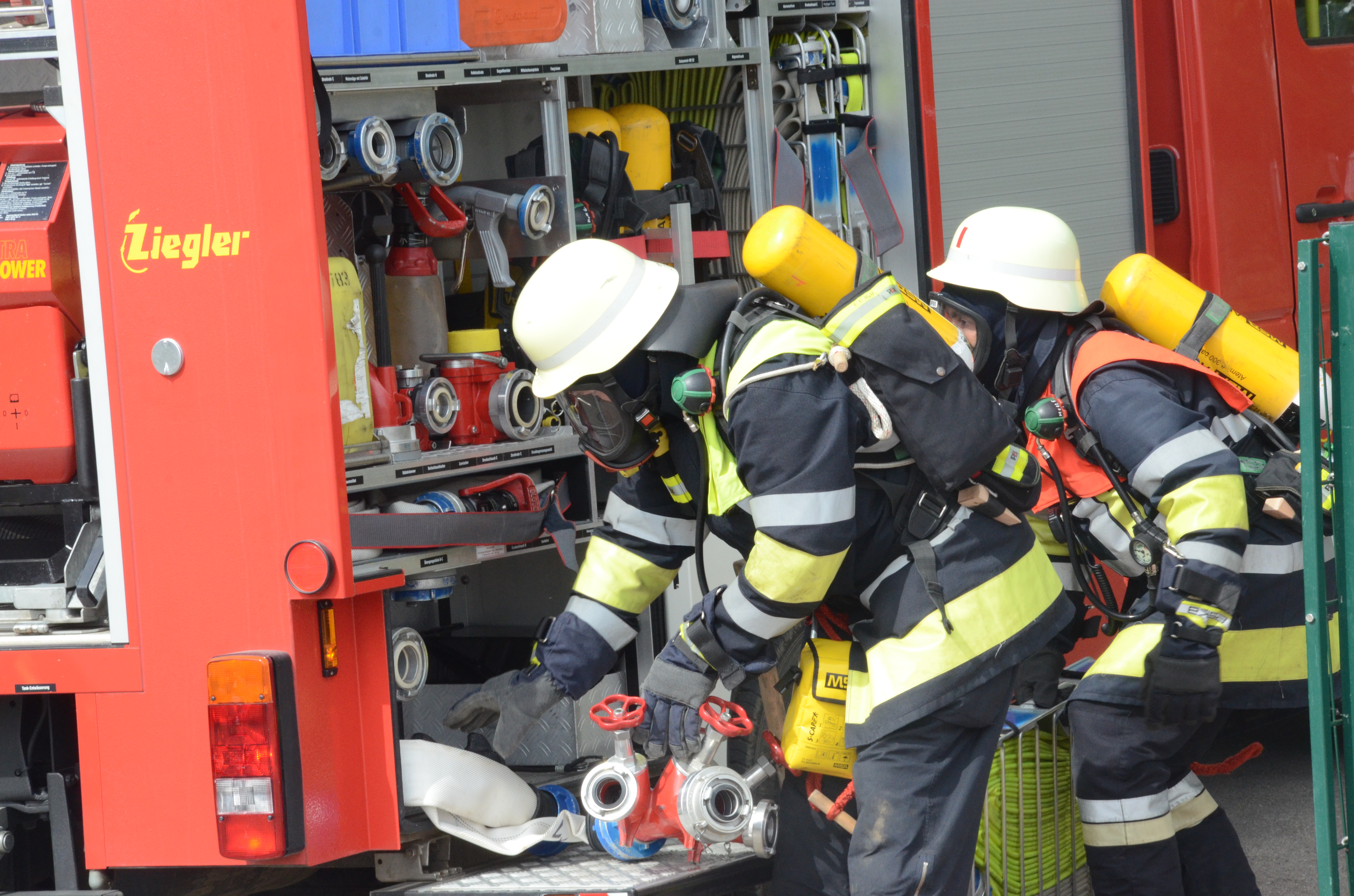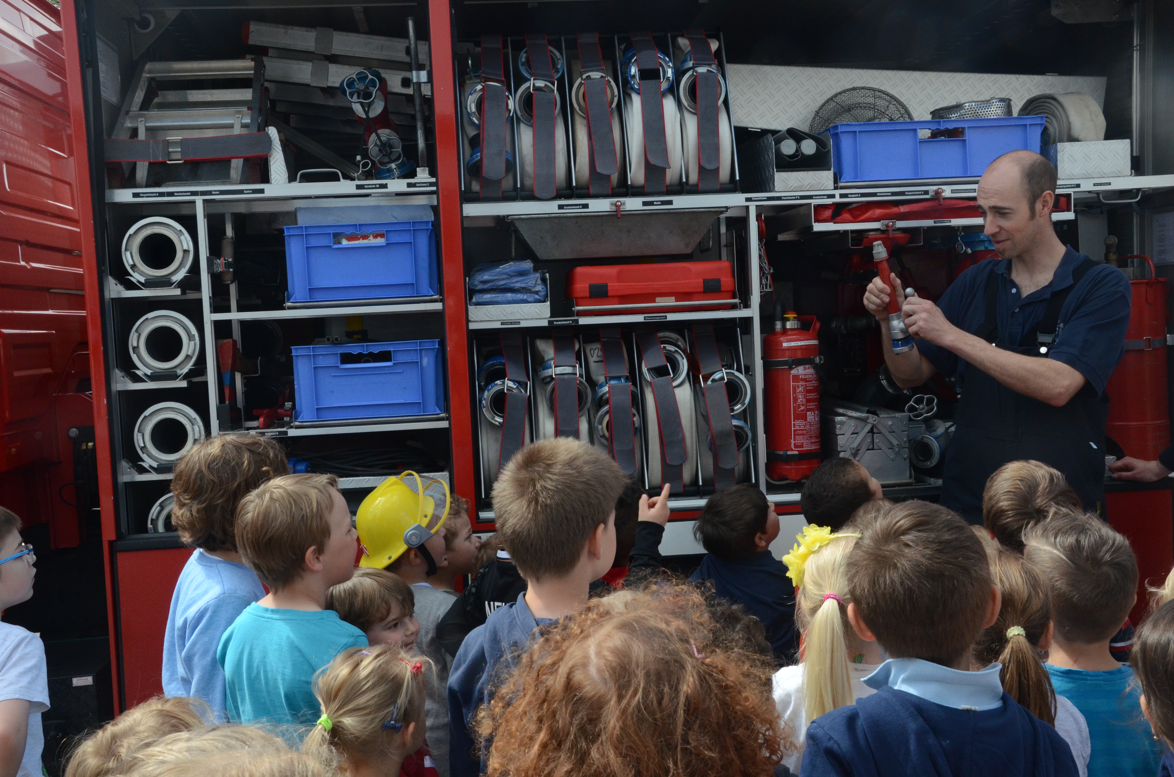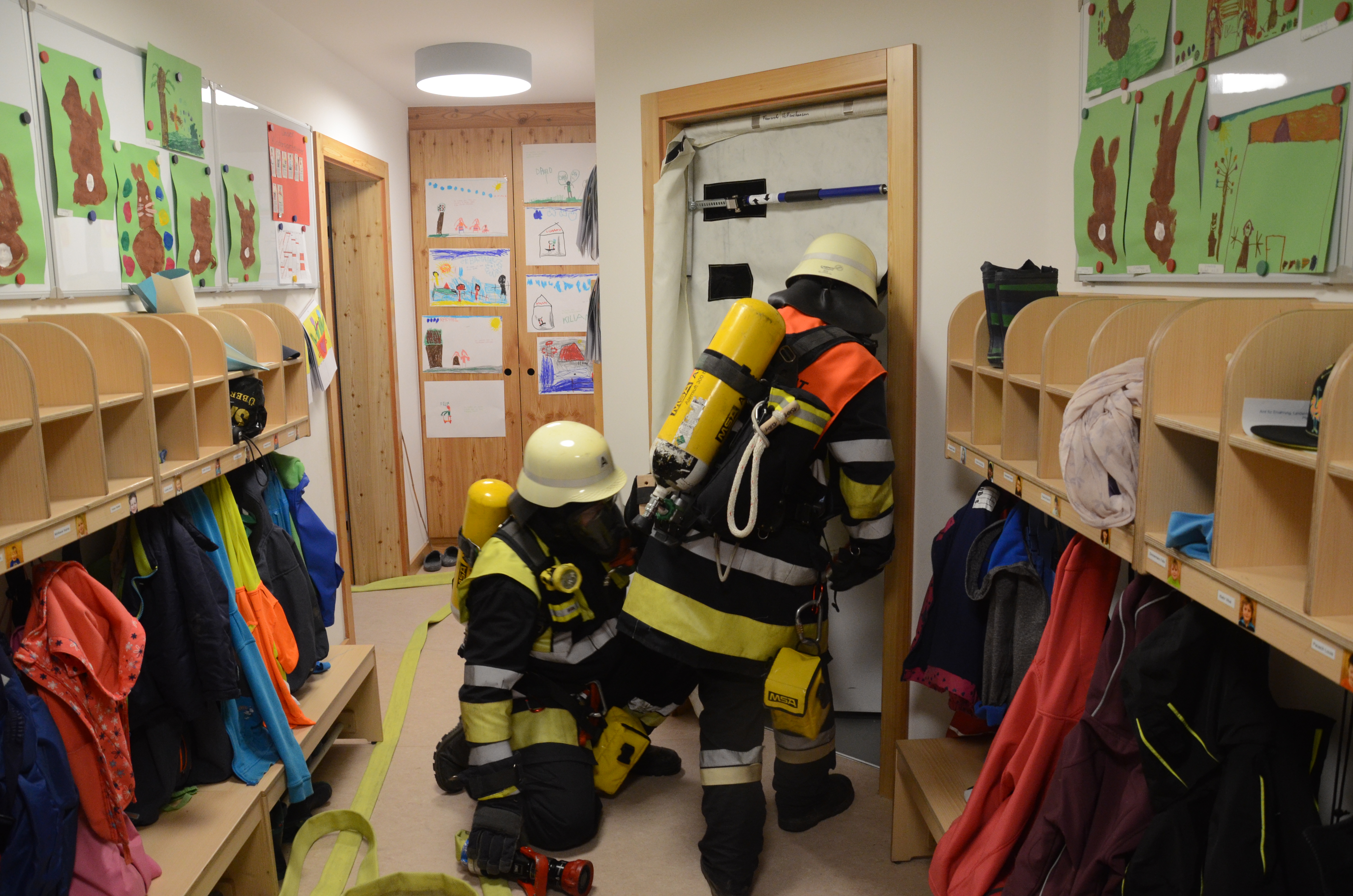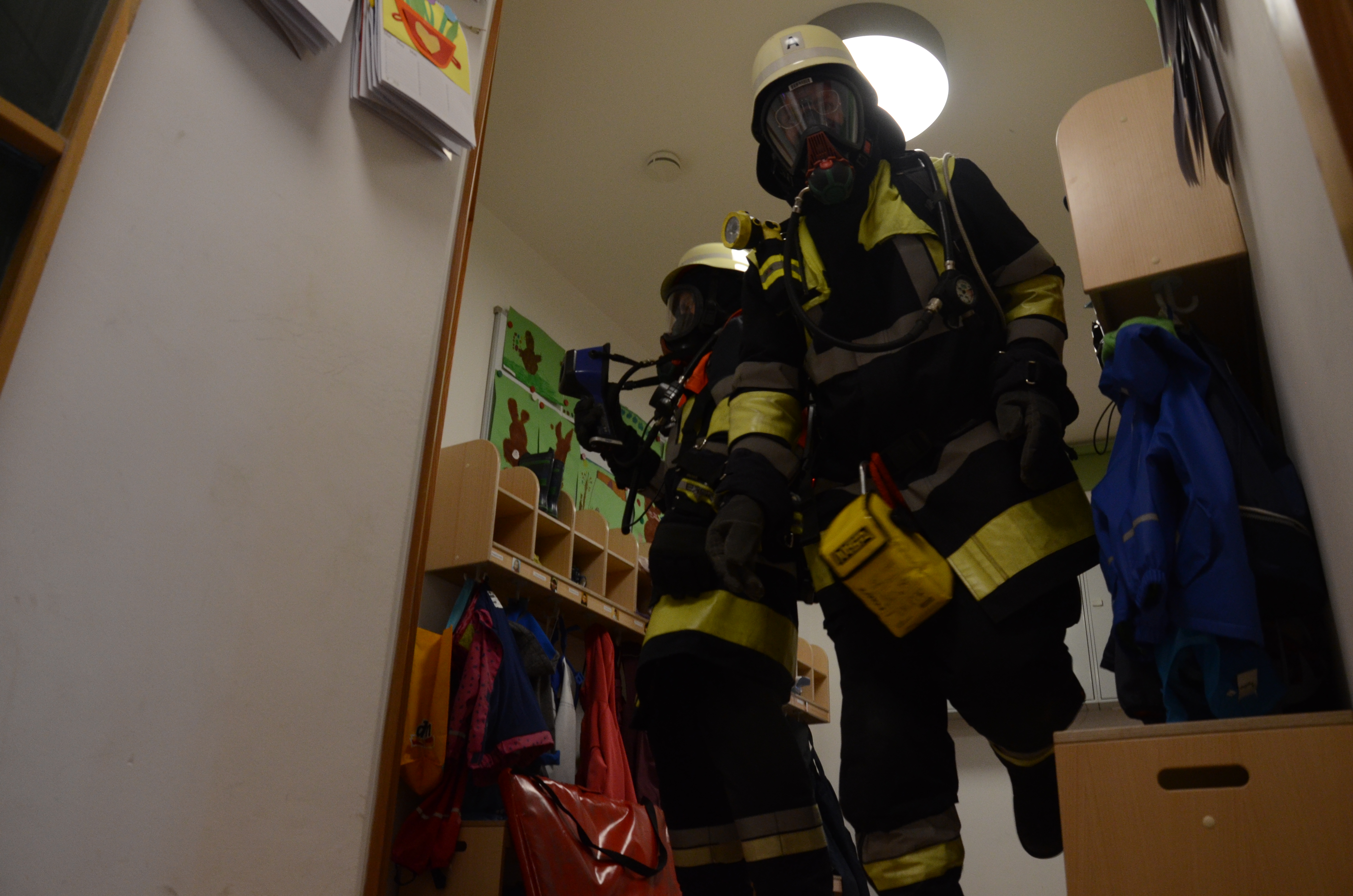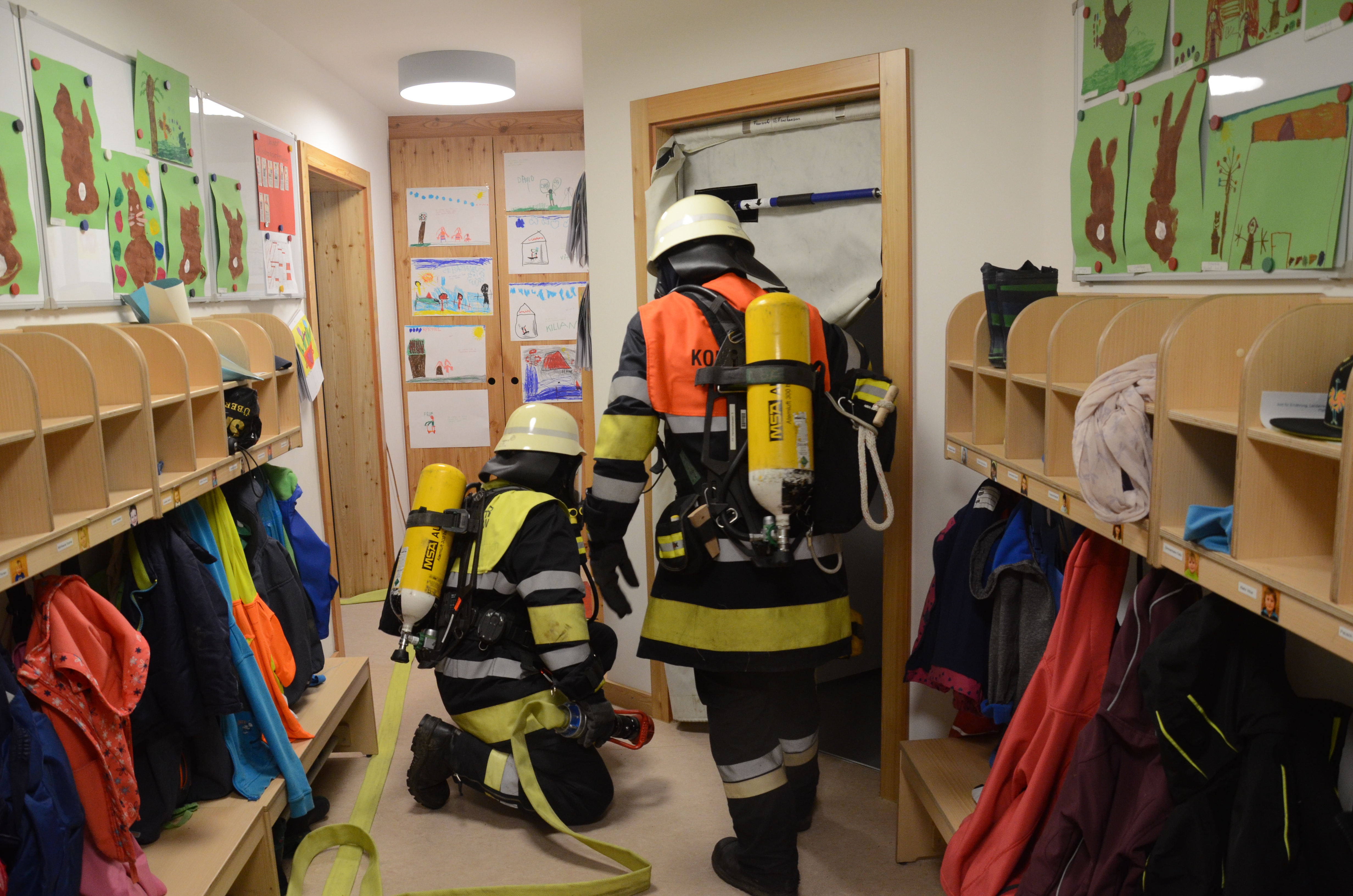 Evakuierung wurde geübt, Feuerwehr rückte zur Übung an: Die Buben und Mädchen konnten sich alles ganz genau anschauen. Mit großer Bilder-Galerie.