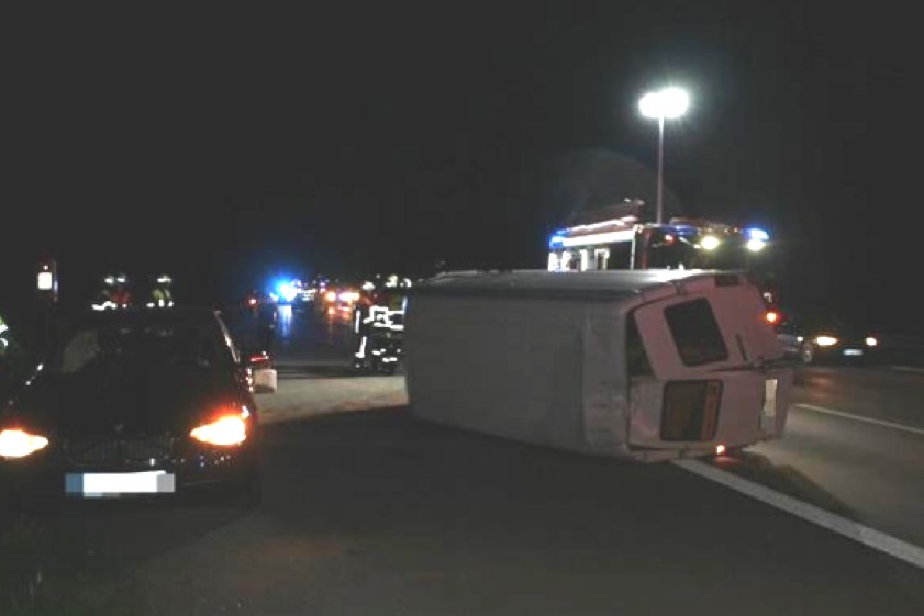 Nach diesem Aufprall schleuderte der Porsche laut Bericht der Polizei gegen die linke Seite des Sprinters. Dessen 49-jähriger Fahrer verlor daraufhin die Kontrolle über seinen Kleintransporter, der nach rechts weg schleuderte, sich zunächst quer stellte und letztlich auf die linke Seite kippte. „Etwa 50 Meter weiter kam der Sprinter dann auf dem rechten Fahrstreifen liegend zum Stillstand“, so ein Polizei-Sprecher.