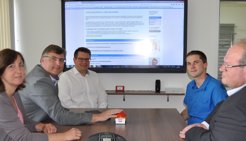 Der Dachauer Landrat Stefan Löwl gab gemeinsam mit Cornelia Stadler, der Verantwortlichen für E-Government, Ulrich Wamprechtshammer (Verantwortlicher für Personalgewinnung und -entwicklung), Ausbildungsleiter Andreas Zigldrum und Gerhard Weber (Abteilungsleiter Zentrale Angelegenheiten), das neue Bewerberportal des Landratsamts Dachau frei.