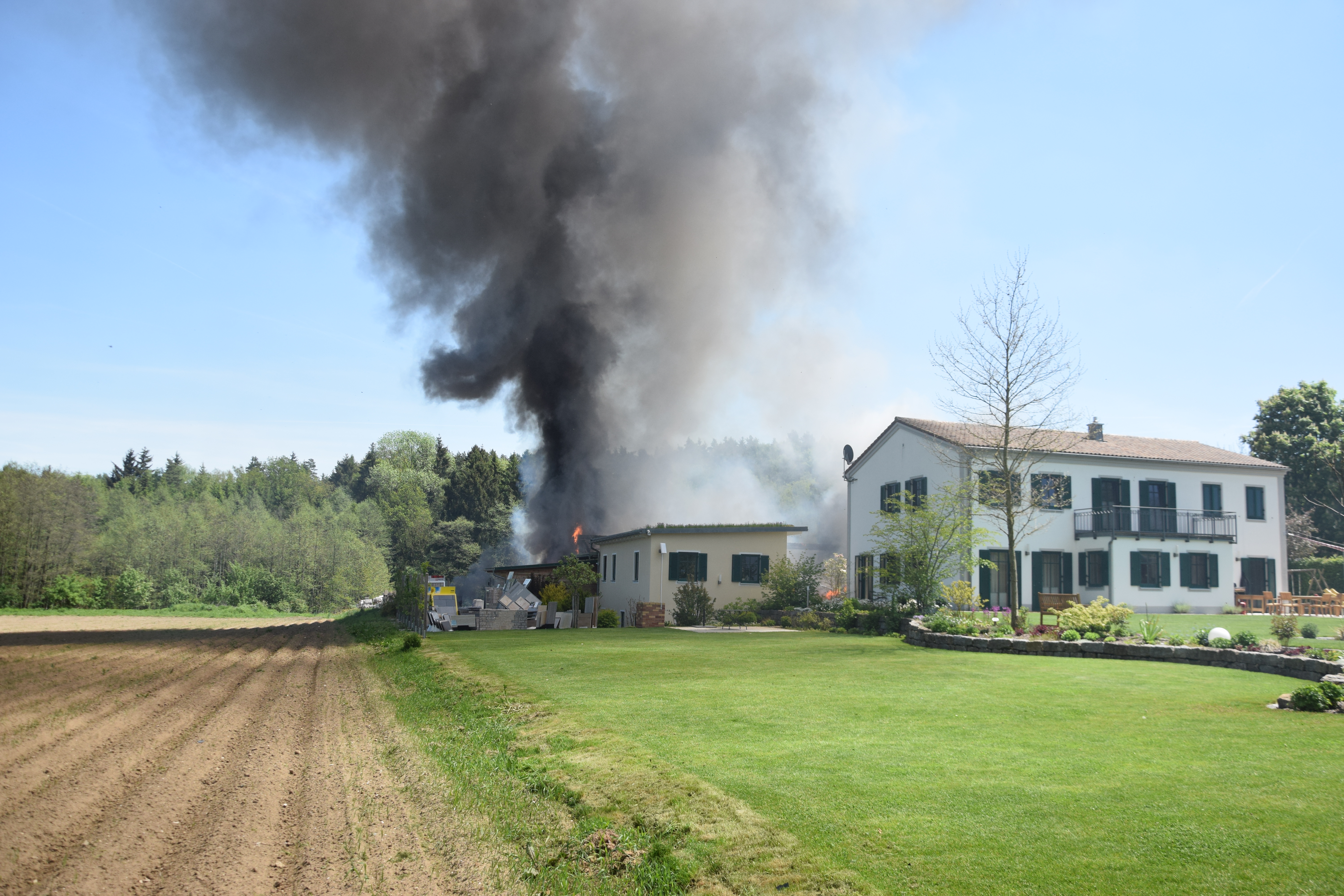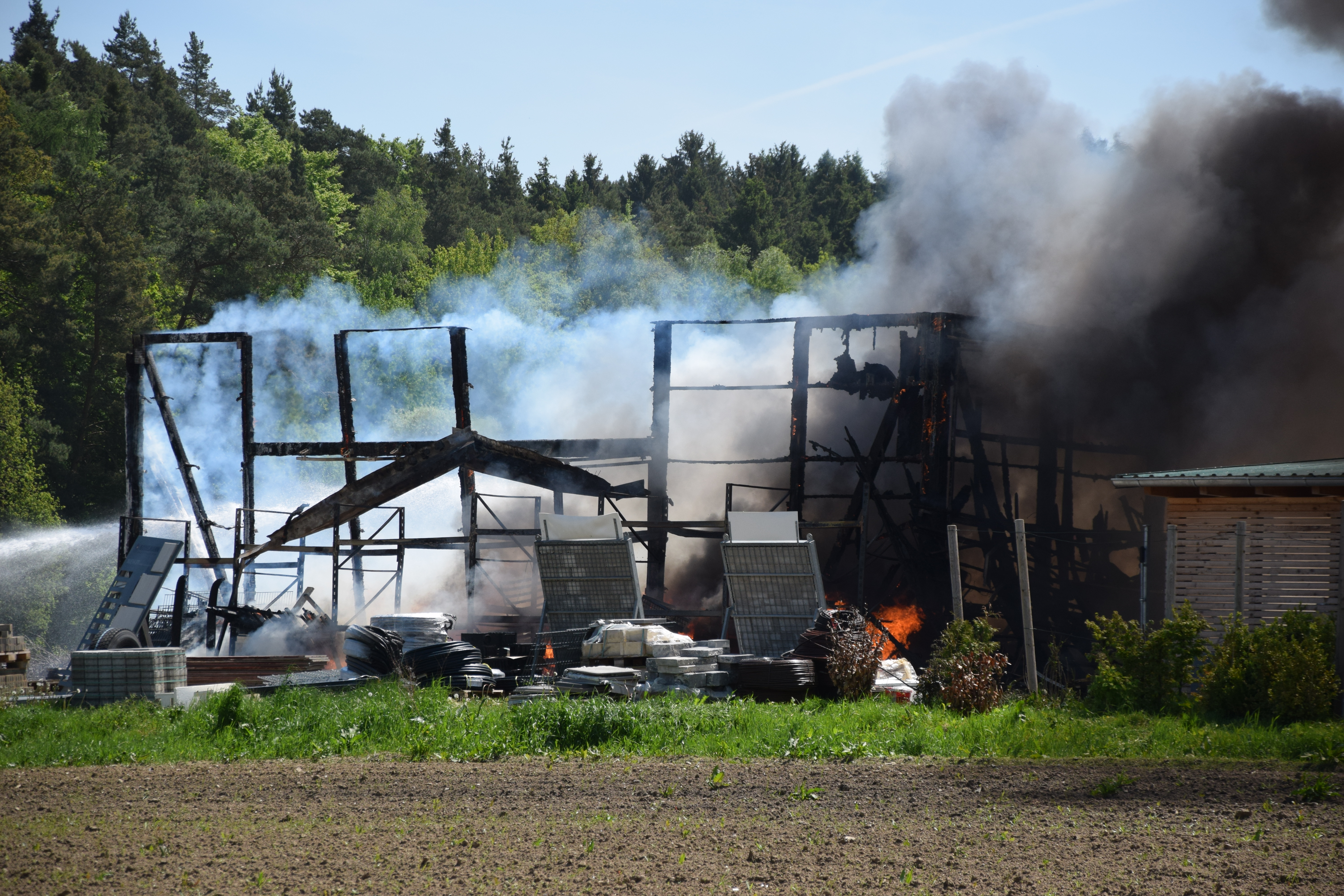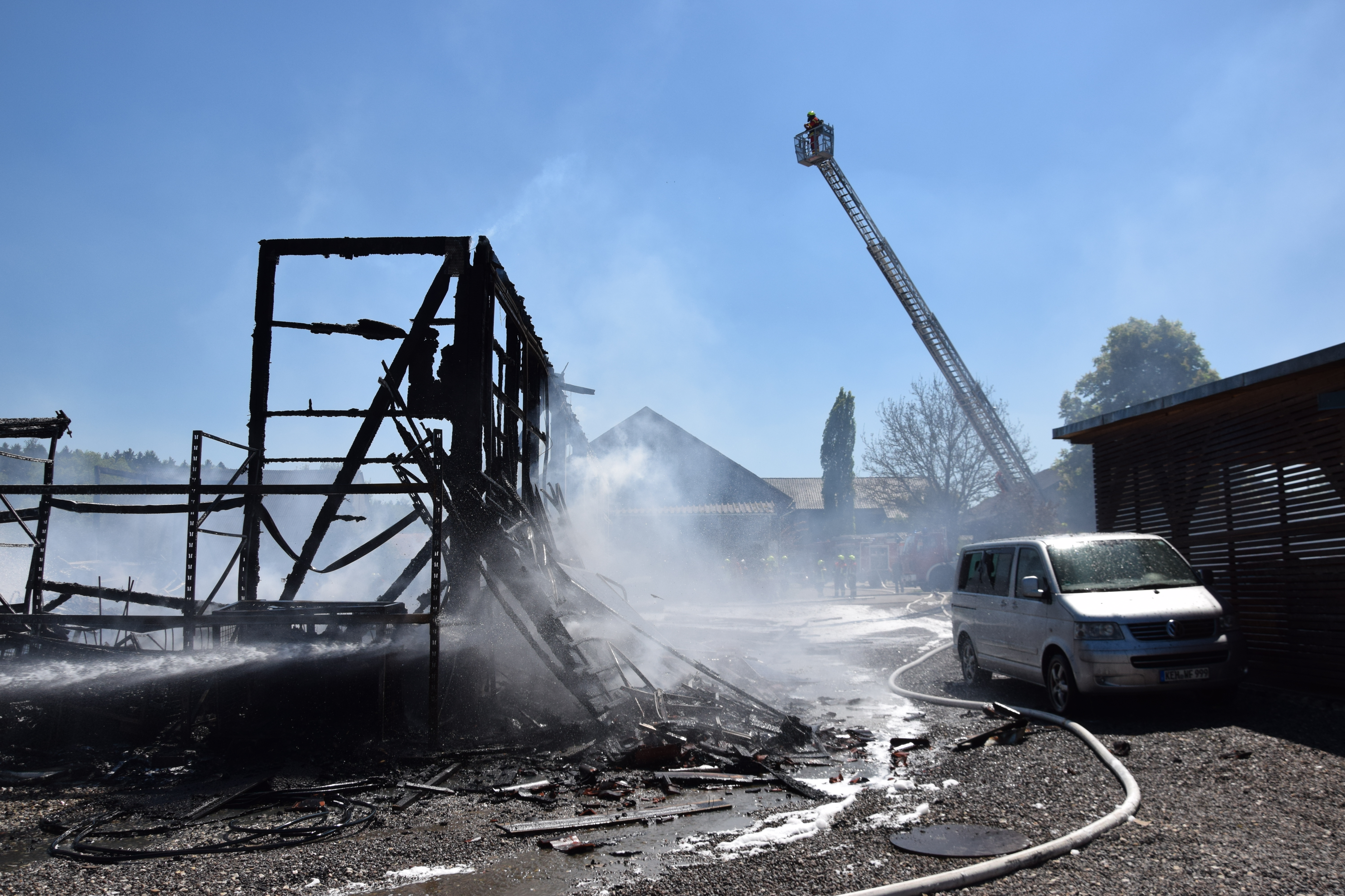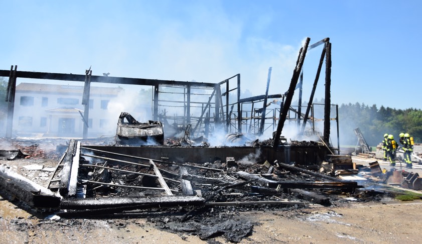Als die Floriansjünger auf dem Einödhof eintrafen, stand das etwa 15 auf 25 Meter große Gebäude bereits in Vollbrand, es brannte letztlich bis auf die Grundmauern nieder. „Die örtlichen Feuerwehren konnten ein Übergreifen des Feuers auf benachbarte Gebäude verhindern“, so ein Sprecher des Polizeipräsidiums.