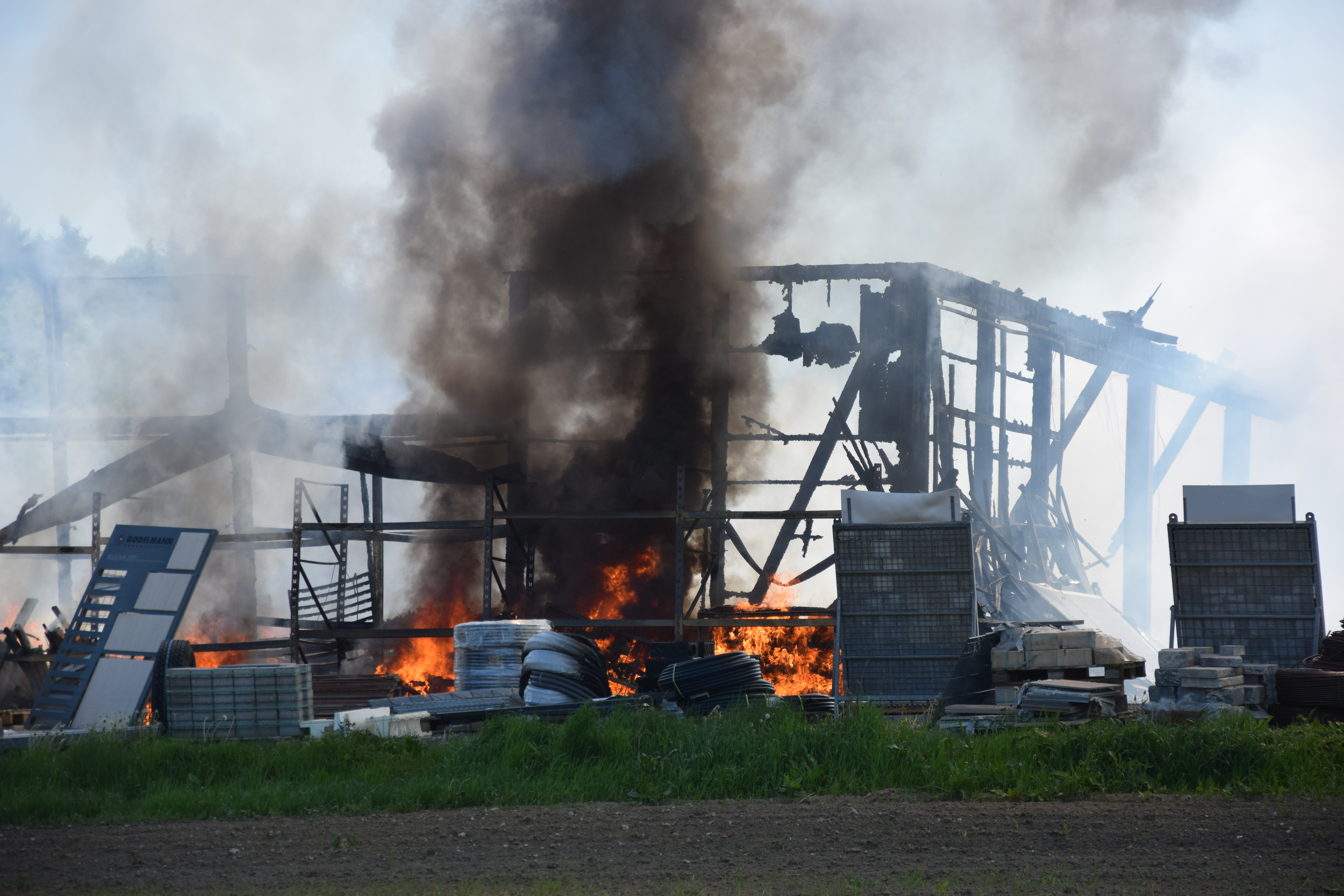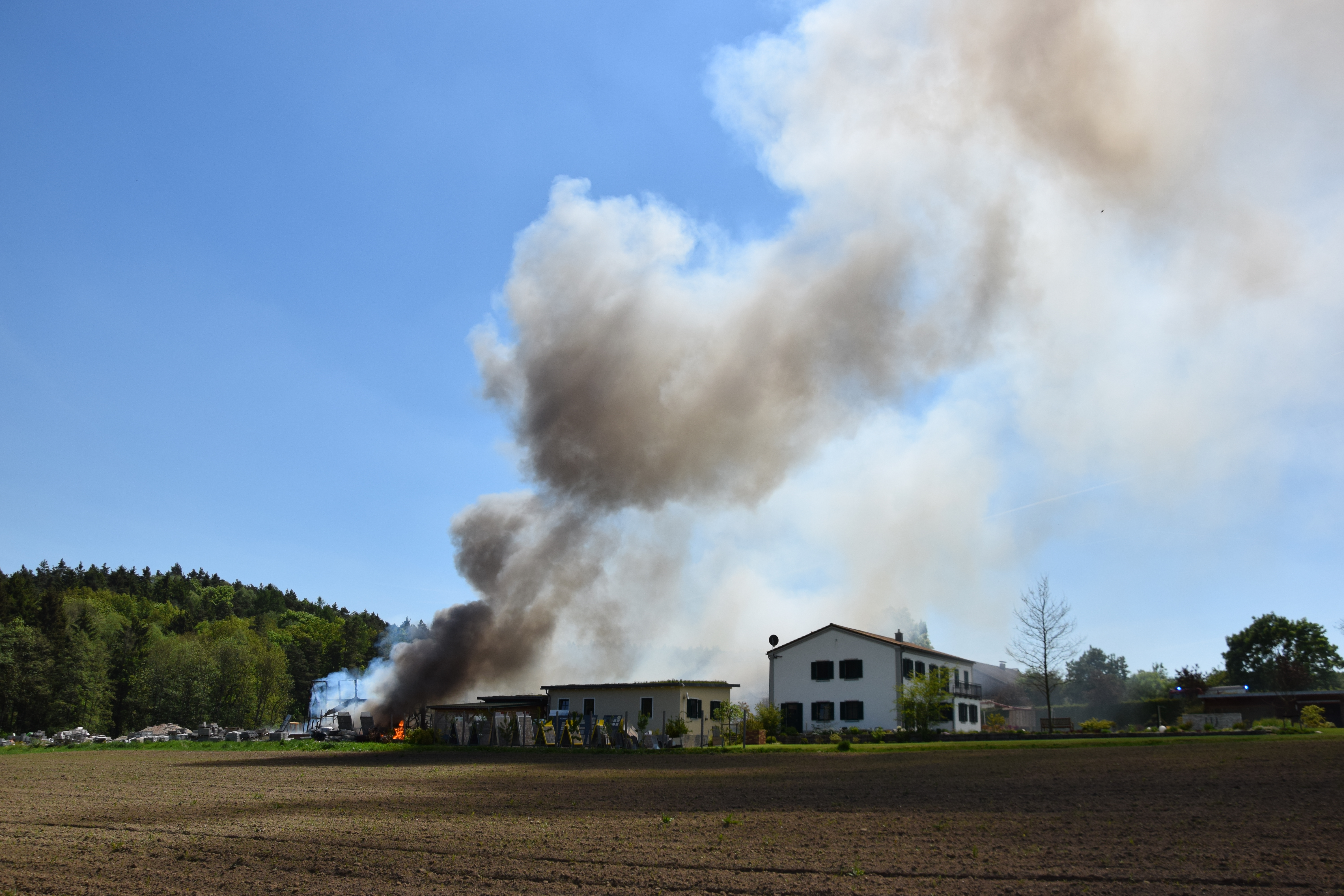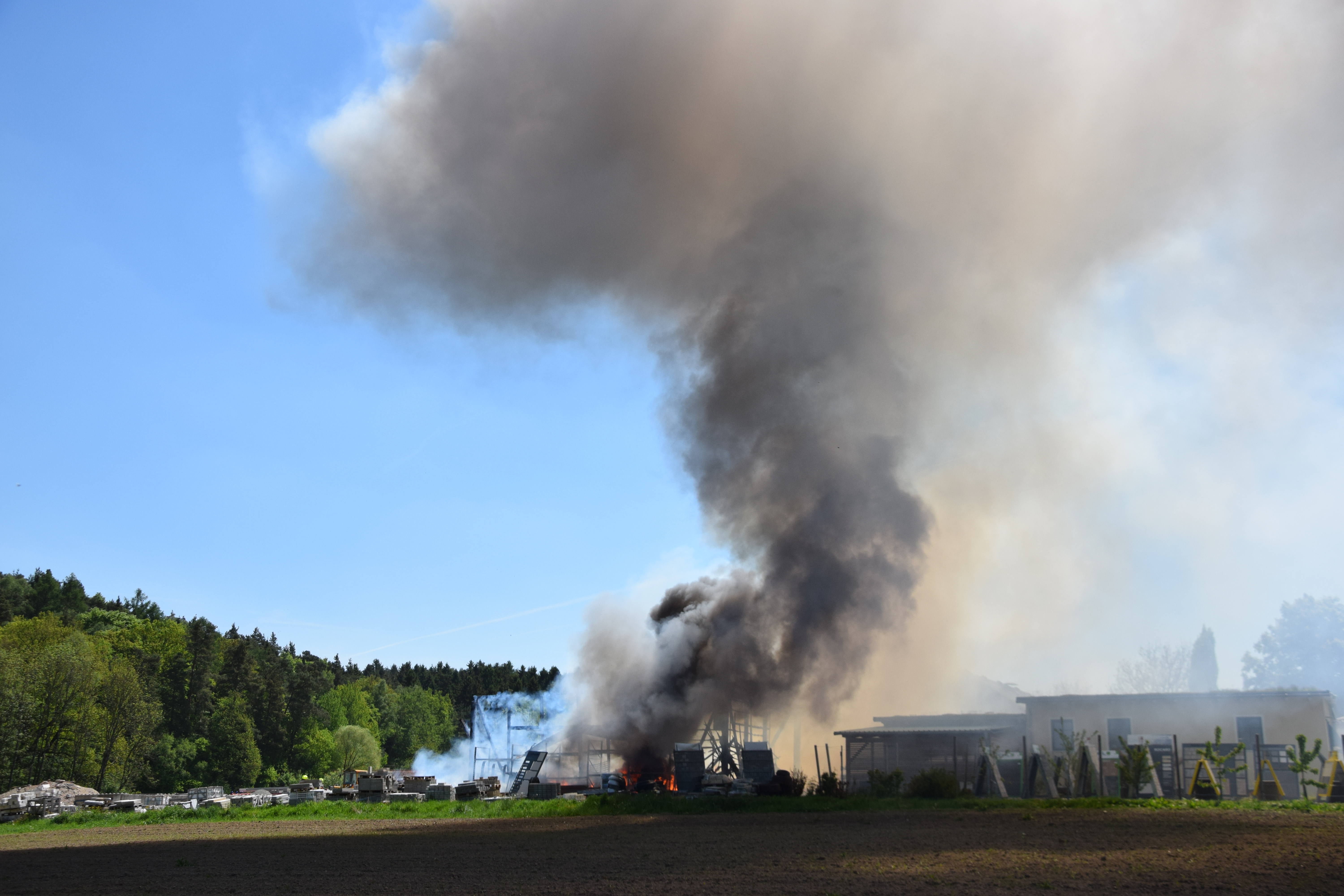 Gegen 12.50 Uhr war dem Polizeipräsidium Niederbayern der Brand der Lagerhalle mitgeteilt worden, zahlreiche Einsatz und Rettungskräfte rückten an. Schon aus kilometerweiter Entfernung war eine mächtige Rauchwolke zu sehen.