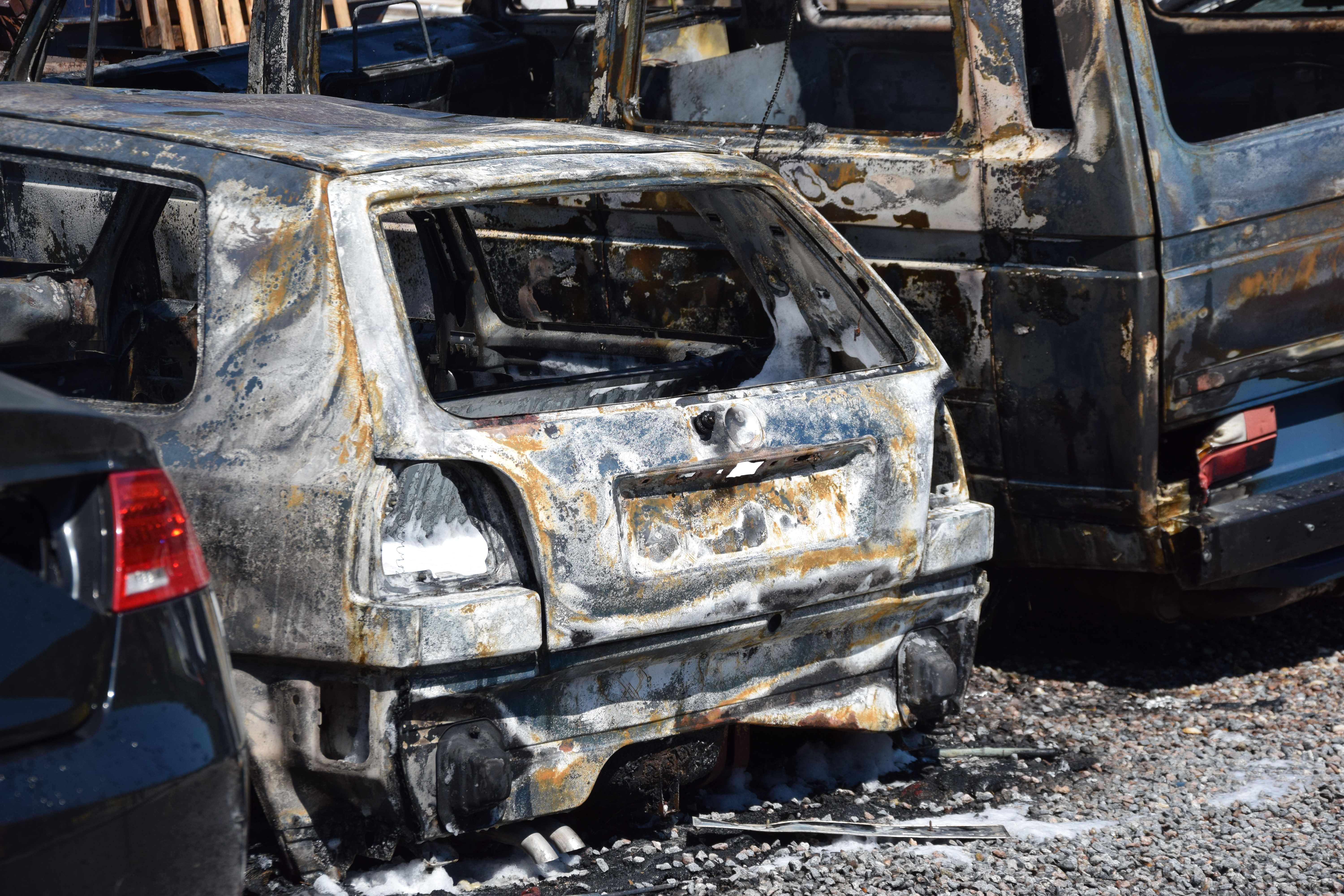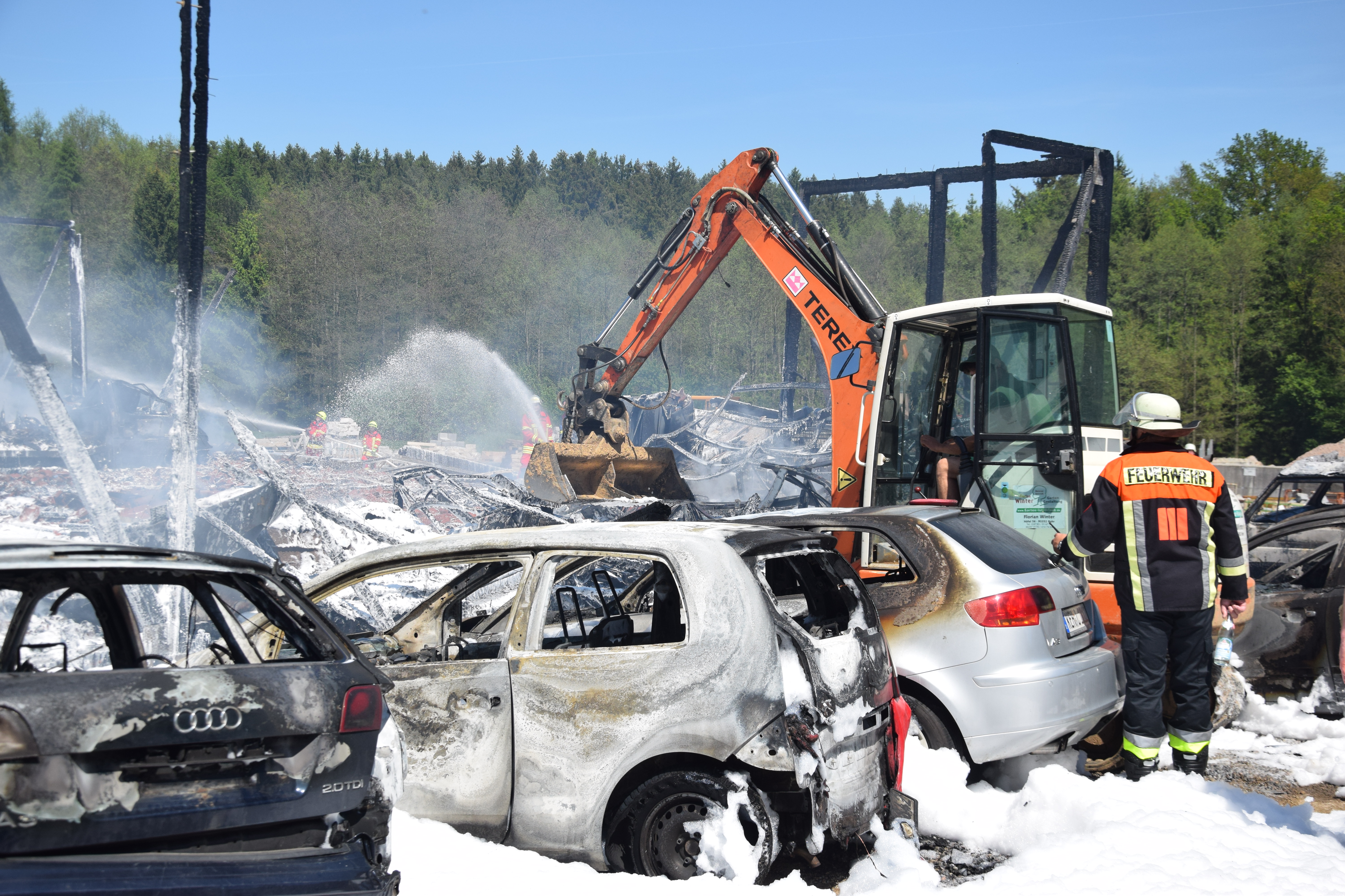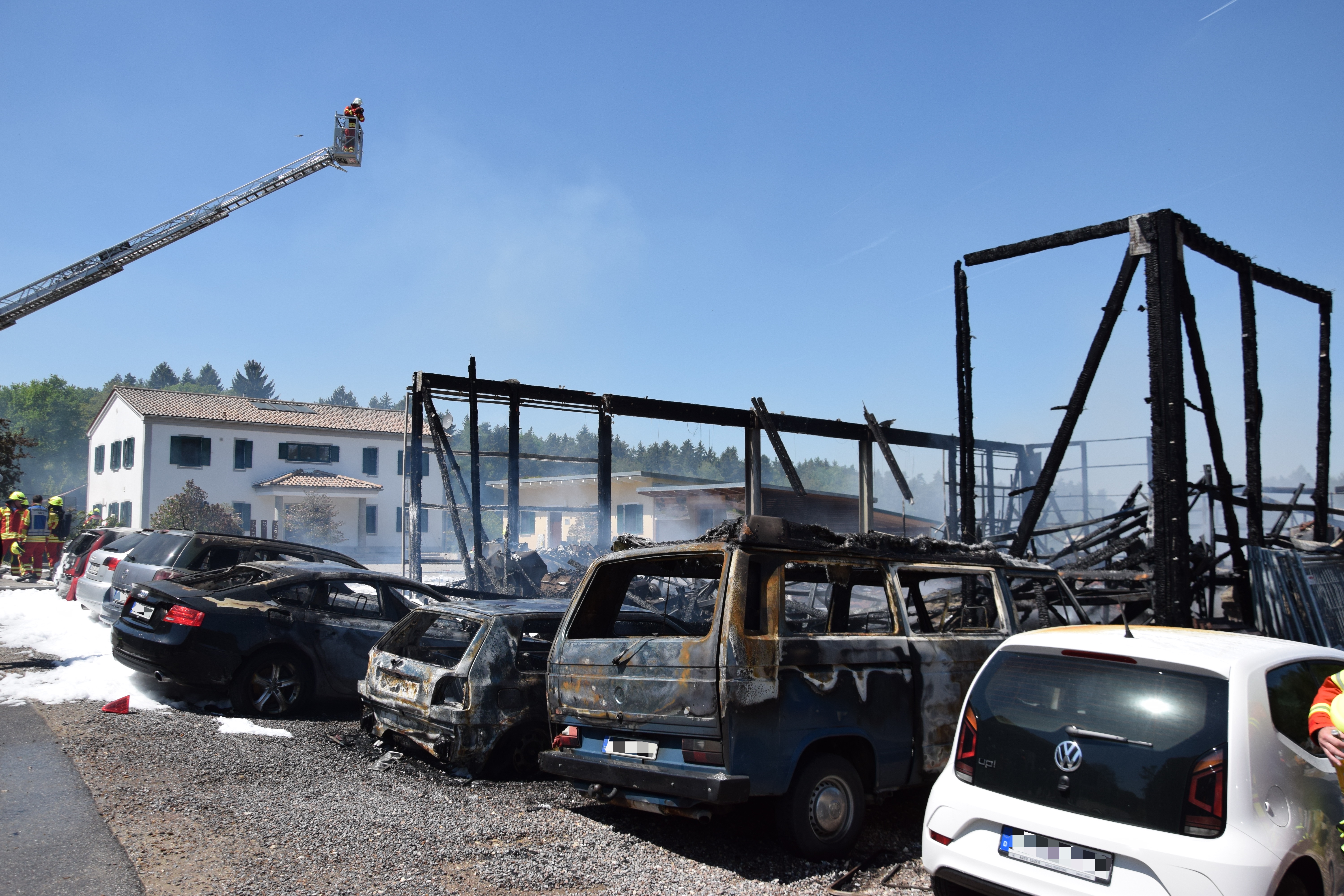 Durch das Feuer wurden auch mehrere vor der Halle geparkte Fahrzeuge zum Teil komplett beschädigt. Nach ersten Schätzungen der Polizei wird der Sachschaden in einer Größenordnung von 600 000 Euro angesiedelt hat.