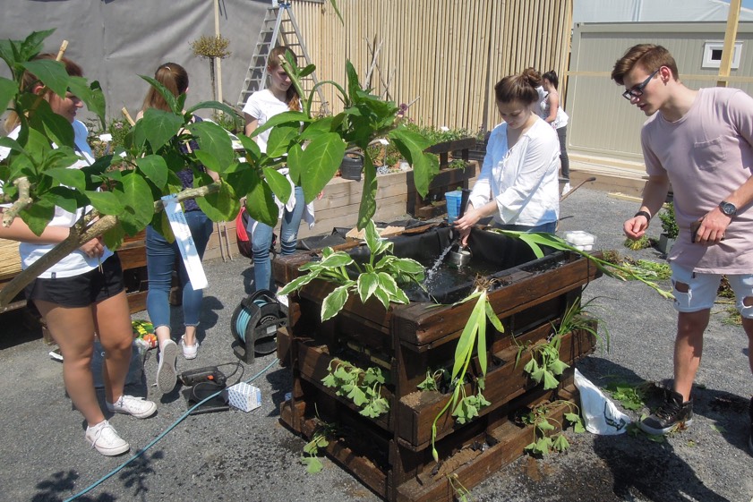 Das ist das Ergebnis einer gemeinschaftlichen Arbeit von 15 P-Seminar-Teilnehmern der elften Jahrgangsstufe des Schyren-Gymnasiums Pfaffenhofen. Das Seminar „Urban Gardening“ beschäftigt sich mit städtischem Gärtnern in Verbindung mit Paletten, wodurch Pflanzenanbau auf kleinstem Raum ermöglicht wird. Um das Thema Nachhaltigkeit zu fördern, wurden die verwendeten Pflanzen unter anderem mit Hilfe einer „Pflanzenbörse“ an der Schule erworben.
