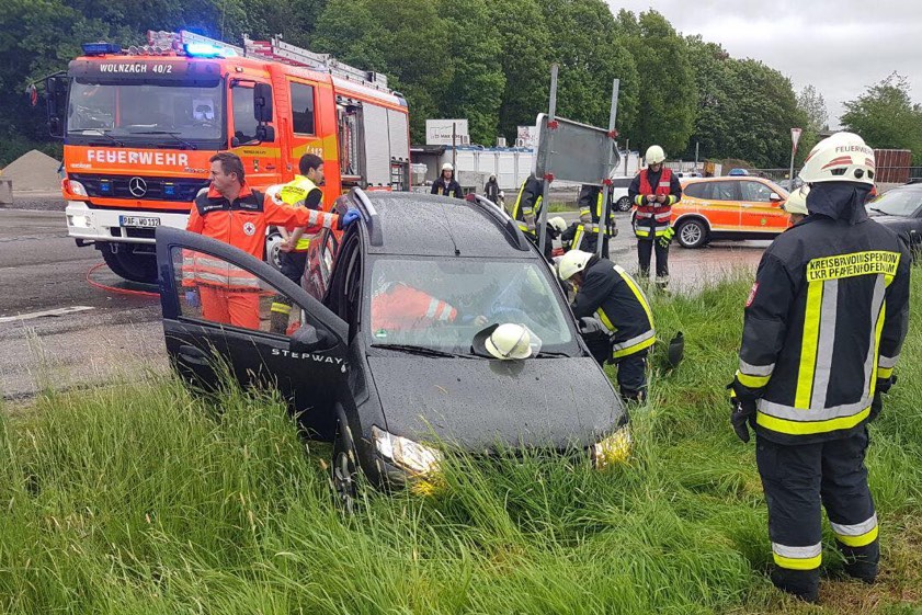 Heftiger Zusammenstoß zweier Pkw auf der Kreisstraße PAF 8 bei der Abfahrt von der Autobahn-Rastanlage – Eine Person eingeklemmt.