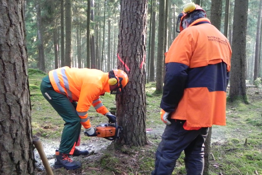 Seit Januar dieses Jahres gibt es eine neue Unfallverhütungsvorschrift, auf welcher die Kurse aufbauen. Bevor es jedoch an die Baumfällung geht, werden Kenntnisse zur Instandhaltung der Motorsäge und vor allem das Schärfen der Kette geübt, damit die Motorsäge gut schneidet. Am Praxistag wird der sichere Umgang mit der Motorsäge im Nadelwald geübt: Die Kursteilnehmer werden zuerst Trennschnitte am liegenden Holz und Fäll-Schnitte an einem Baumstumpf üben, bevor jeder Teilnehmer selber mindestens einen Baum mit der Haltebandtechnik fällt.