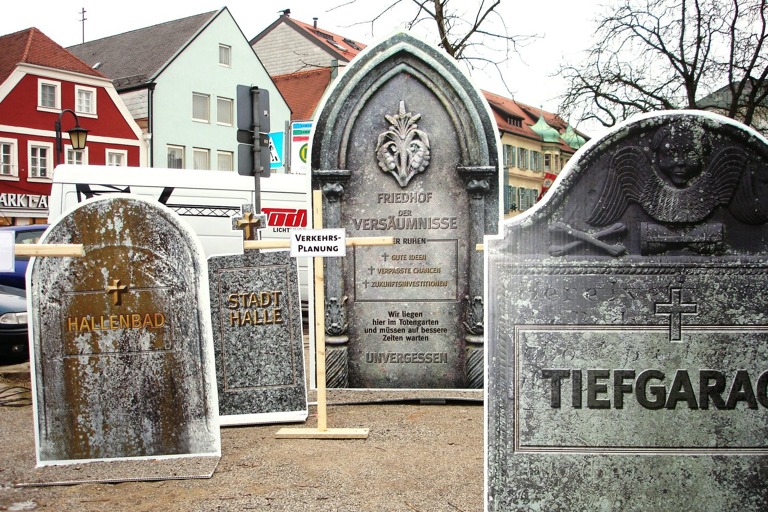 Ein Grabspruch am Eingang des Friedhofs sollte, so hatte sich die SPD das ausgedacht, Hoffnung geben, dass nicht alle Projekte für immer und ewig gestorben sein müssen: „Wir liegen hier im Totengarten und müssen auf bessere Zeiten warten", stand da, während in den umliegenden Gräbern zum Beispiel die Verkehrsplanung, das Hallenbad und die Innenstadt beerdigt lagen. Ein Wahlkampf-Aufreger, der genauso gut von den Werbe-Machern von Media-Markt, Saturn oder Sixt hätte stammen können.