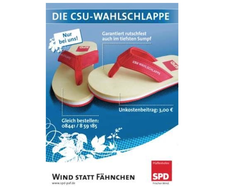 „Für Veronika Peters werden wir uns genauso etwas Passendes einfallen lassen“, prophezeit Käser im Gespräch mit unserer Zeitung. Es waren damals aber nicht nur Grabsteine und Senftüten: Auf dem Wochenmarkt wurde die mittlerweile in ganz Bayern bekannte „CSU-Wahlschlappe“ verteilt: Badelatschen mit SPD-Logo.