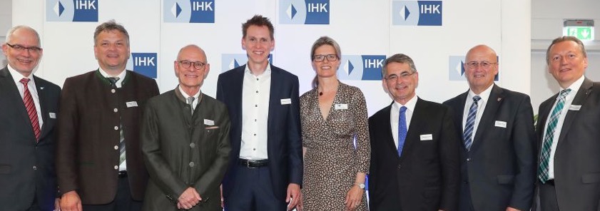 Premiere für den IHK-Wirtschaftsempfang in der Region Ingolstadt in der IHK-Geschäftsstelle Ingolstadt: Peter Kammerer (von links, Vize-Hauptgeschäftsführer der IHK für München und Oberbayern), Neuburg-Schrobenhausens Landrat Roland Weigert, Fritz Peters (Sprecher des IHK-Forums der Region Ingolstadt), Frank Busemann, Elke Christian (Leiterin der IHK-Geschäftsstelle Ingolstadt), Eduard Kastner (Vorsitzender des IHK-Regionalausschusses Pfaffenhofen), Eichstätts Landrat Anton Knapp, Emmeran Hollweck (Vorsitzenderdes IHK-Regionalausschusses Eichstätt). Fotos: Stefan Bösl / IHK
