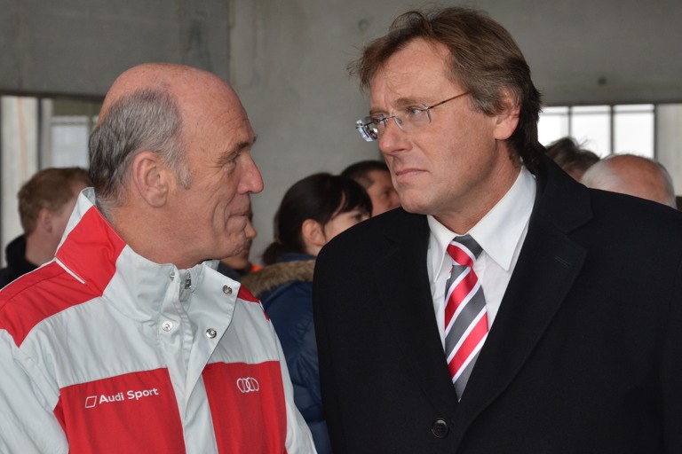 Nicht einmal die Kälte hat heute Mittag die Stimmung beim Richtfest für das neue Kompetenz-Zentrum für Motorsport von Audi vor den Toren von Neuburg trüben können. Prof. Ulrich Hackenberg, Vorstand für Technische Entwicklung beim Ingolstädter Autobauer, bezeichnete das Millionenprojekt in Neuburg als „integralen Bestandteil unserer globalen Investitionsstrategie“. Wolfgang Ullrich, der Leiter von Audi Sport, sieht einen „ganz wichtigen Schritt, um auch in Zukunft im Motorsport erfolgreich sein zu können“. Peter Mosch, der Gesamtbetriebsratschef von Audi, sprach von einem „klaren Bekenntnis zur Region Ingolstadt“. Und der Neuburger Oberbürgermeister Bernhard Gmehling betonte: „Die beachtliche Investition der Audi AG in Neuburg ist für uns die Wirtschaftsnachricht des Jahrzehnts.“