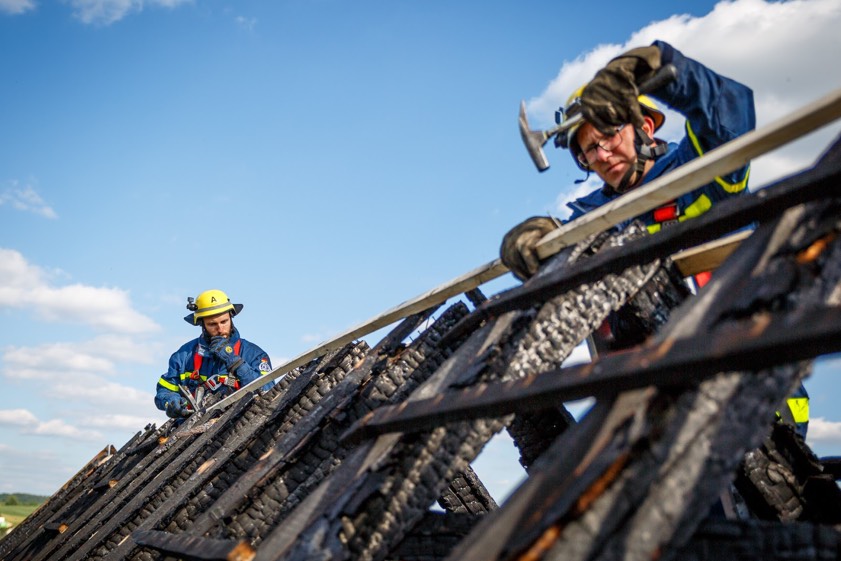 Das Pfaffenhofener THW war am gestrigen Abend mit rund 20 Mann bis zirka 21 Uhr damit beschäftigt, den Dachstuhl wieder soweit provisorisch zu reparieren, dass er mit einer Folie verschlossen werden konnte. (Foto: THW, Matthes)