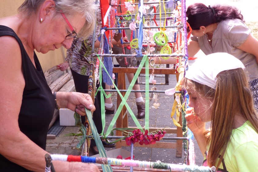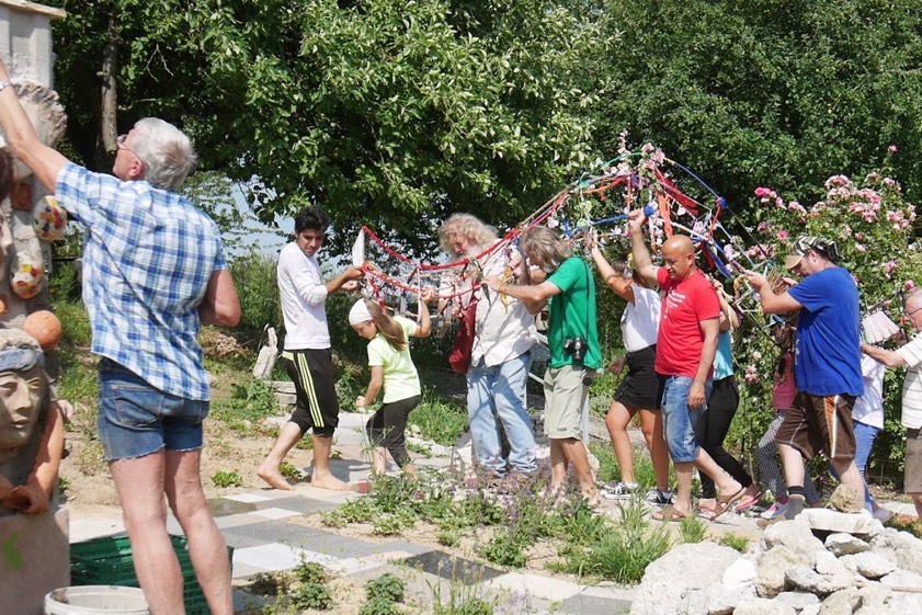 In Phase zwei, deren Umsetzung für die Zeit der momentan in Pfaffenhofen laufenden kleinen Landesgartenschau terminiert war, entstand das verbindende Element: ein filigraner, geschwungener und geschmückter Metallbogen. Mit wenigen Vorgaben entworfen und geschweißt wurde der vom Metallbildnermeister Klaus Grüger aus Scheyern. Das Schmücken mit zahlreichen bunten Bändern, Schnüren, Perlen, Draht, Kristallen und allerlei Mobile-artigem erfolgte in einer Gemeinschafts-Aktion von Jung und Alt und über alle Nationalitäten hinweg. „So waren zum Beispiel Afghanen, Kurden, Türken, Tunesier und Deutsche genauso einträchtig am Werke wie Flüchtlinge, Migranten, sonstige Zugereiste und Pfaffenhofener“, berichtet Mayer. Sie alle folgten dem Aufruf: „Bau mit am Tor zum Frieden!“