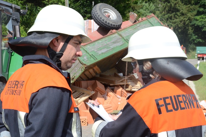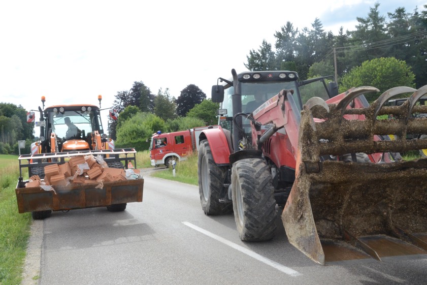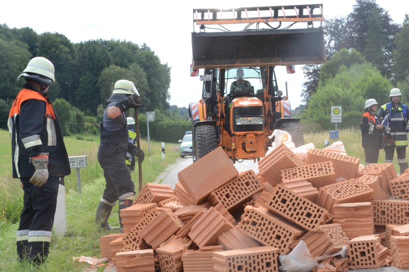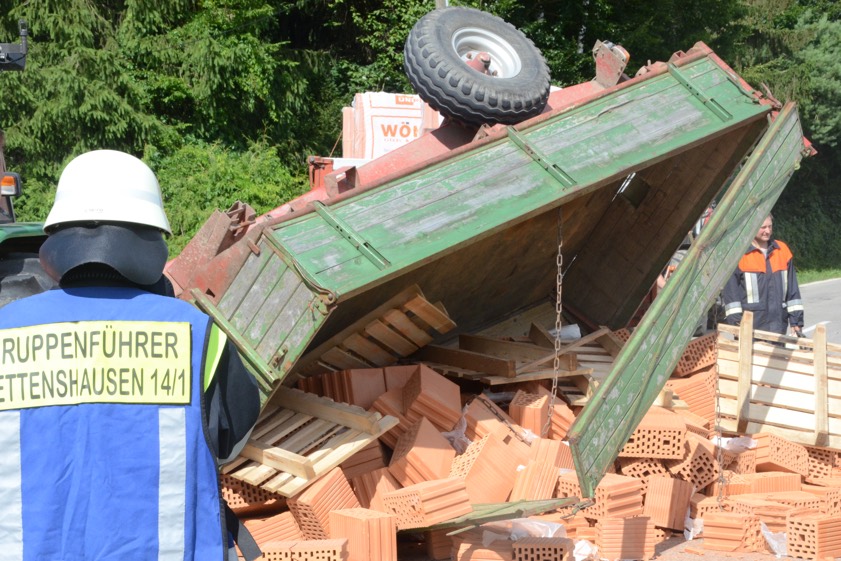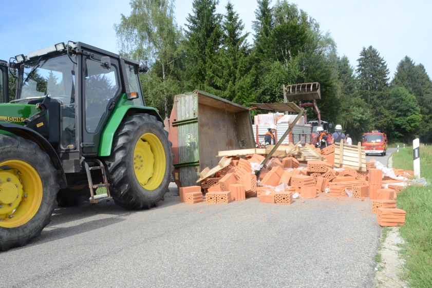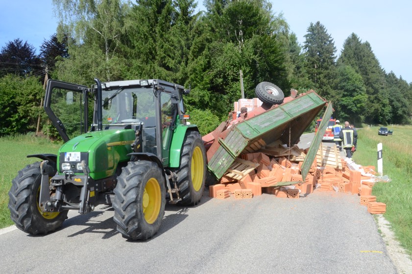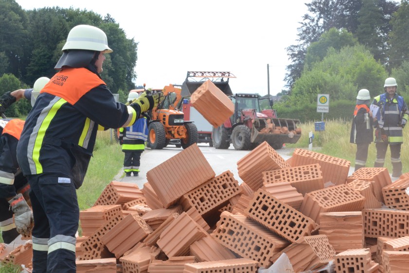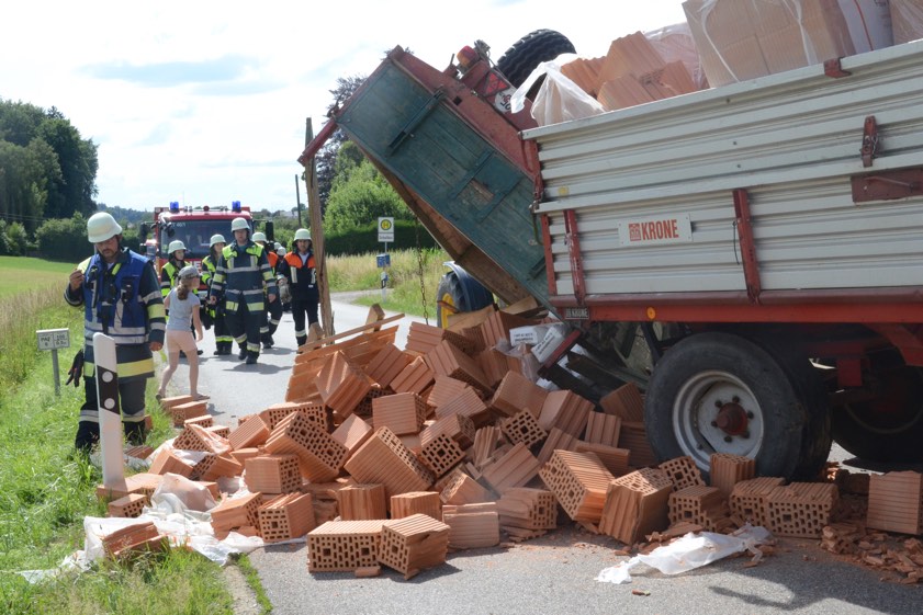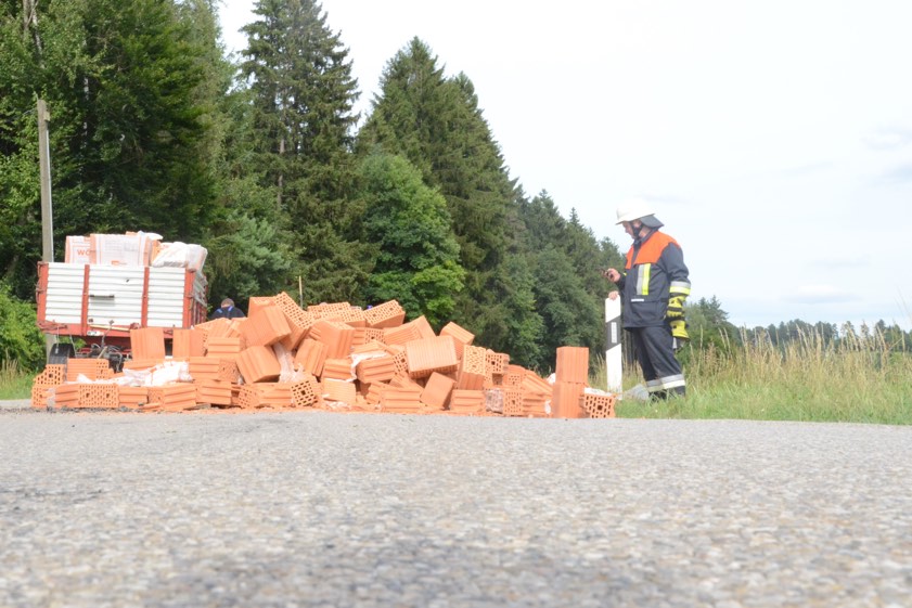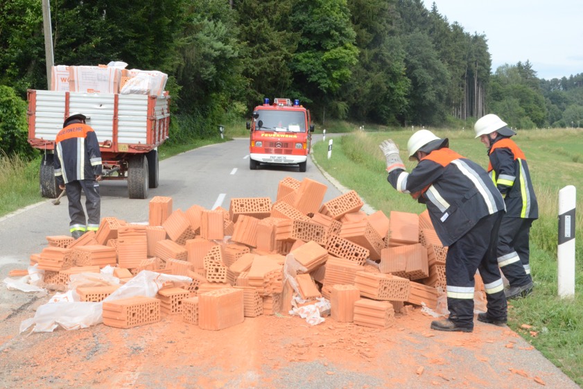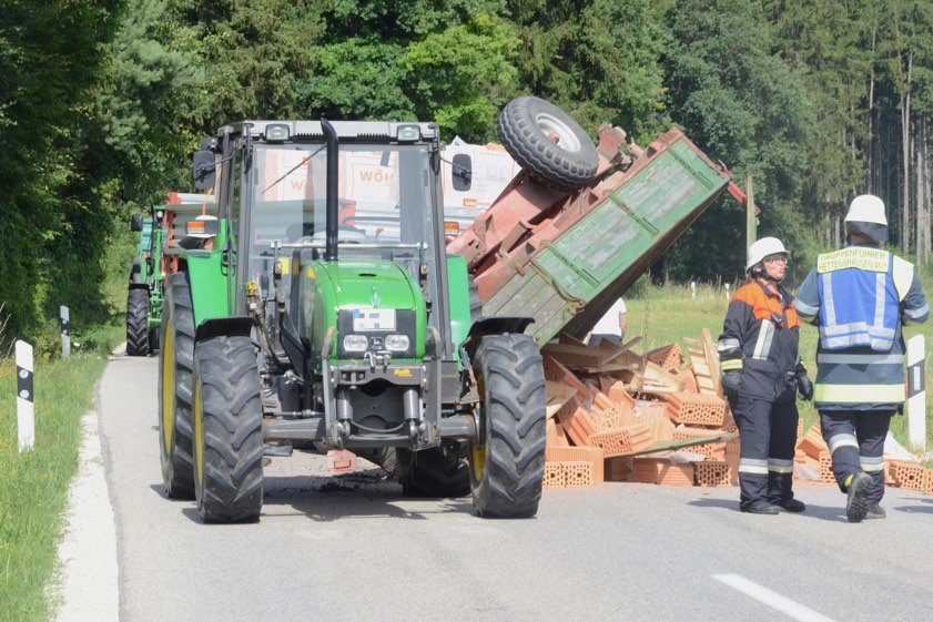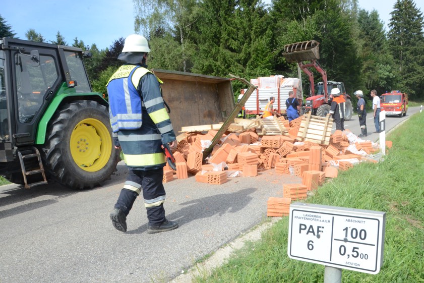 Die Sirene heulte gegen 16.10 Uhr. Die Floriansjünger rückten auf die Kreisstraße PAF 6 aus, wo zwischen Prambach und der Einmündung in die Bundesstraße B 13 das durchaus spektakuläre Unglück geschehen war. Ein junger Mann war mit seinem Traktor samt zwei Anhängern im Schlepptau eigentlich nach Ilmmünster unterwegs, er hatte eine große Menge an Ziegelsteinen geladen. Dann muss es mächtig gescheppert haben.