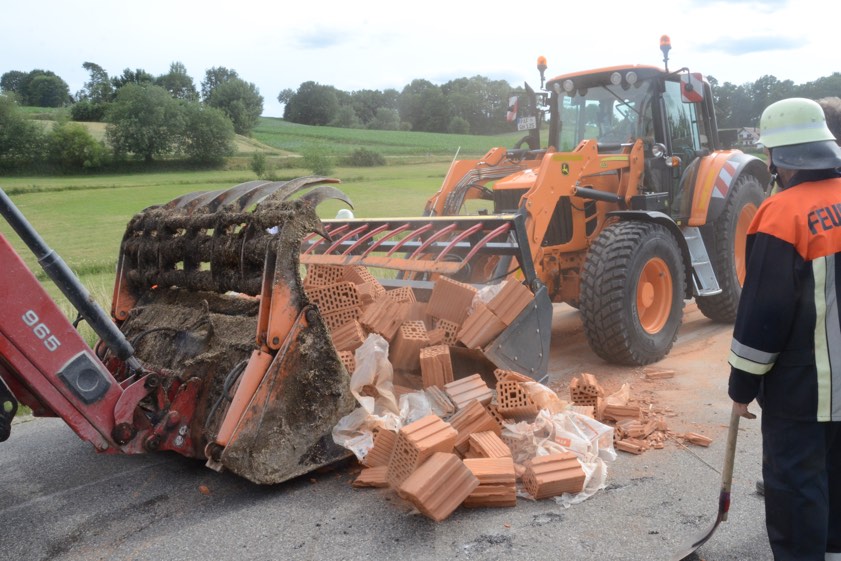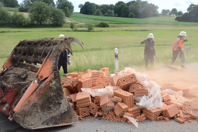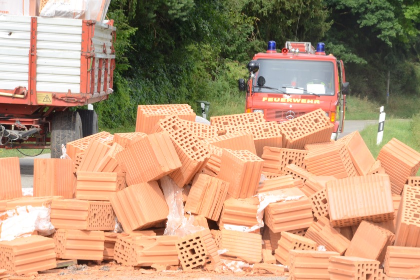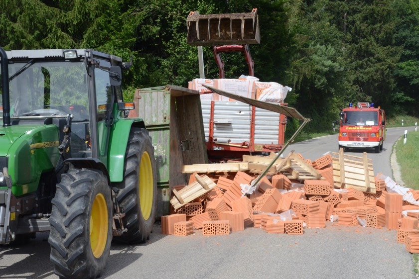 (zel) Das hätte auch schrecklich enden können, doch zum Glück kam in diesem Moment kein Gegenverkehr. Offenbar nach einem Reifenplatzer kippte heute Nachmittag auf der Kreisstraße PAF 6 bei Hettenshausen ein Traktor-Anhänger um und die komplette Ladung – jede Menge Ziegelsteine – verteile sich auf der Fahrbahn. Verletzt wurde zum Glück niemand, die Straße war bis zum Abschluss der aufwändigen Bergungsarbeiten komplett gesperrt.