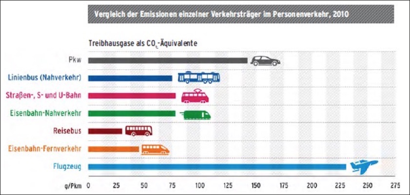 Vergleich der Emissionen einzelner Verkehrsträger im Personenverkehr in Personen-Kilometer (Quelle: Umweltbundesamt, 2012: Daten zum Verkehr www.umweltbundesamt.de/publikationen/daten-verkehr)