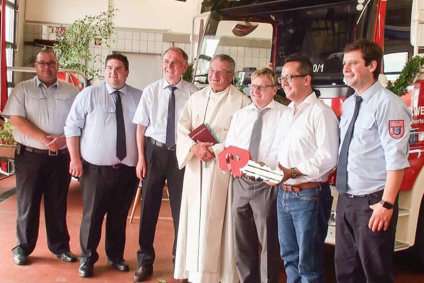 Im Rahmen einer Feierstunde ist im Feuerwehrhaus die neue Drehleiter ebenso gesegnet worden wie ein Flachwasser-Schubboot.