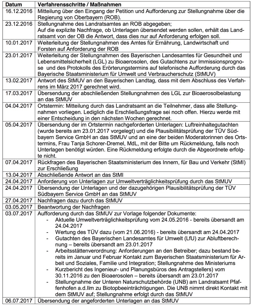 Außerdem, so stellt man in einer Pressemitteilung klar, „wurden alle Anfragen des Landtags in Sachen Petition fristgemäß und zeitnah beantwortet und die angeforderten Unterlagen teilweise mehrfach auf dem Dienstweg vorgelegt“. Dies gelte auch für die Umweltverträglichkeits-Prüfung, das Luftreinhalte-Gutachten und die Plausibilitäts-Prüfung der TÜV-Südbayern-Service-GmbH als Sachverständige. „Der Aufforderung, Unterlagen vorzulegen, wurde zeitnah und vollumfänglich entsprochen“, versichert man aus dem Landratsamt und legt zugleich eine Übersicht über die Verfahrensschritte vor (siehe unten). Wiederholt habe man zudem angeboten, auf Wunsch weitere Unterlagen vorzulegen sowie Fragen zu beantworten. „Wir haben uns zu jeder Zeit korrekt verhalten“, lautet Westners Fazit.