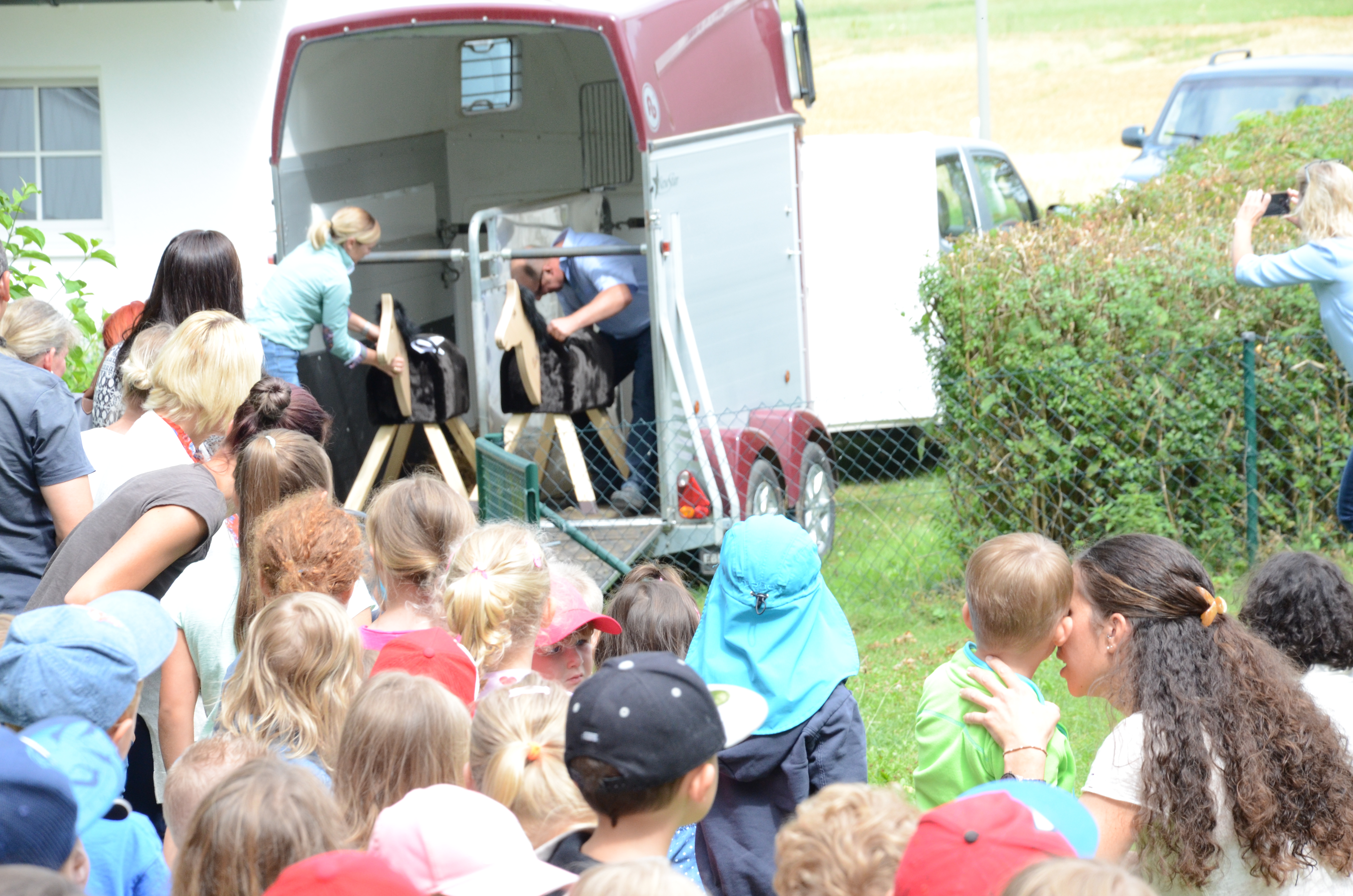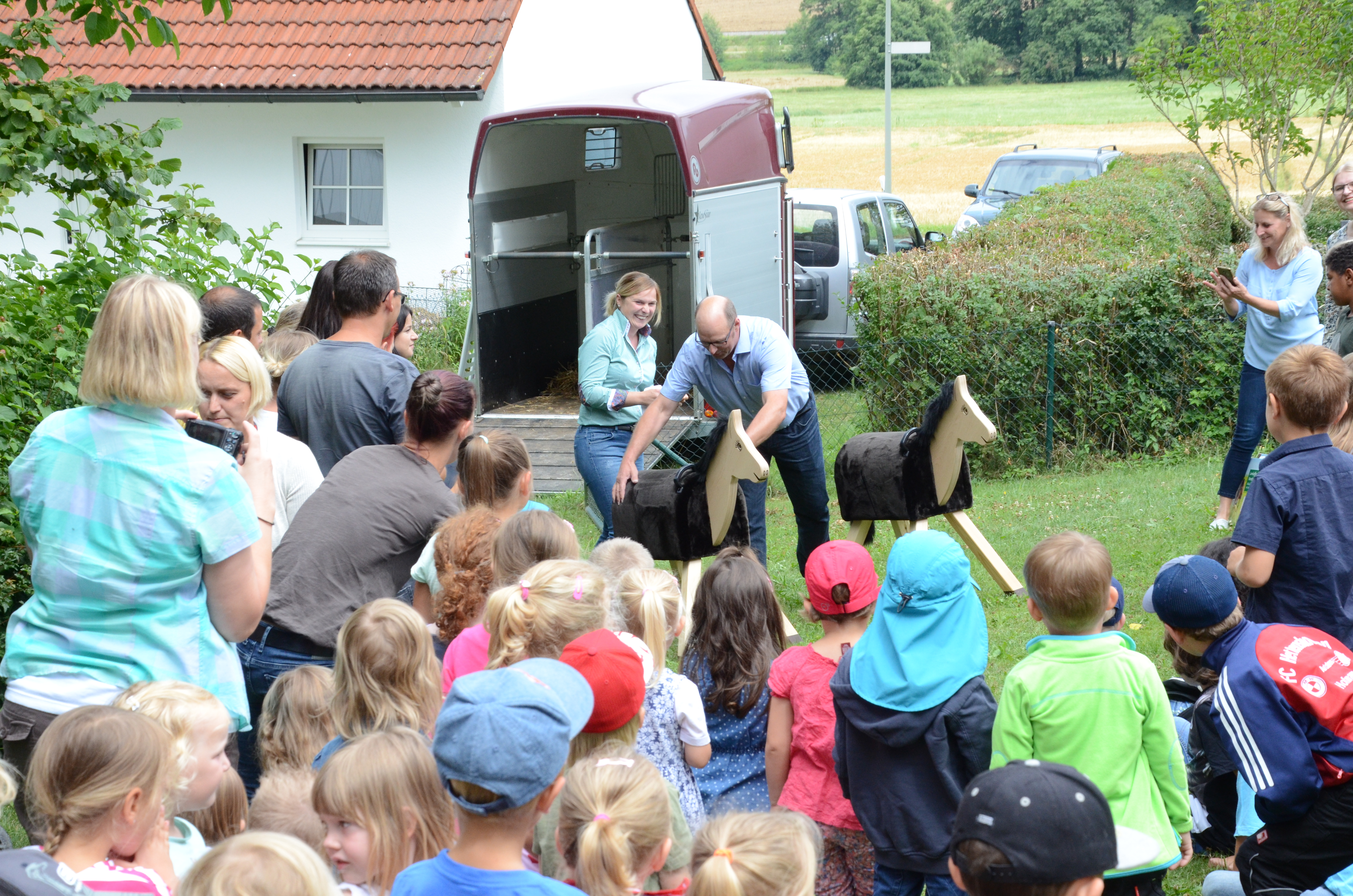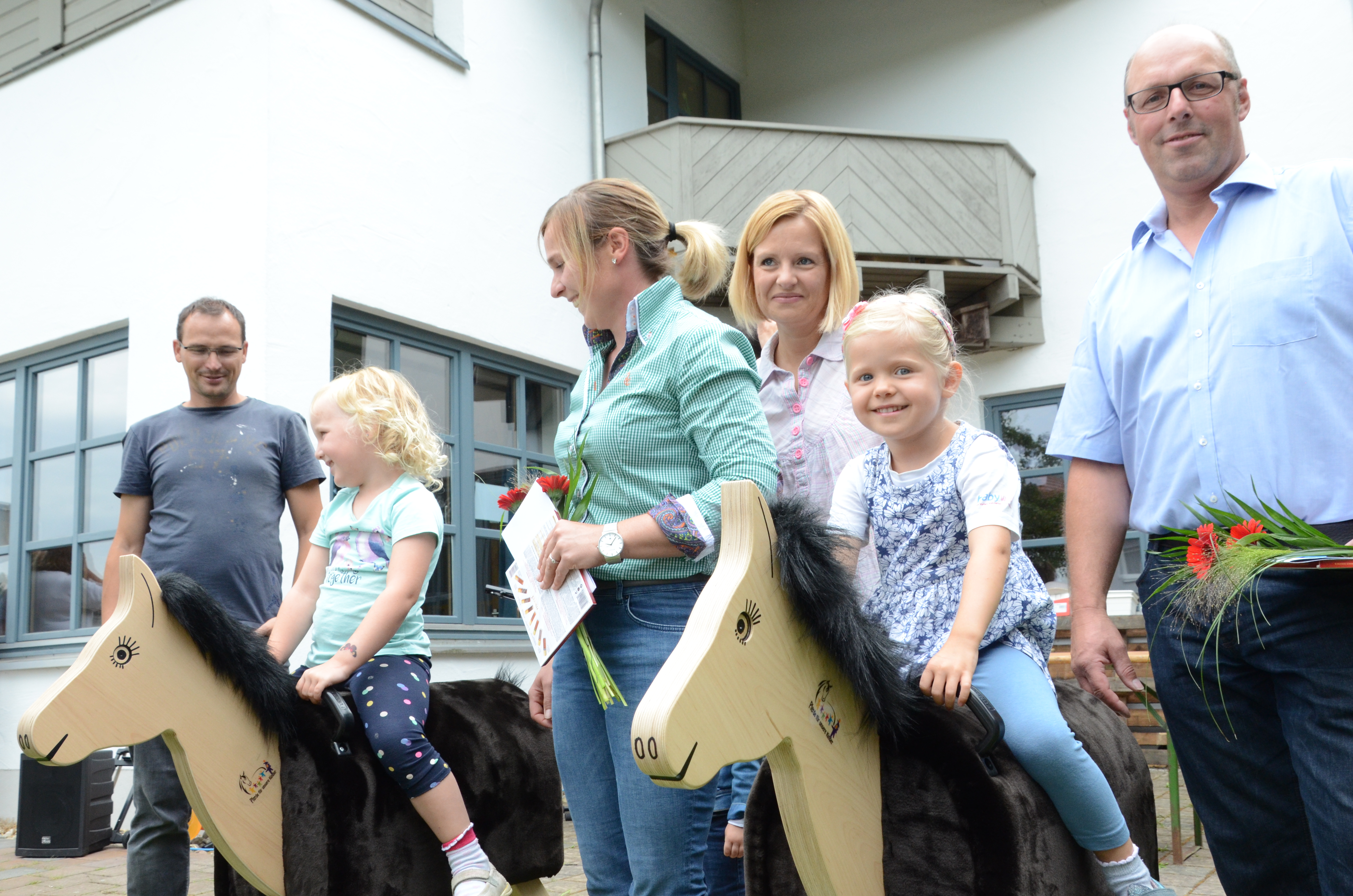 (zel) Eine tierische Überraschung hat es heute Nachmittag für die Buben und Mädchen beim Familienfest im Hettenshausener Kindergarten gegeben. Aus einem Anhänger luden Anna Breitner-Weber und Wolfgang Hagl zwei stattliche Holzpferde. Und die waren nicht nur als Attraktion zur Feier des Tages gedacht, sondern bleiben dem Kindergarten dauerhaft erhalten. Sie sind nämlich ein Geschenk der beiden Familien, die selbst jeweils einen Pferdehof in der Gemeinde betreiben.