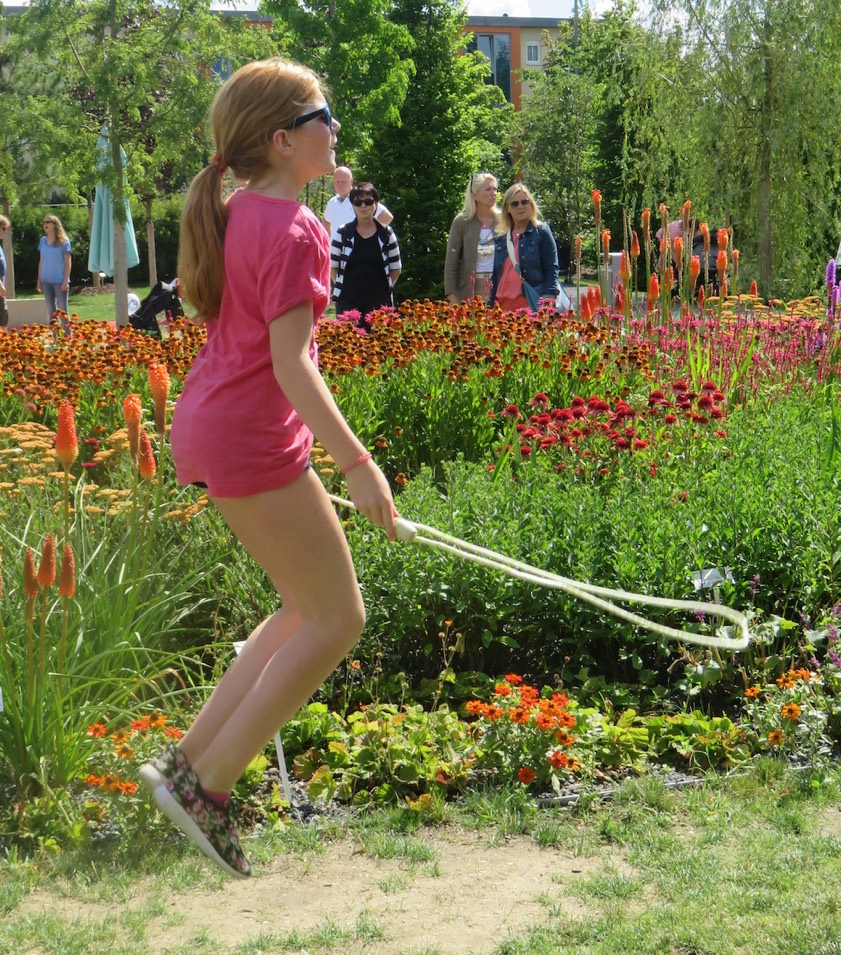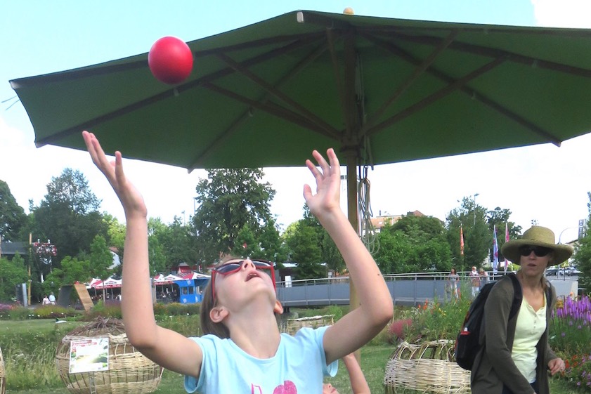 Wenn man die strahlenden Gesichter der Mädchen und Buben als Maßstab nimmt, dann hat die Sparkasse mit ihrer Aktion auf der Gartenschau ganz Großes für die Erziehung geleistet. Den ganzen Tag über dicht bevölkert waren die acht Spielstationen: 1. Dodo, die Balancekünstlerin, 2. Didi, der Jongleur, 3. Fetz im Irrgarten, 4. Emmerich geht in die Luft, 5. Ambros, der Ball- und Wurfkünstler, 6. Parcours mit Steuerbert, 7. Gantenkiel, der Akrobat, 8. Brunhold auf Achse.