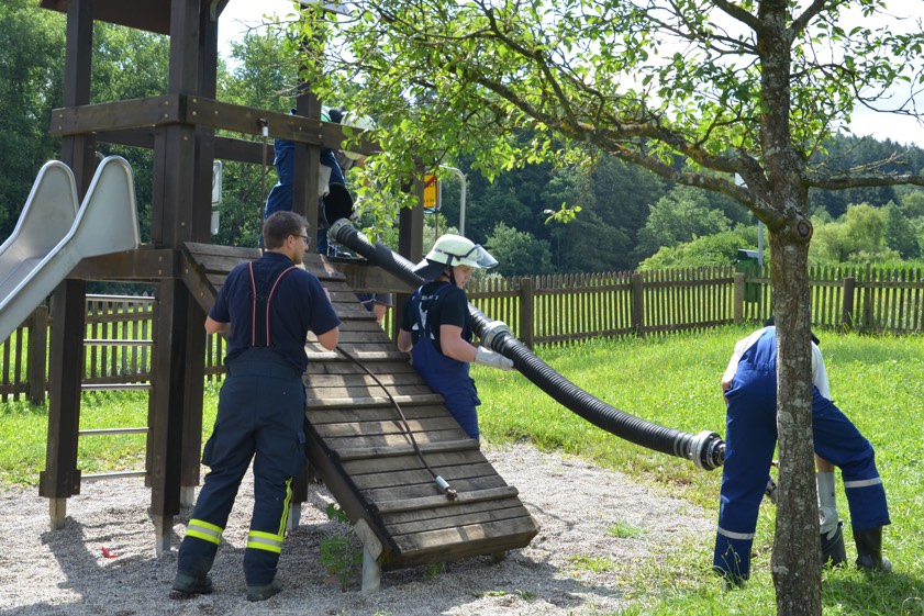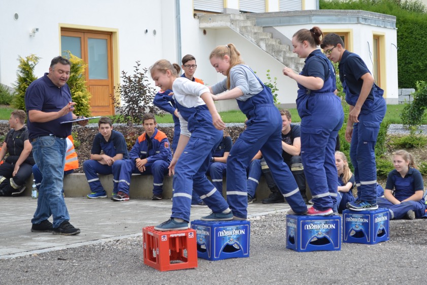 Aufgeteilt in 19 Mannschaften zu je vier Teilnehmern wurden die Jugendlichen mit ihren Betreuern schon am frühen Morgen nach einer kleinen Stärkung von Christian Sirl und Kreisbrandrat Armin Wiesbeck auf den rund 6,2 Kilometer langen Rundkurs durch und um Tegernbach geschickt. „Es galt, einzelne feuerwehrtechnische Aufgaben, wie zum Beispiel das Kuppeln von Saugschläuchen oder das Anlegen von Knoten in einer vorgegebenen Zeit zu erledigen“, erklärt Sirl. Aber auch lustige Übungen, wie etwa das Ertasten von Feuerwehr-Gerätschaften mit verbundenen Augen, die rasante Abfahrt mit einer Seifenkiste oder das Zielwerfen mit Leinenbeuteln gehörte zu den Aufgaben.